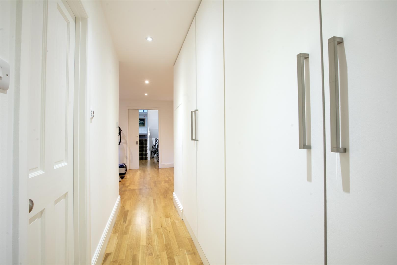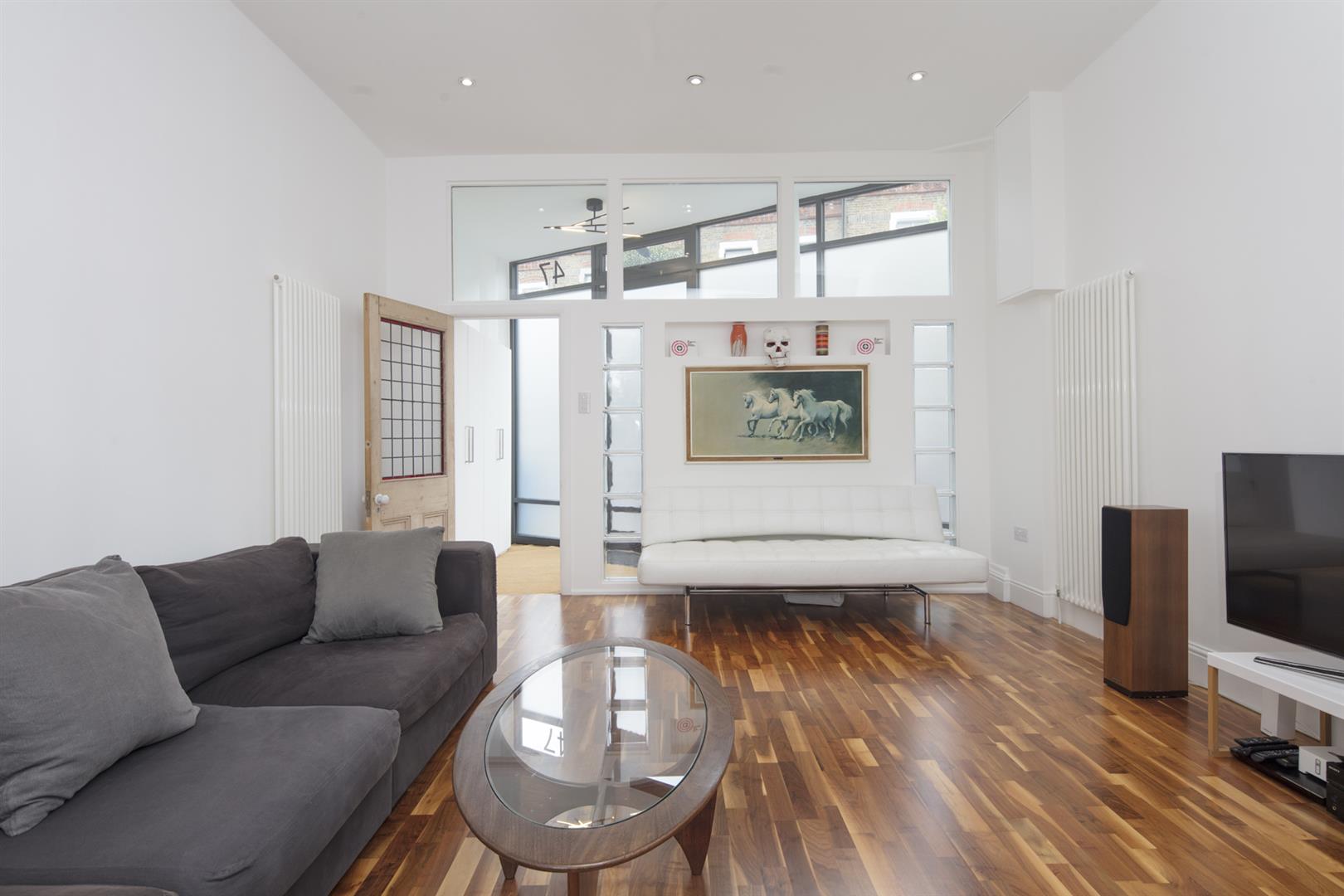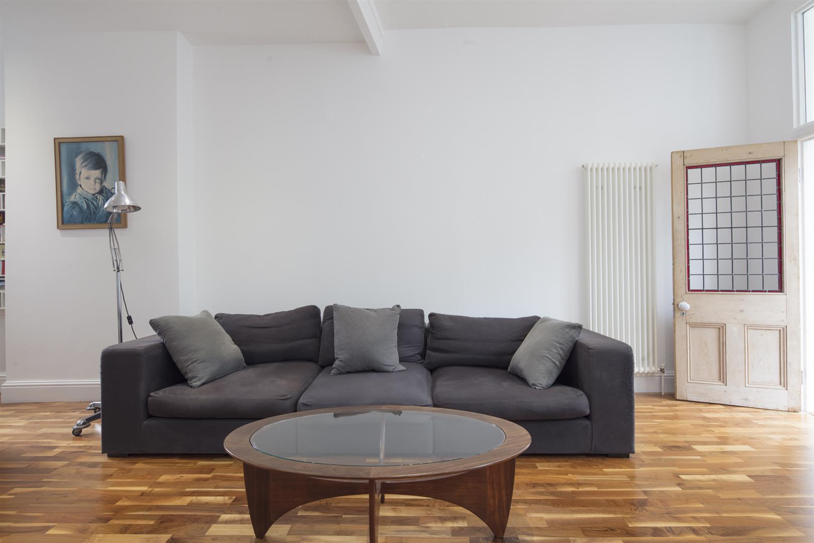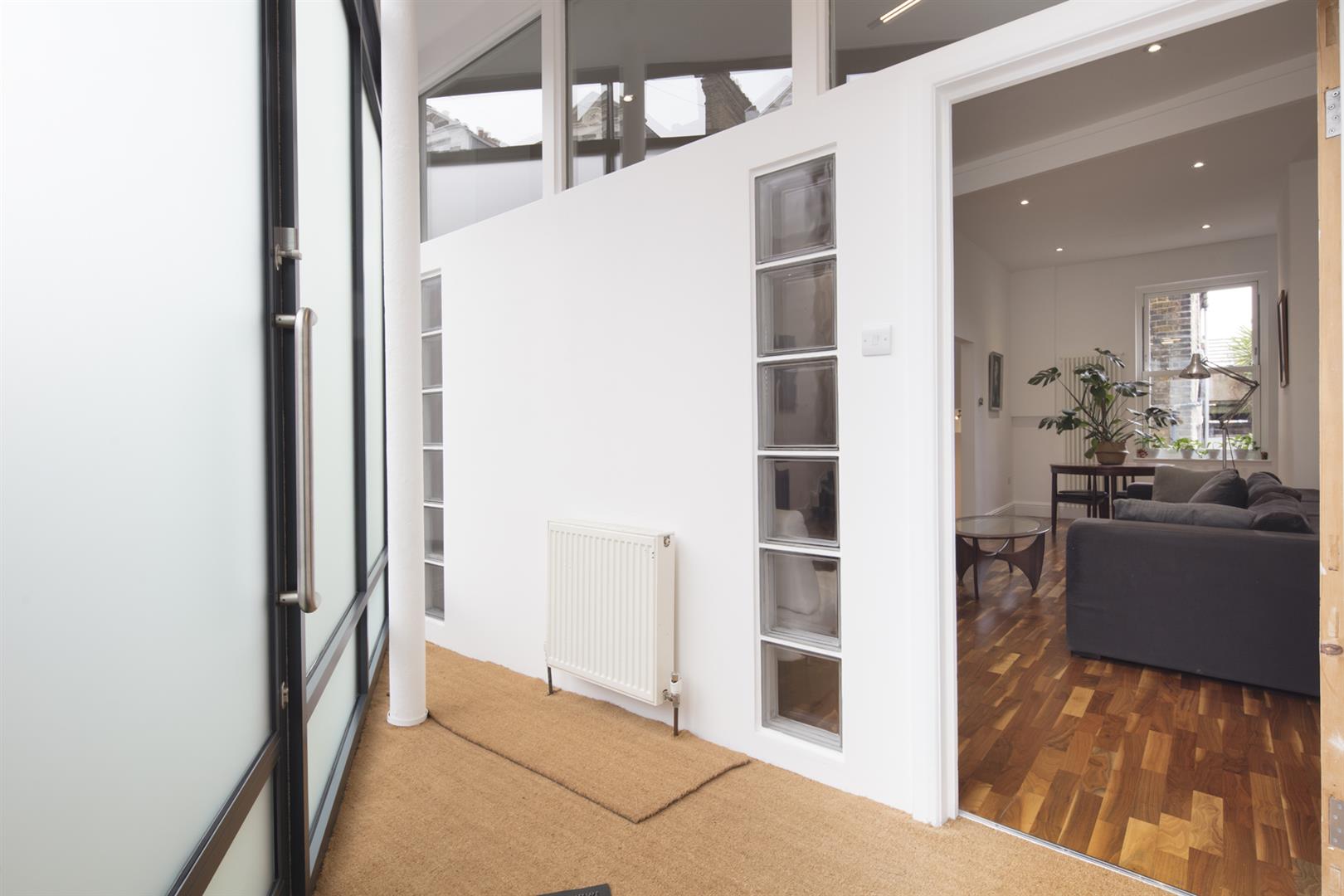 The entrance lobby has huge frosted panes which allow light to cascade inward. There's generous and funkily presented storage on the right hand wall and plenty of space for coats, umbrellas and all manner of whatnot. Glass bricks and further overhead windows draw light into the reception, which is accessed through a wooden door with gorgeous lead and stained glass detail. Once inside you'll find a most impressive space both in proportion and finish. Dark walnut flooring runs the full length. Crisp neutral walls enhance the space further and there are oblong school house style radiators for a contemporary feel. The ceilings are notably high with dimmer controlled spot lighting for mood setting. A large sash window to the rear allows for yet more light soakage.