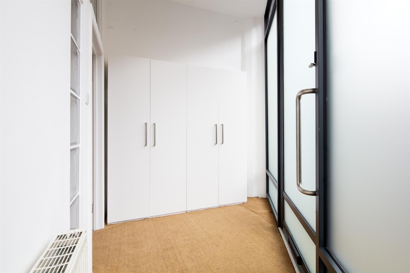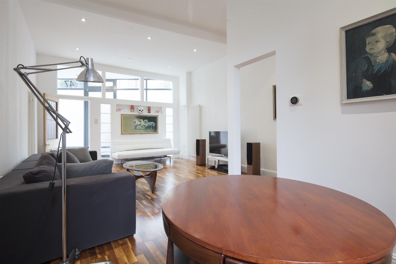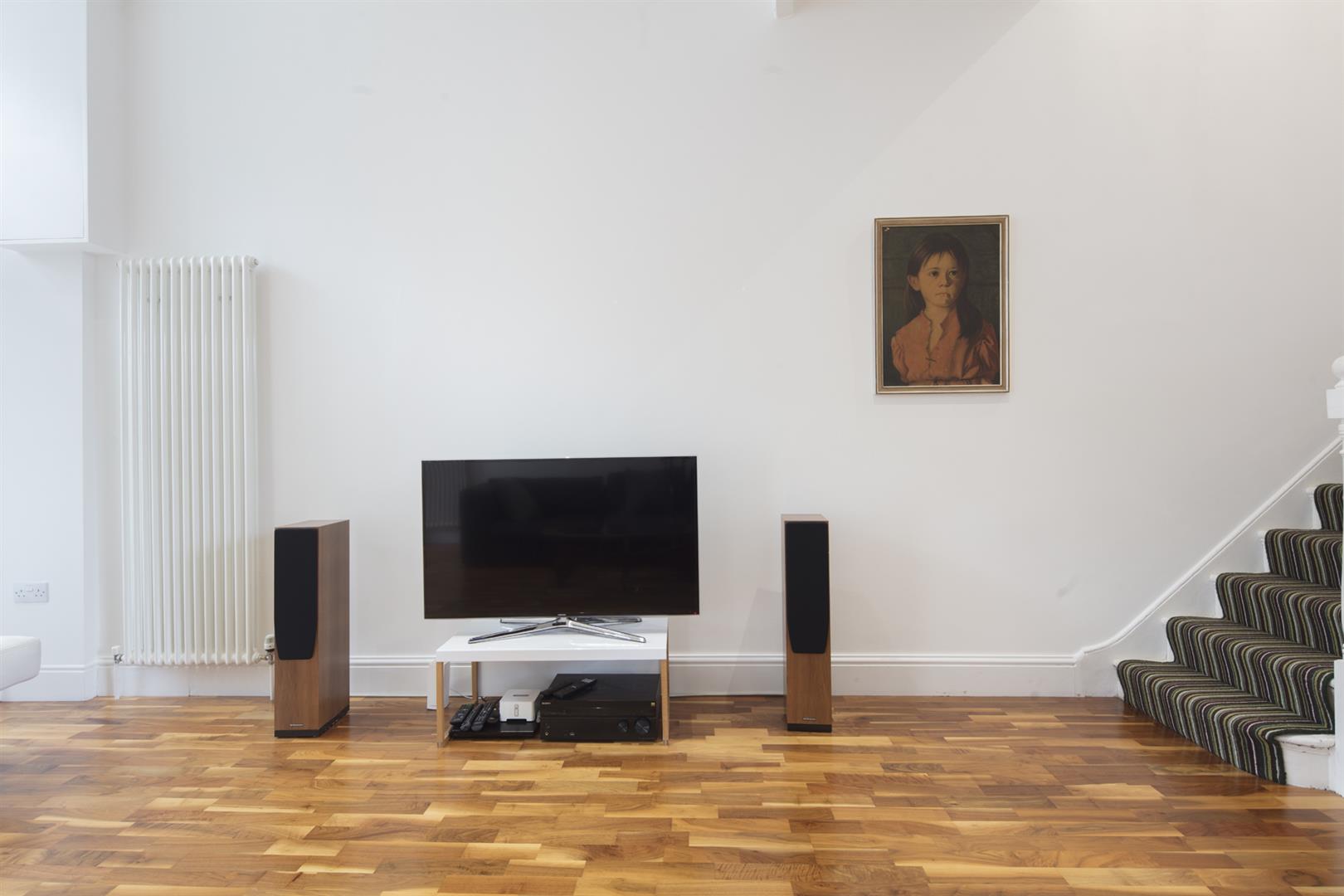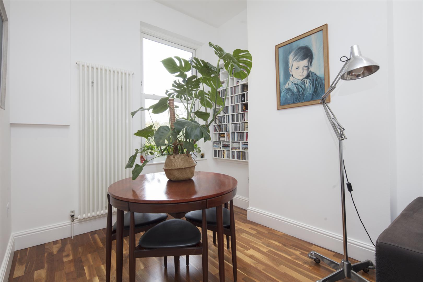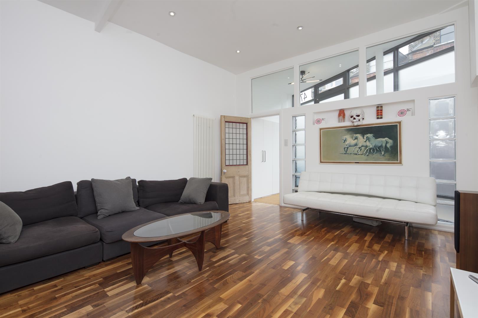 The entrance lobby has huge frosted panes which allow light to cascade inward. There's generous and funkily presented storage on the right hand wall and plenty of space for coats, umbrellas and all manner of whatnot. Glass bricks and further overhead windows draw light into the reception, which is accessed through a wooden door with gorgeous lead and stained glass detail. Once inside you'll find a most impressive space both in proportion and finish. Dark walnut flooring runs the full length. Crisp neutral walls enhance the space further and there are oblong school house style radiators for a contemporary feel. The ceilings are notably high with dimmer controlled spot lighting for mood setting. A large sash window to the rear allows for yet more light soakage.