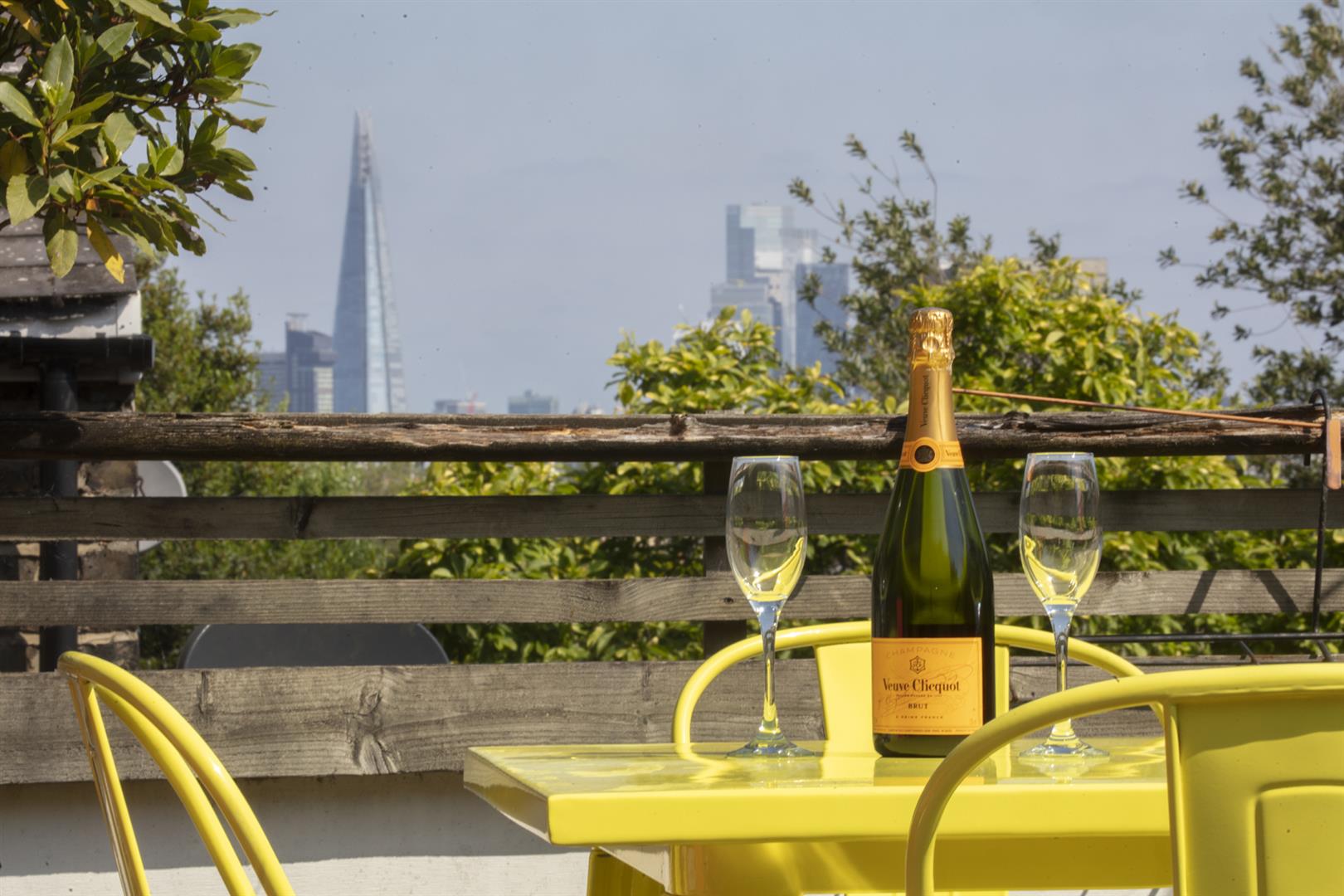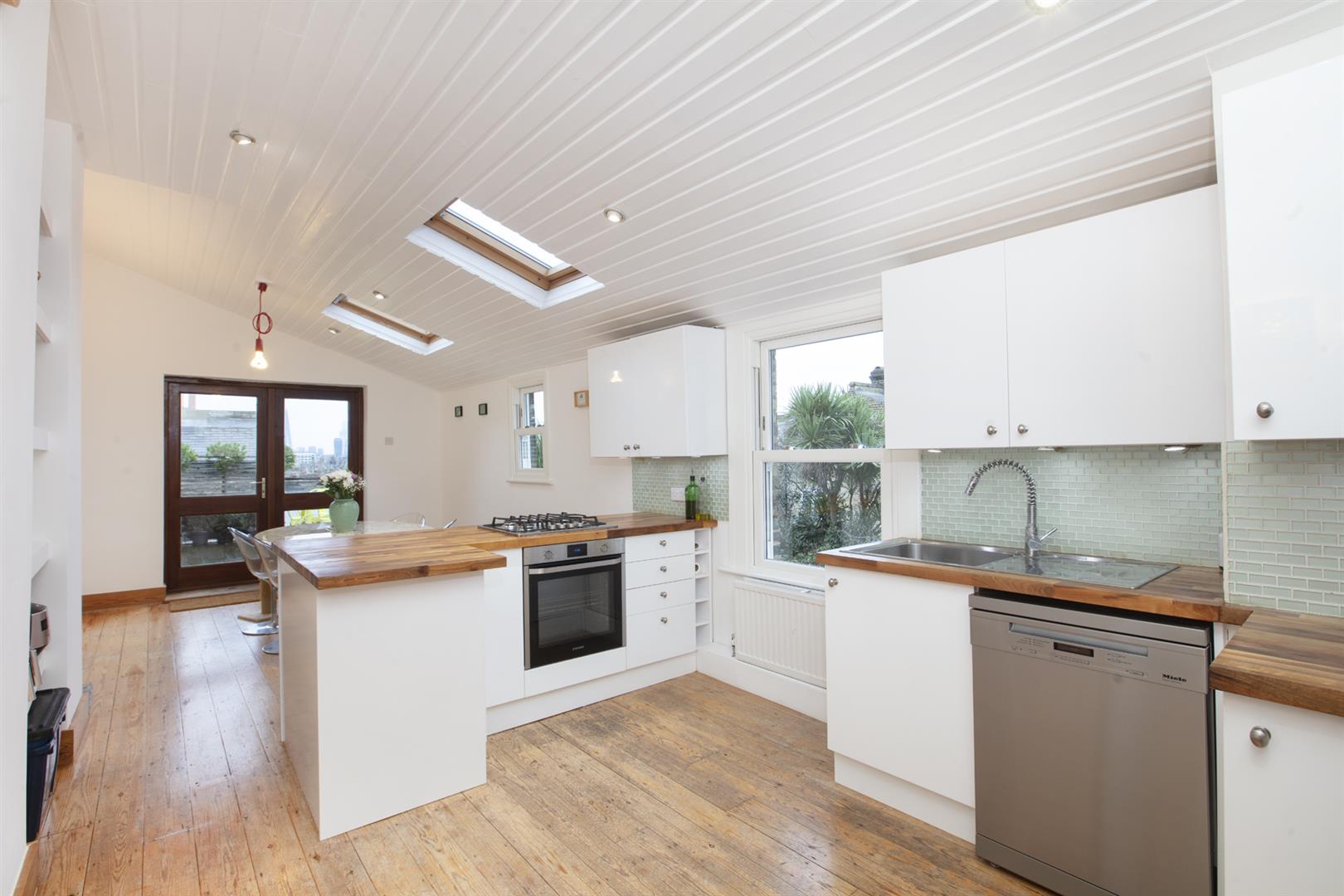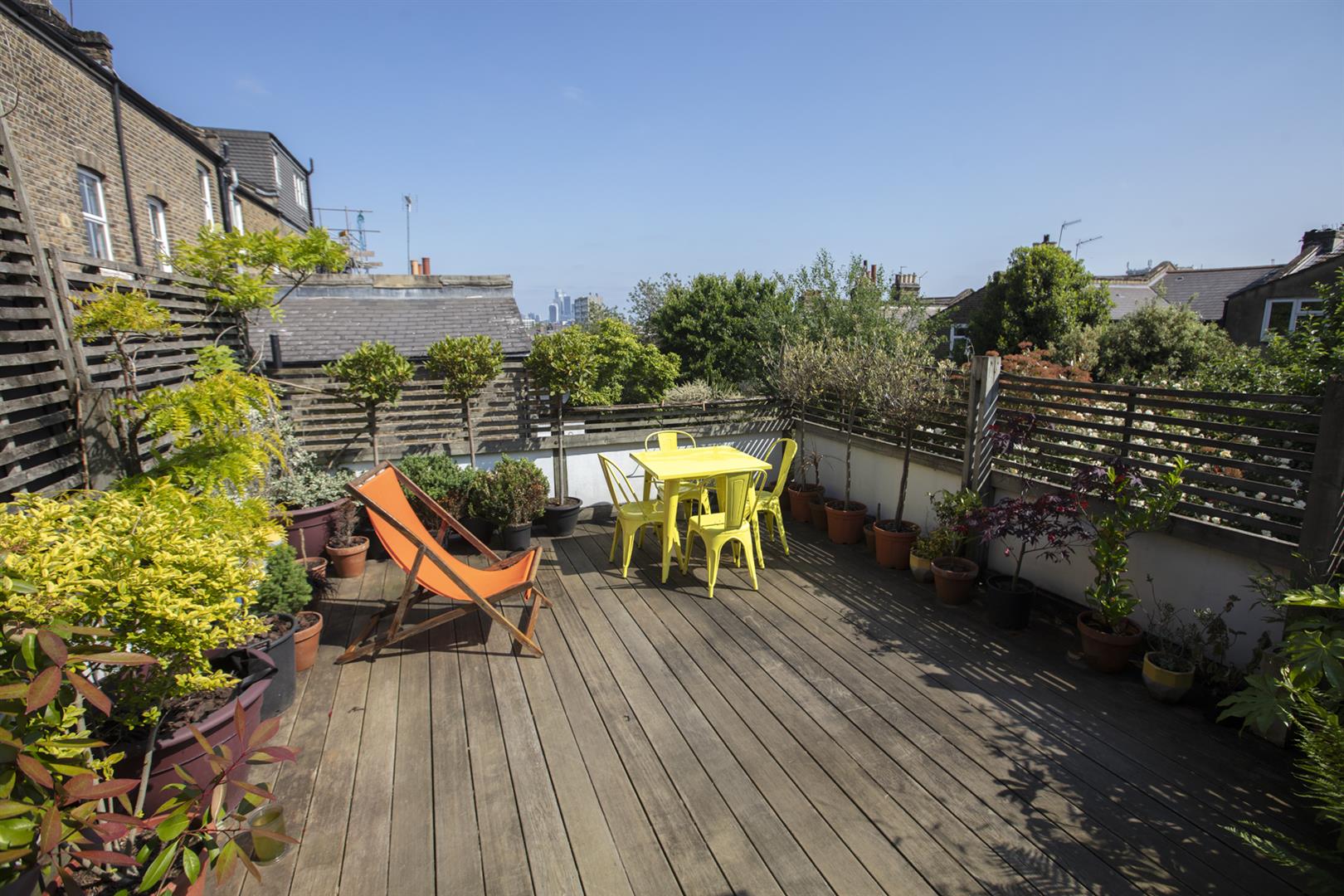 From the rear of the reception you ascend a half flight to find an unbeatably bright and generous kitchen/diner confidently stretching down the return. Solid wooden flooring and chunky walnut counters set a tasteful tone, as do simple high gloss cabinets. Light gushes in from all directions with two windows to the side, two overhead and yet more French doors which lead to the roof terrace. Venturing outside presents you with the first of those marvellous cityscapes. The terrace is decked, large and party perfect.