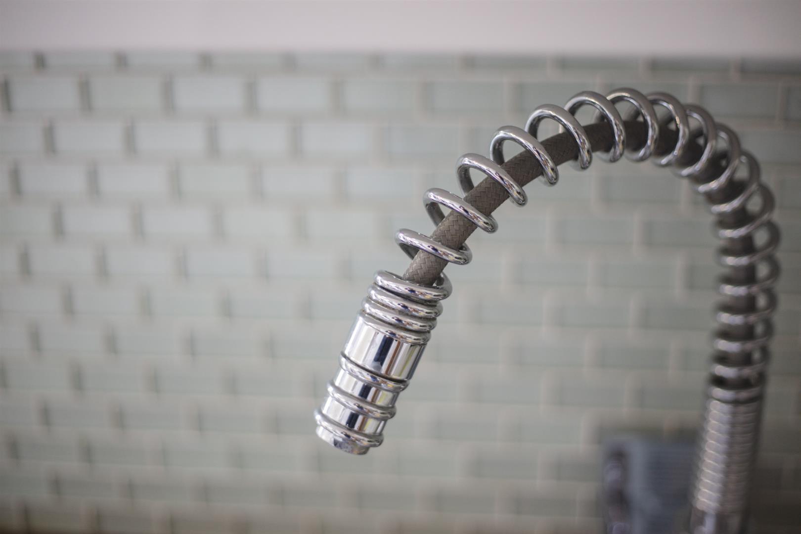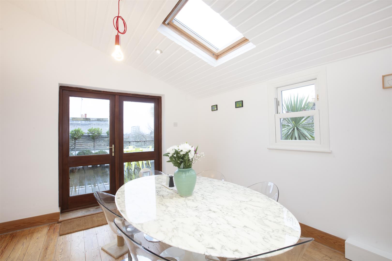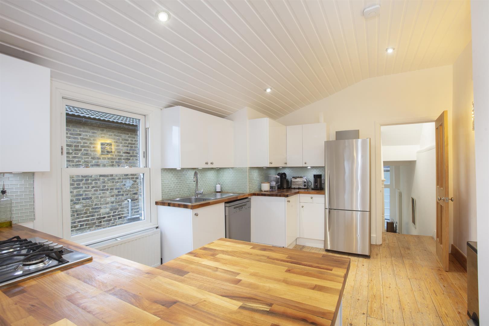 From the rear of the reception you ascend a half flight to find an unbeatably bright and generous kitchen/diner confidently stretching down the return. Solid wooden flooring and chunky walnut counters set a tasteful tone, as do simple high gloss cabinets. Light gushes in from all directions with two windows to the side, two overhead and yet more French doors which lead to the roof terrace. Venturing outside presents you with the first of those marvellous cityscapes. The terrace is decked, large and party perfect.