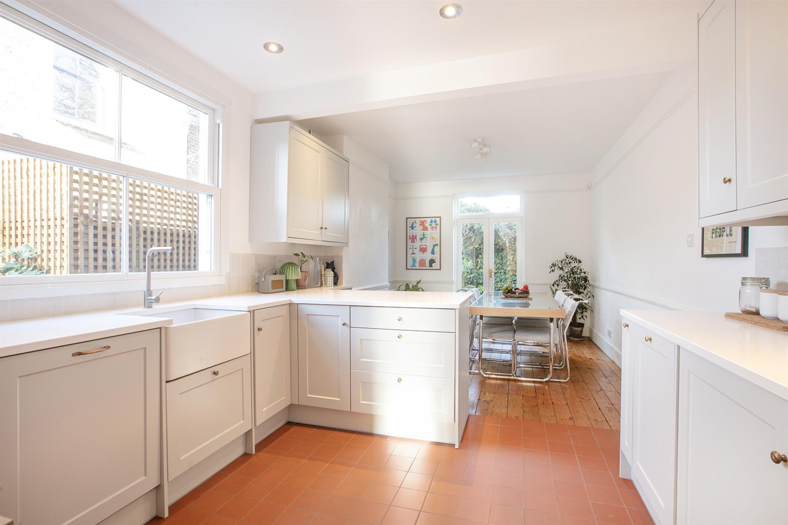 Boasting a semi-detached corner position, the property sits back from the peaceful street behind a mature garden with wrought iron gate and mature tree. As it's a no-through road, you'll enjoy a quiet, low-traffic environment. An arched recessed portico leads you to an exquisite original door with a triptych of mottled glass windows. Inside you meet a welcoming hall with high ceilings and beautifully maintained corbels. The double reception sits to the left and is separated centrally by double original doors. To the front you enjoy a wide, canted bay window with leafy views, a ceiling rose, picture rails and cornicing. The rear room peeks down toward the garden. and both ends of the room have sublime matching period feature fireplaces. You find the kitchen/diner sitting at the end of the hall with plenty of modern cabinetry. There's a six ring gas range, integrated dishwasher, integrated fridge/freezer and washing machine. Quartz counters run gracefully over the breakfast bar which supplies additional dining space. Abundant space for a a large dining table precedes French doors which open to your leafy and pretty rear garden.