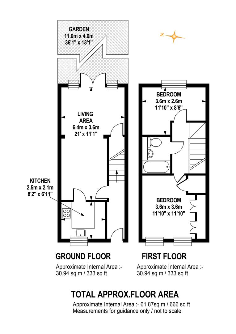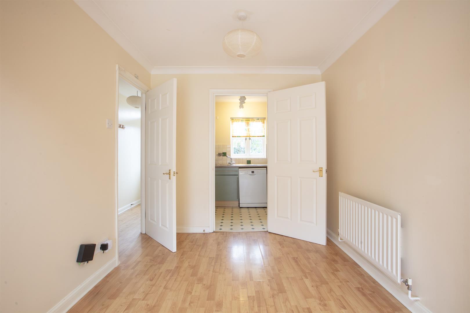 The house sits back from the street behind an off-street parking bay. A neat inner hallway leads onward to a large reception which offers ample dining and lounging space. A well appointed kitchen fronts the street with cabinet and counter space on three sides. Glass doors open rear from the living space to your peaceful and generous rear garden. Upstairs you meet a large front-facing double bedroom which peers toward the park. There's a wall of recessed fitted storage and access to the boiler. A second bedroom faces rear over the garden and there's a well arranged bathroom in between the two rooms, accessed off the landing.