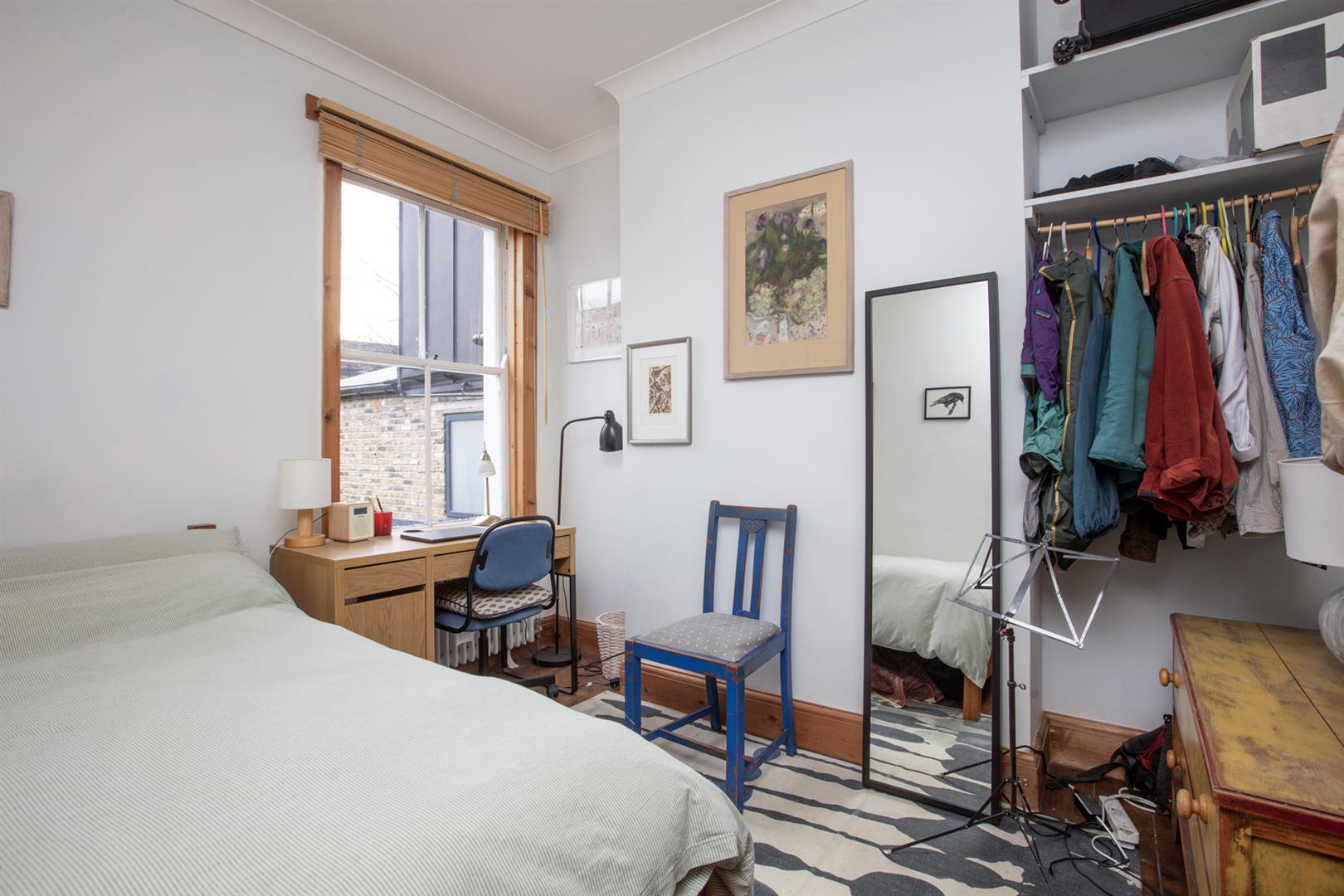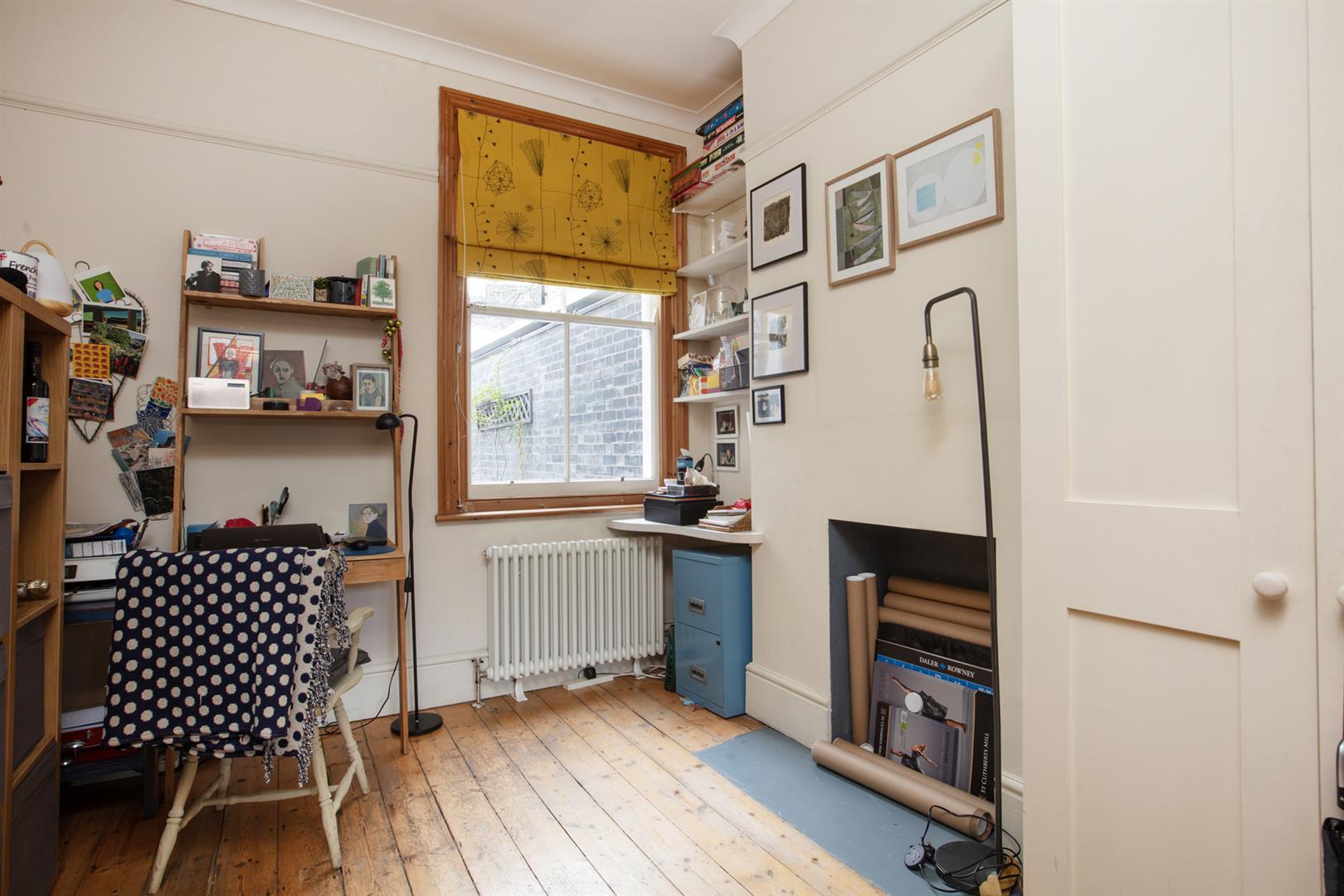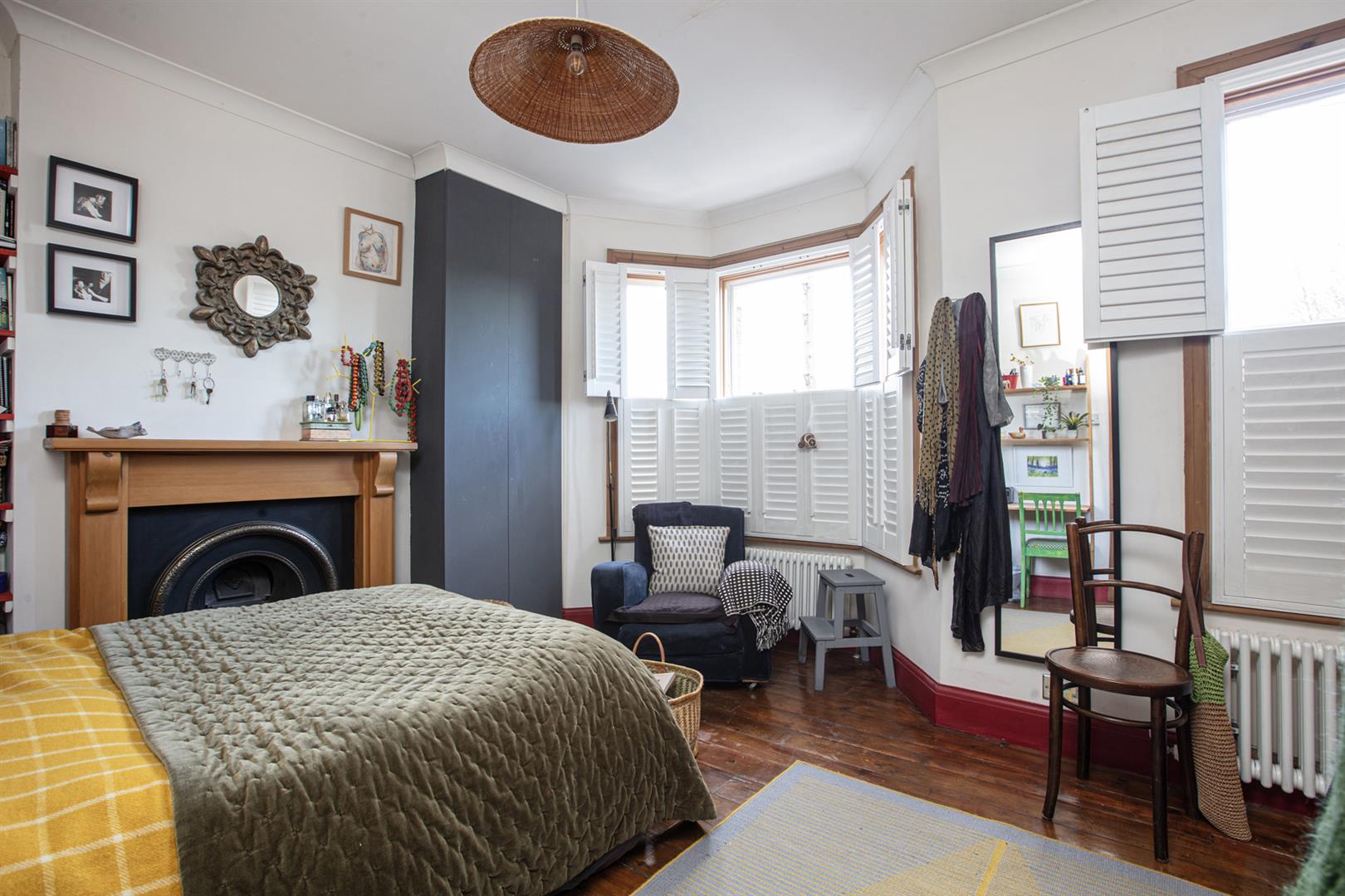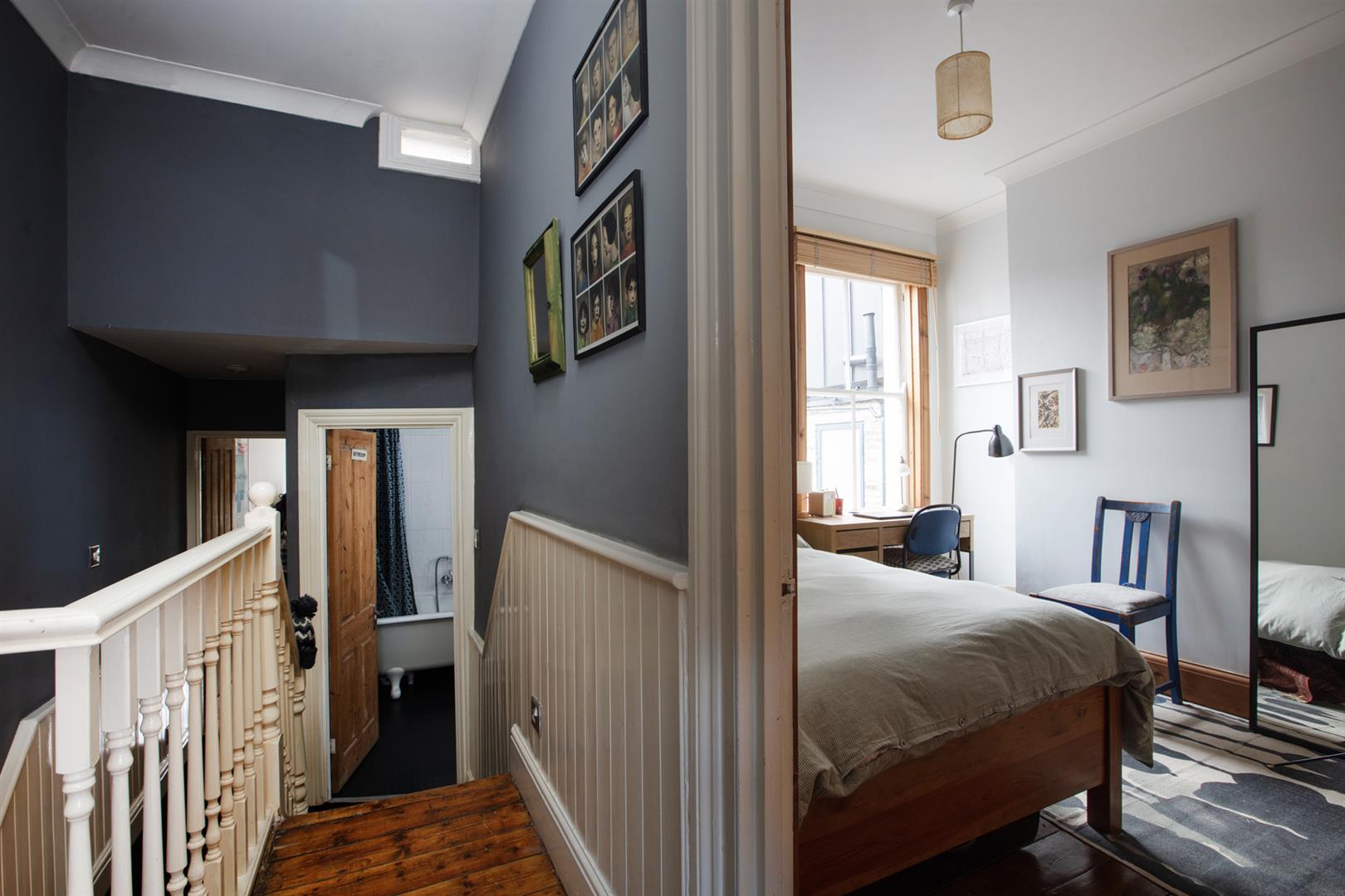 Upstairs to the first return you find the same wooden panelling as below with a generous double bedroom with timber floors and dual aspect facing over the garden. The family bathroom shares this level and has a period-style suite with a roll top bath as well as a modern over-bath shower, heated towel rail and practical embossed flooring. Four steps lead to the front-facing master bedroom which has full plantation shutters on the bay and additional window and a period-style fireplace. Bespoke fitted wardrobe and cupboards provide excellent storage. The third double bedroom has timber flooring and a large sash window facing the garden.