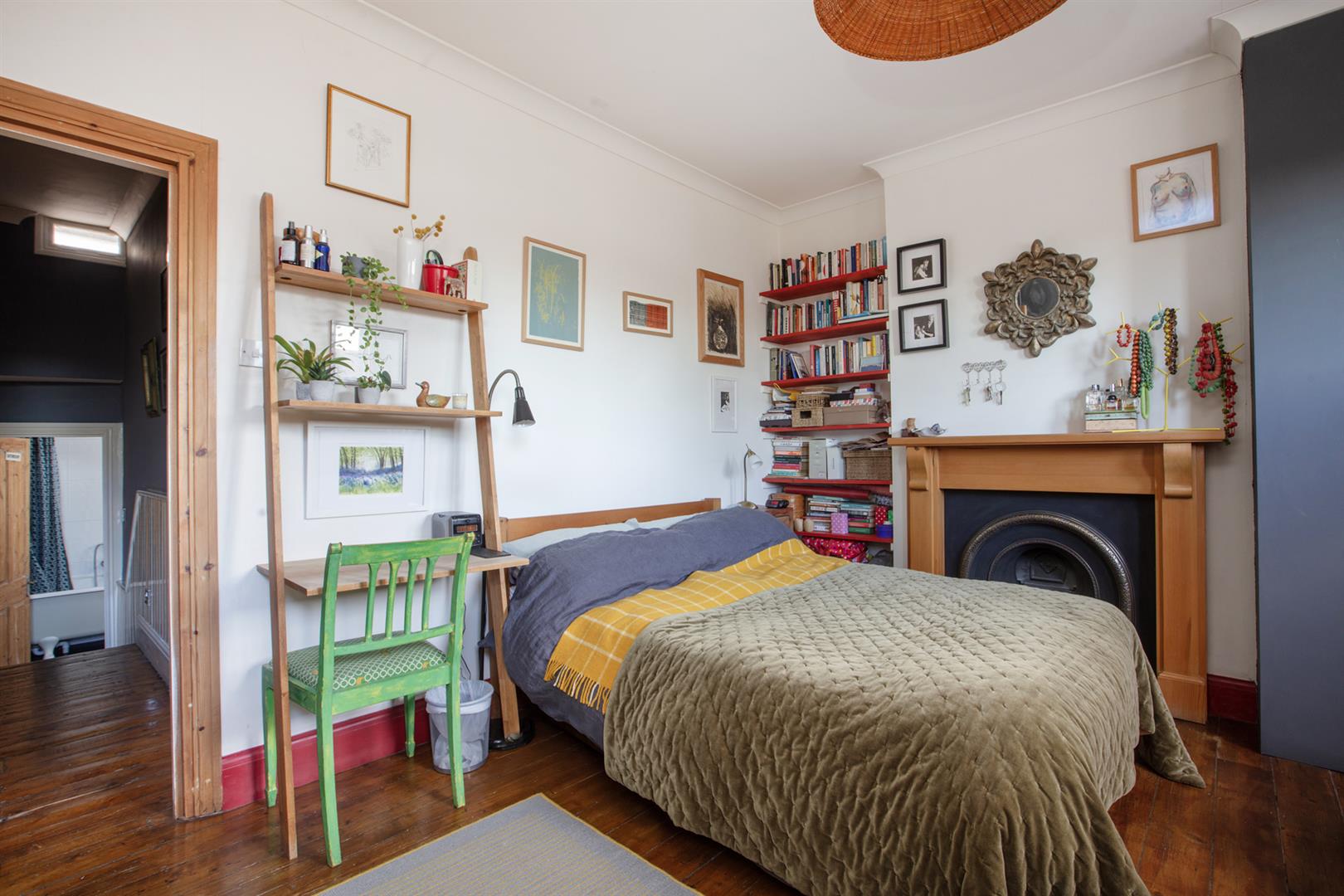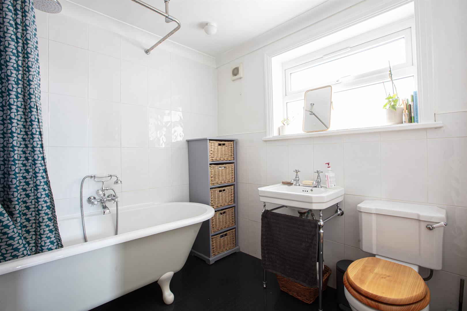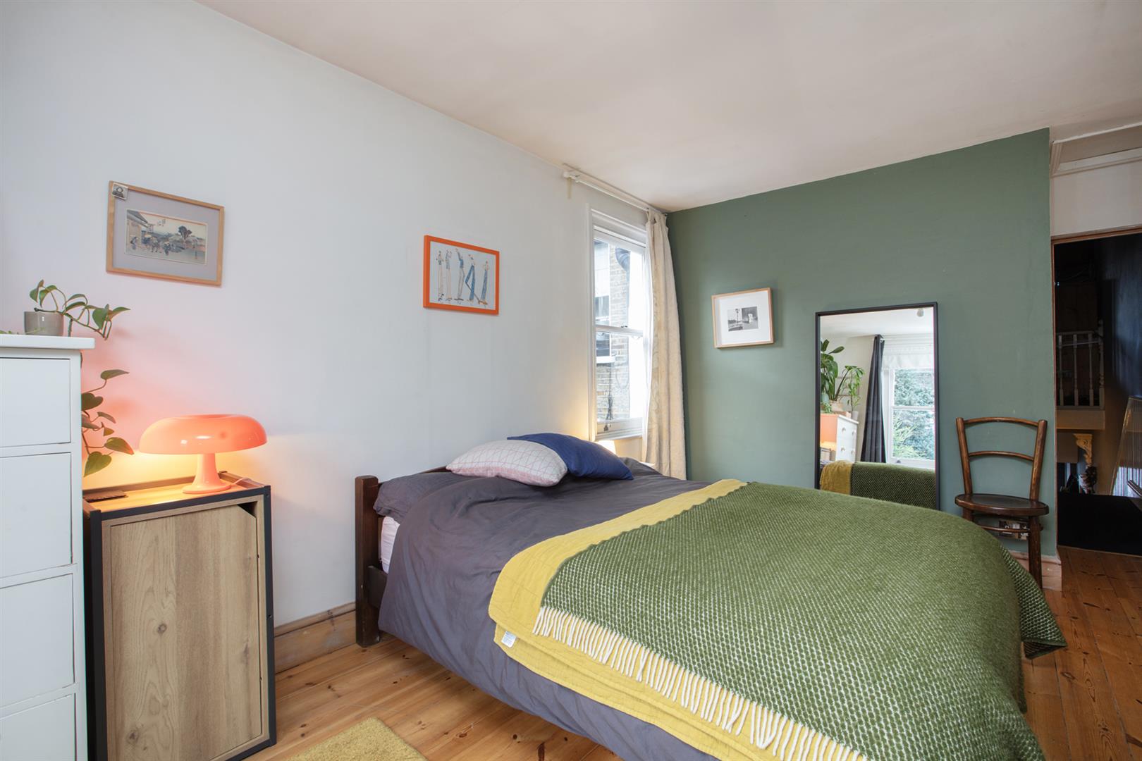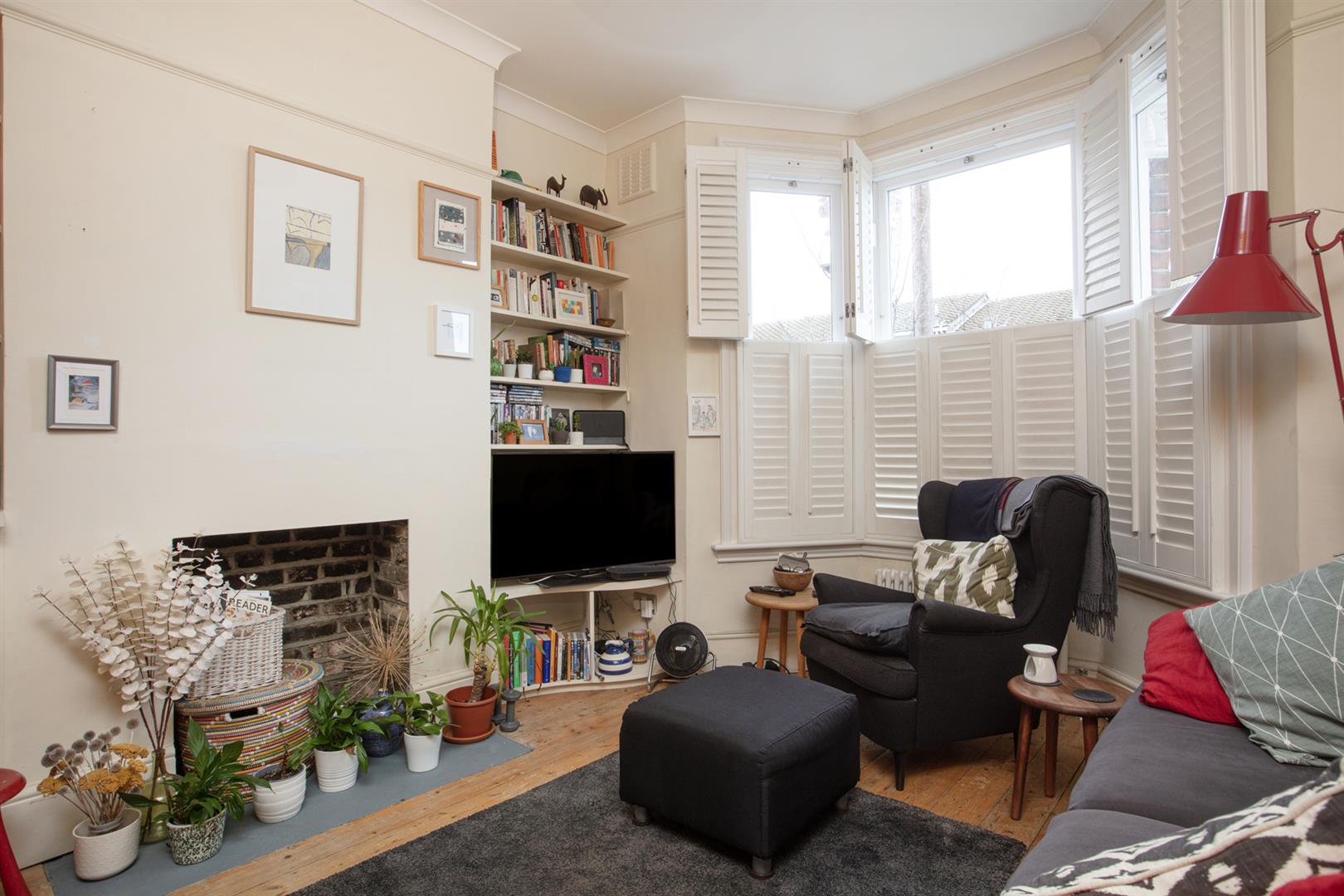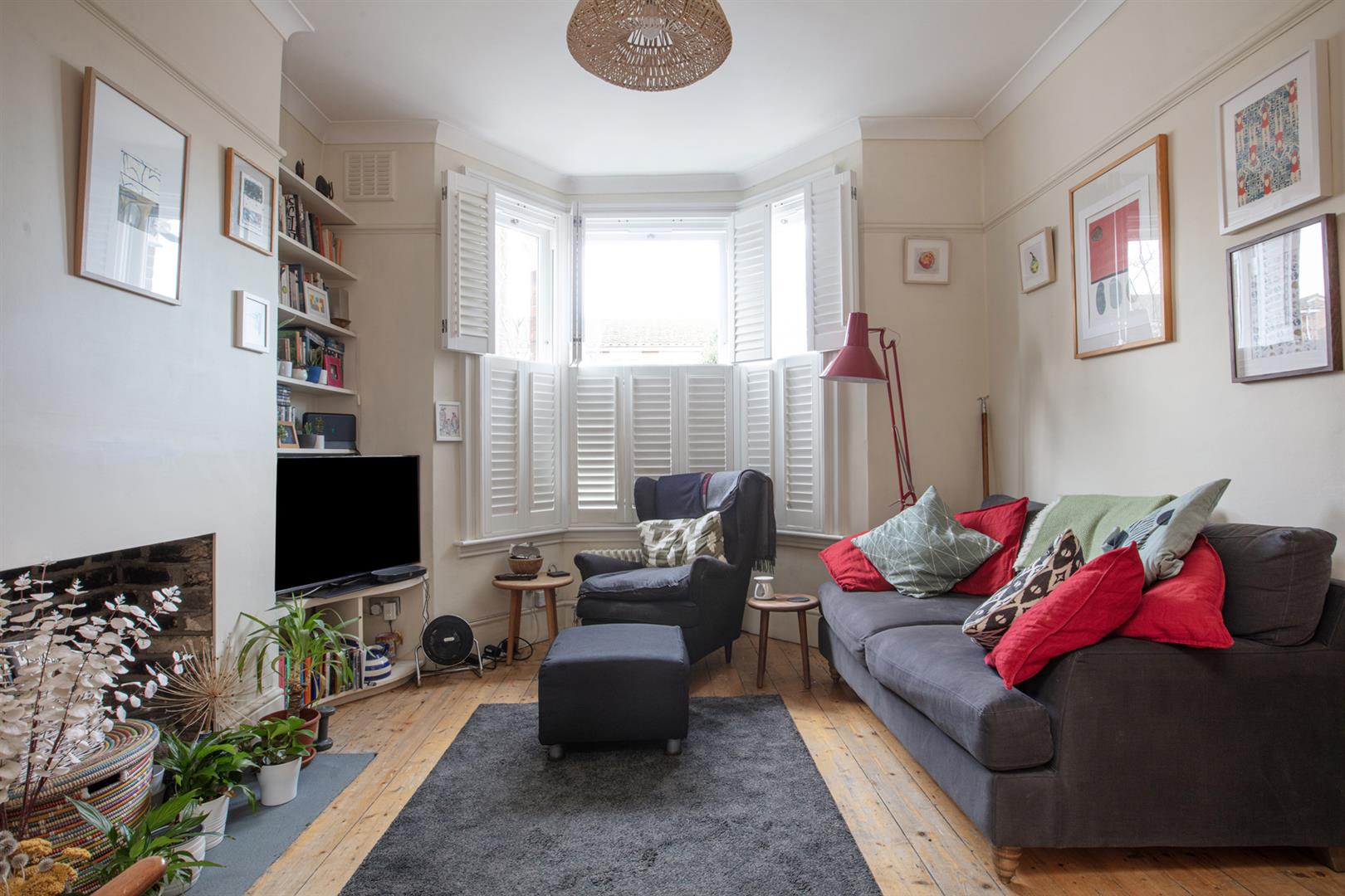Upstairs to the first return you find the same wooden panelling as below with a generous double bedroom with timber floors and dual aspect facing over the garden. The family bathroom shares this level and has a period-style suite with a roll top bath as well as a modern over-bath shower, heated towel rail and practical embossed flooring. Four steps lead to the front-facing master bedroom which has full plantation shutters on the bay and additional window and a period-style fireplace. Bespoke fitted wardrobe and cupboards provide excellent storage. The third double bedroom has timber flooring and a large sash window facing the garden.
