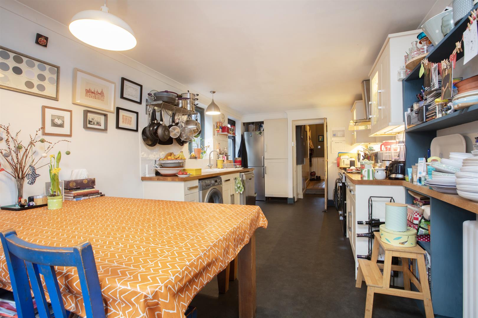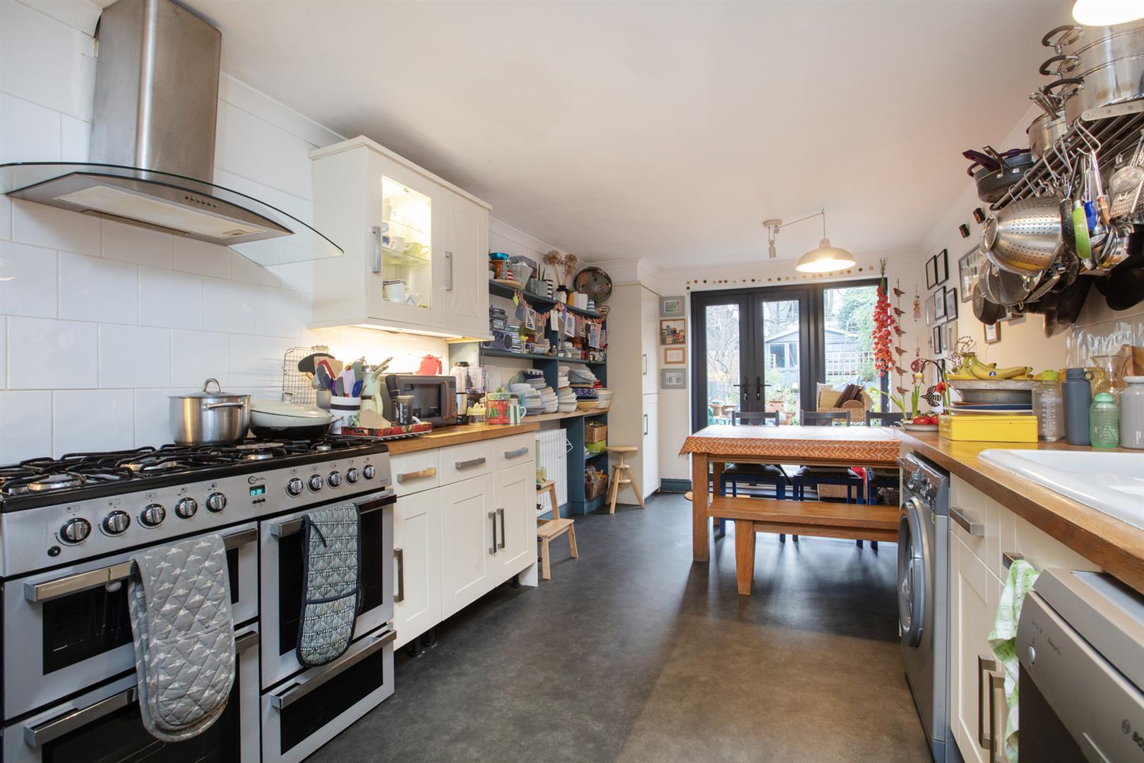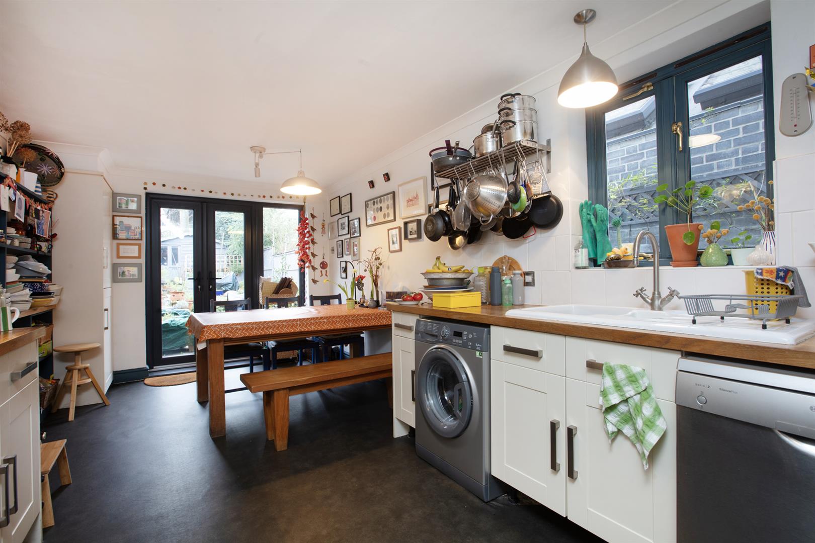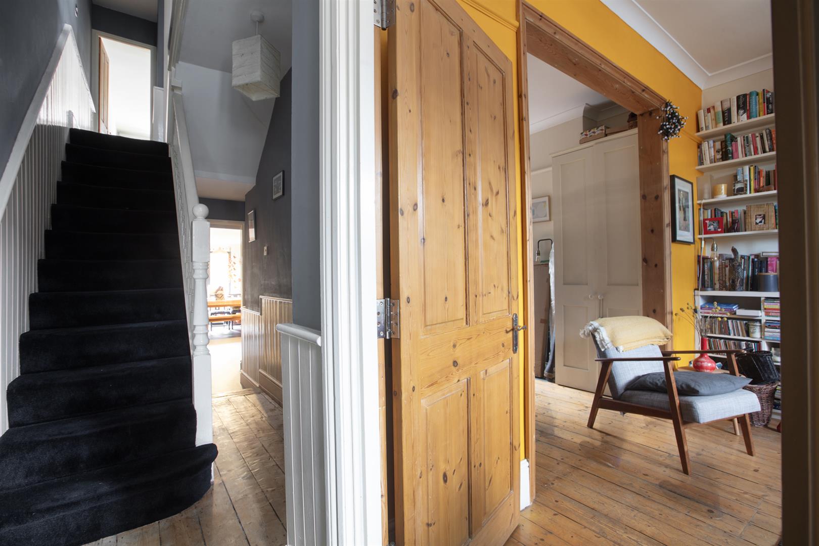The entrance to the house leads to a long hall with original cornicing and corbels, wooden panelling to dado rail level and rich grey walls. A large double reception on your right has original timber flooring, simple coving and an aspect to front and rear. The wide bay has full plantation shutters and the whole space has picture rails. Along the hall with one step down you'll find a guest WC and low-level access to the storage cellar. The kitchen/diner stretches almost 7 metres with fitted shaker-style cabinets, solid wood counters with a ceramic sink and drainer and bespoke fitted shelving. A fantastic dining area leads to French doors which open to the York Stone patio. From here you rise 2 steps to an expansive slate chip area with several raised planting beds. The sheltered South-facing aspect means the outdoor space can be enjoyed all year round. A large watertight garden shed provides excellent storage and has the potential to be developed for leisure use or as a work-from-home space.