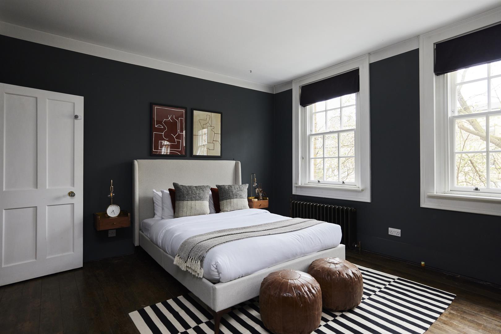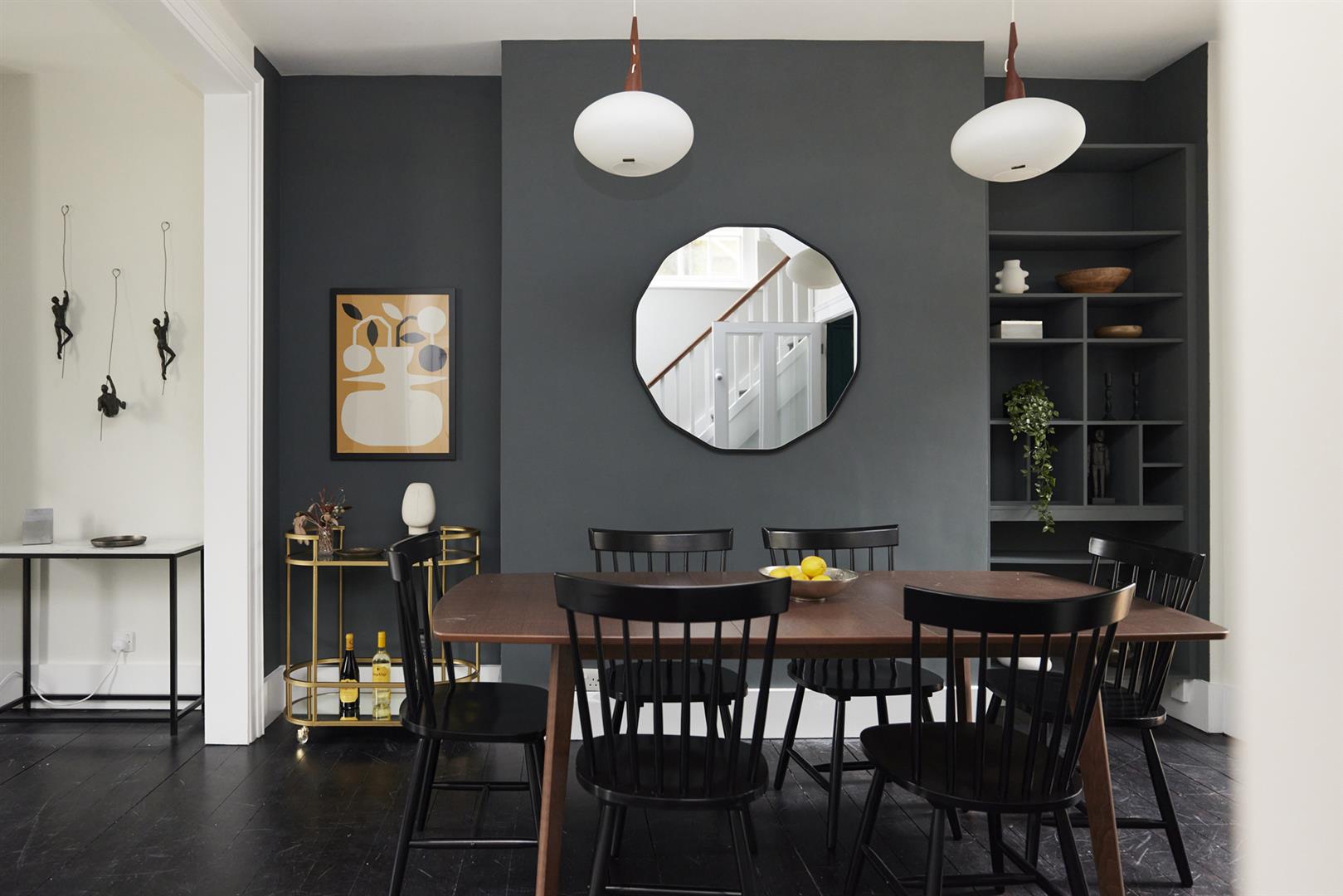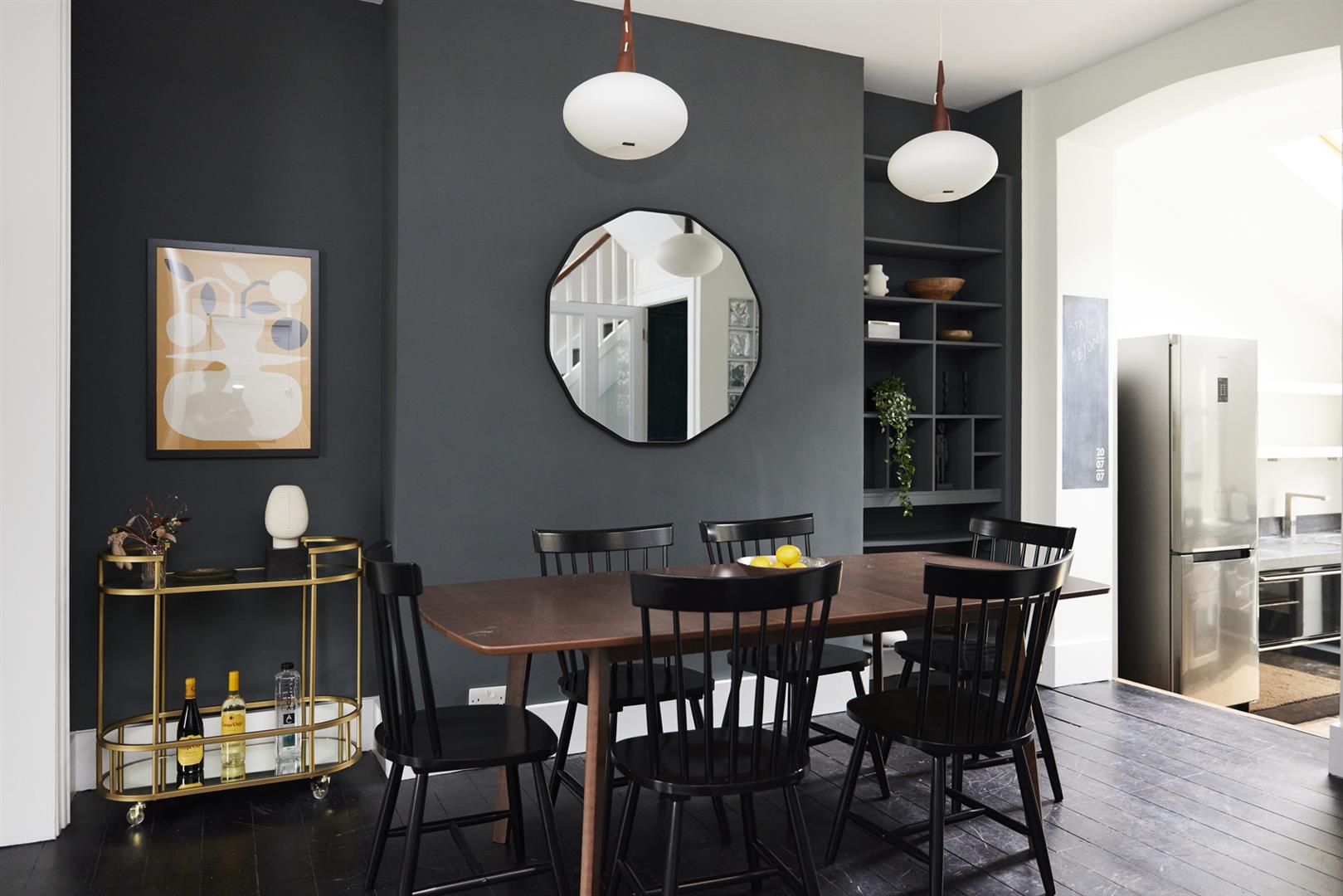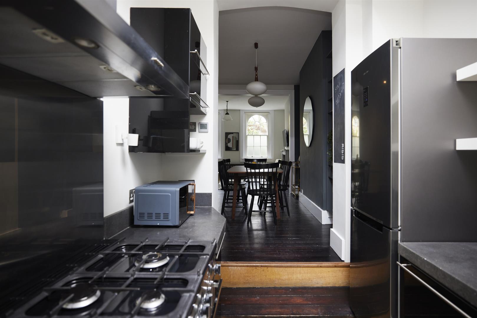 The masterful main bedroom has two front facing wooden sash windows and the double glazing makes it surprisingly peaceful! More rich grey on the walls make for further tastefulness and there are seamless recessed wardrobes. Cast iron radiators throughout the house enhance the look. The upper landing is bright and pleasant with a side aspect sash and study space - a new iMac perhaps? Your second large, front facing double bedroom boasts a wall of fitted wardrobes while the third and final bedroom faces rear with lovely painted floorboards and fitted shelving.
