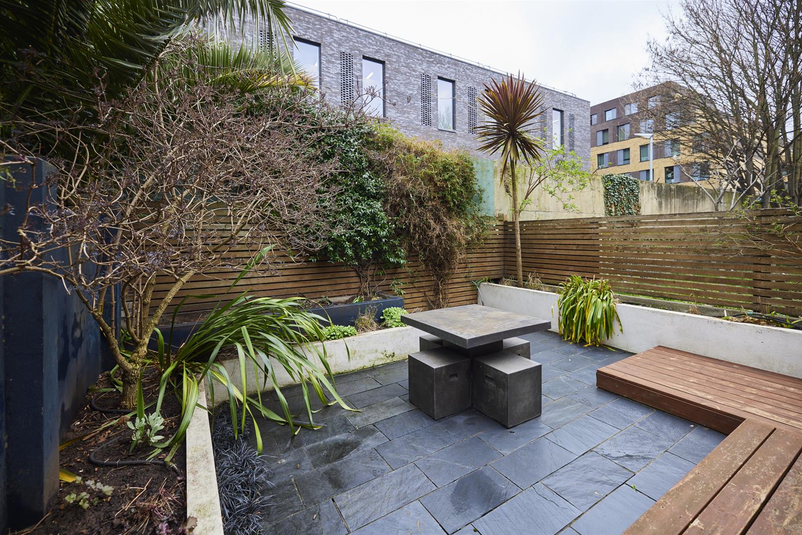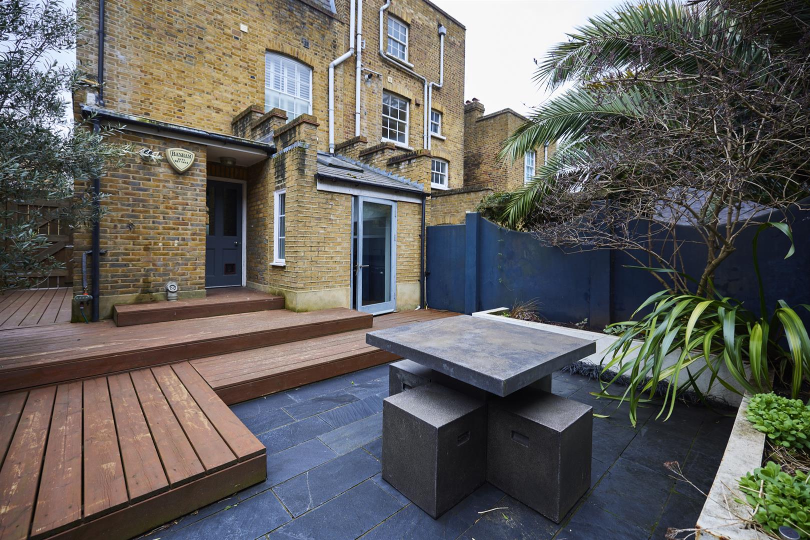 The garden is an utter joy! A wide glass door opens to the decked patio which is tiered offer seating for every last drop of the south-westerly sun. The L shaped planter bed hosts an array of mature flowers and shrubs a jasmine climber continues its confident ascent of the rear wooden cladding. A door to the rear of the dining area leads to a rear lobby with wc and further garden access. You'll also find access to the head height lower ground floor which has any number of potential uses - teenage/adult hideaway top the list. There's also plumbing for the washing machine. Ascending the carpeted stairs you're treated to a wider than average landing. Your slick and sexy bathroom has white tiling and grey floor tiles (with more underfloor heating). The double walk in wet room style shower has a drencher over the roll top bath.