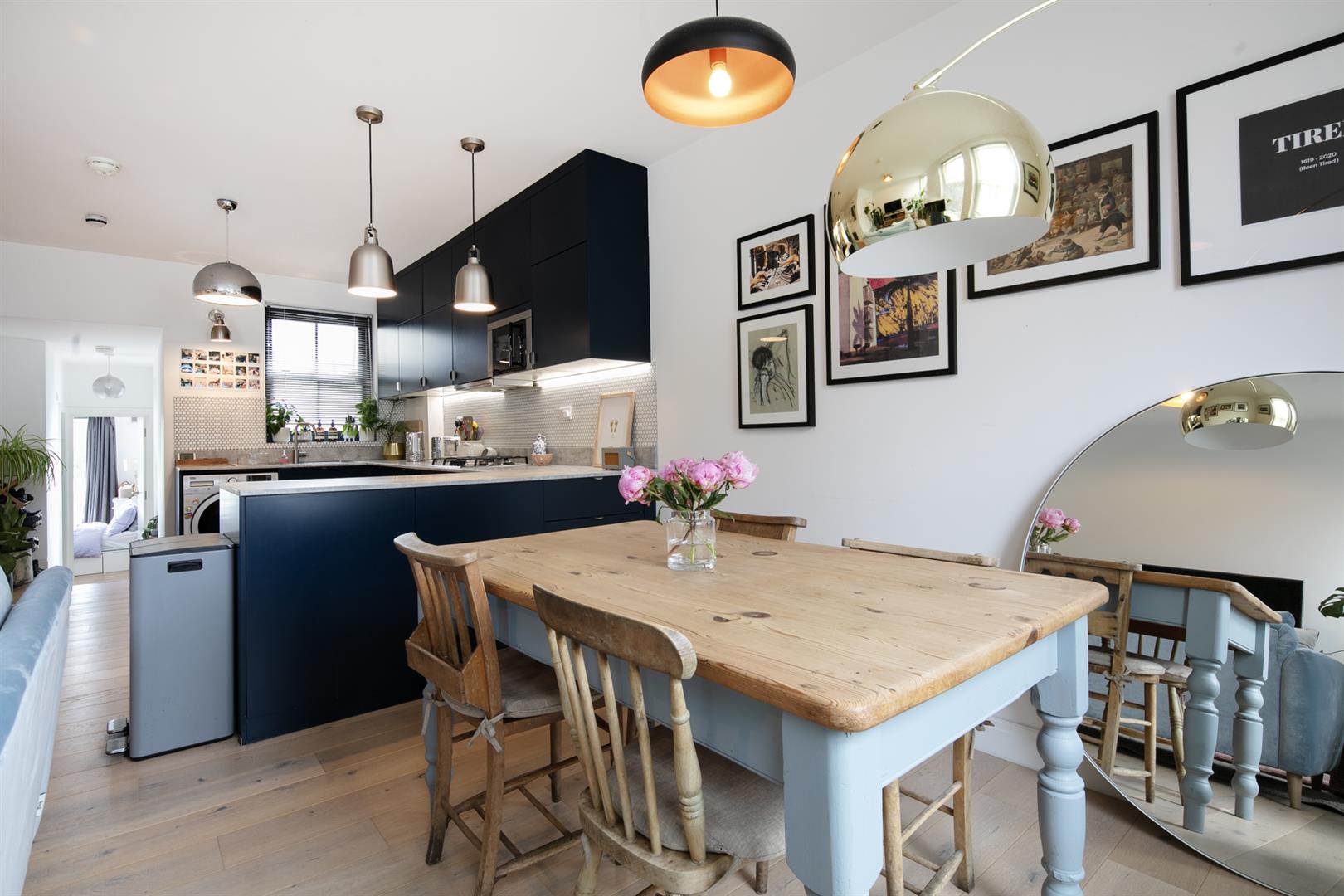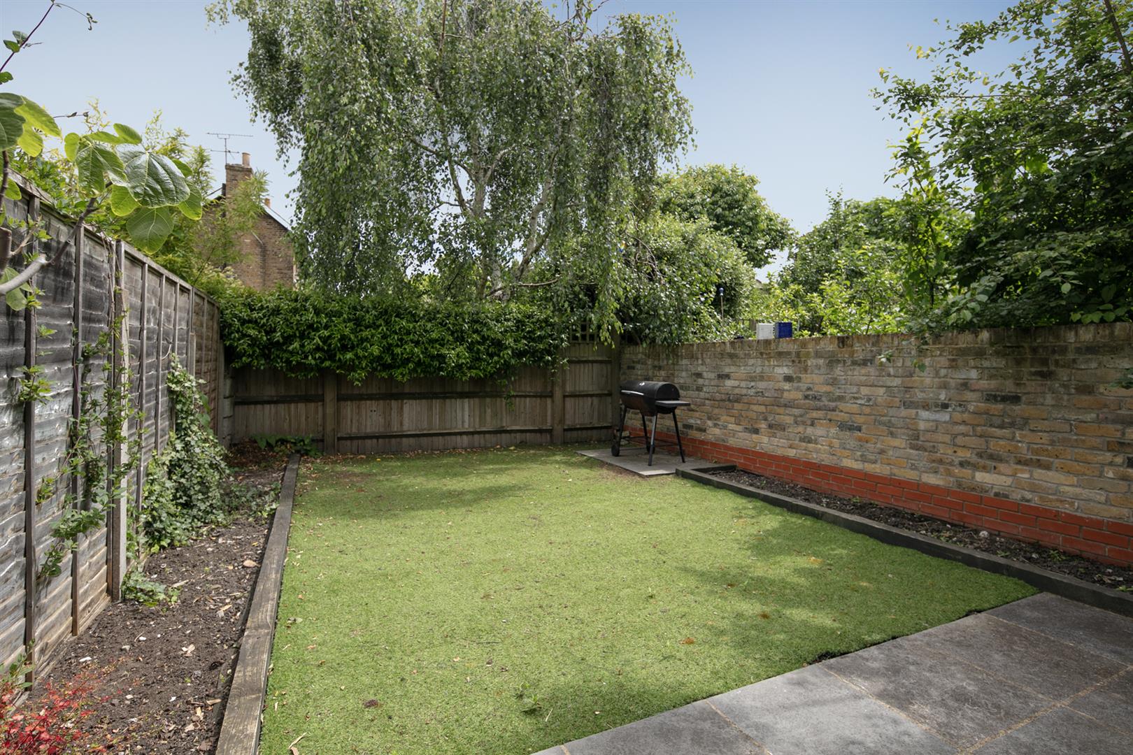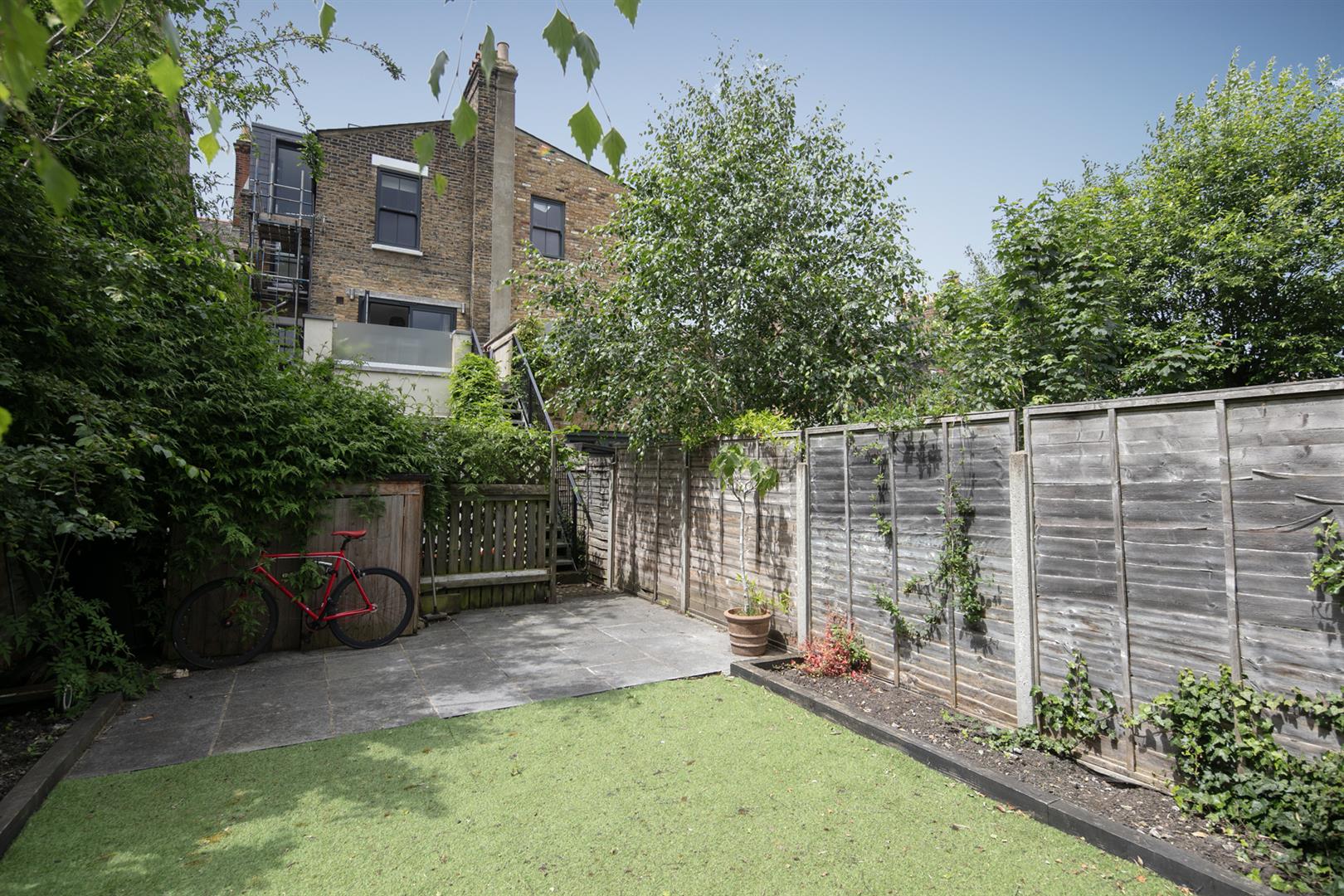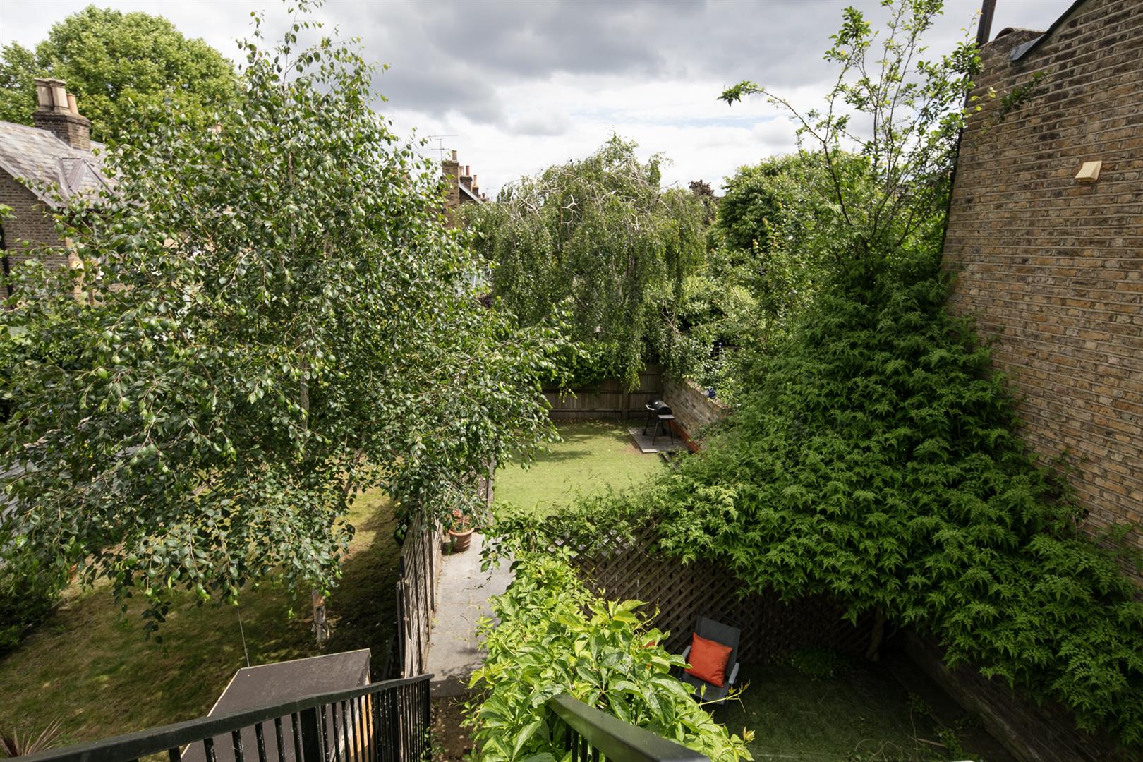 The living area fronts the street into a triptych of sash windows. Here you'll enjoy ample lounging and dining space and some delightful engineered wooden flooring. A spacious kitchen with oodles of cabinet and counter space adjoins to the rear with honeycomb splashback, four ring gas hob, oven, one and half bowl stainless steel sink and drainer. The fridge, freezer and dishwasher are integrated and there's space and plumbing for the washing machine. The bathroom sits down a half flight opposite a side aspect casement window. It has a contemporary white suite, handsome tiling, funky vinyl flooring and a heated towel rail. Next you find a bright and airy rear-facing double bedrooms with wide glass doors opening to a gorgeous and peaceful terrace. A set of steps lead downward from here to the private garden which is another leafy oasis.