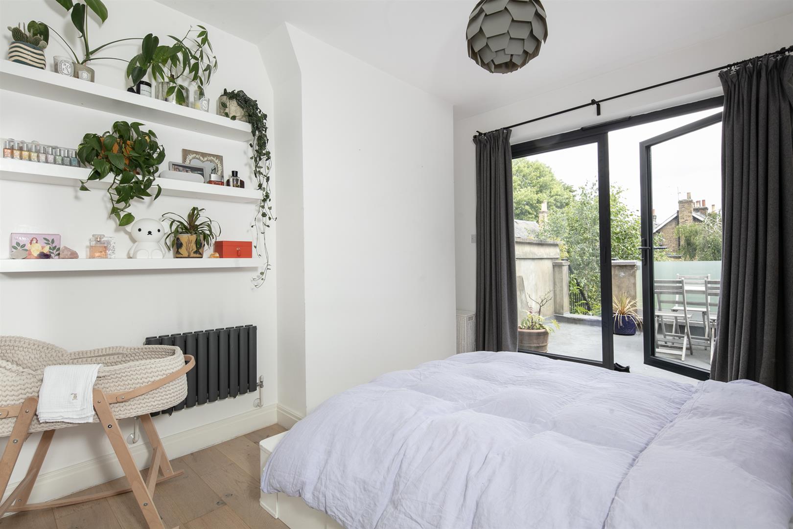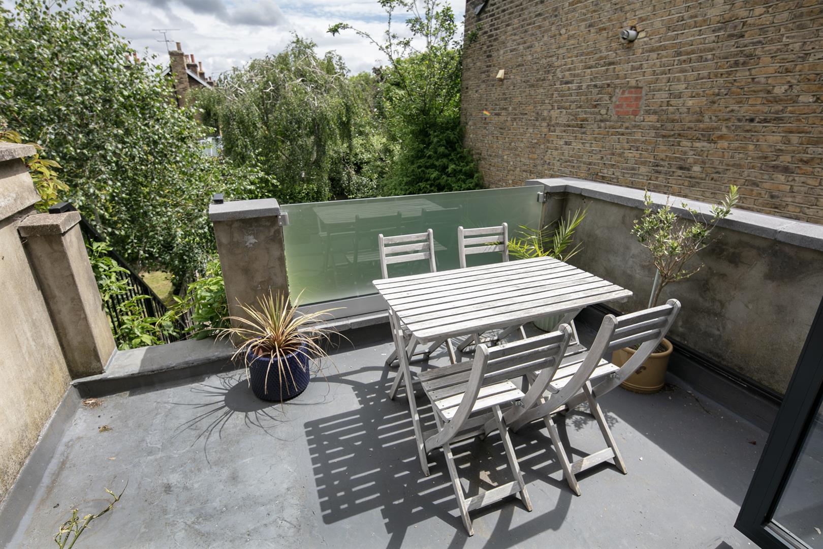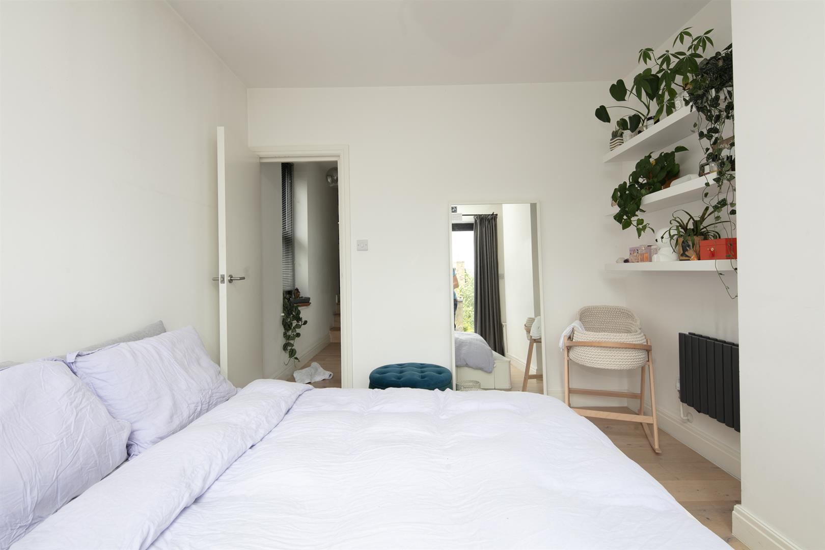 The living area fronts the street into a triptych of sash windows. Here you'll enjoy ample lounging and dining space and some delightful engineered wooden flooring. A spacious kitchen with oodles of cabinet and counter space adjoins to the rear with honeycomb splashback, four ring gas hob, oven, one and half bowl stainless steel sink and drainer. The fridge, freezer and dishwasher are integrated and there's space and plumbing for the washing machine. The bathroom sits down a half flight opposite a side aspect casement window. It has a contemporary white suite, handsome tiling, funky vinyl flooring and a heated towel rail. Next you find a bright and airy rear-facing double bedrooms with wide glass doors opening to a gorgeous and peaceful terrace. A set of steps lead downward from here to the private garden which is another leafy oasis.