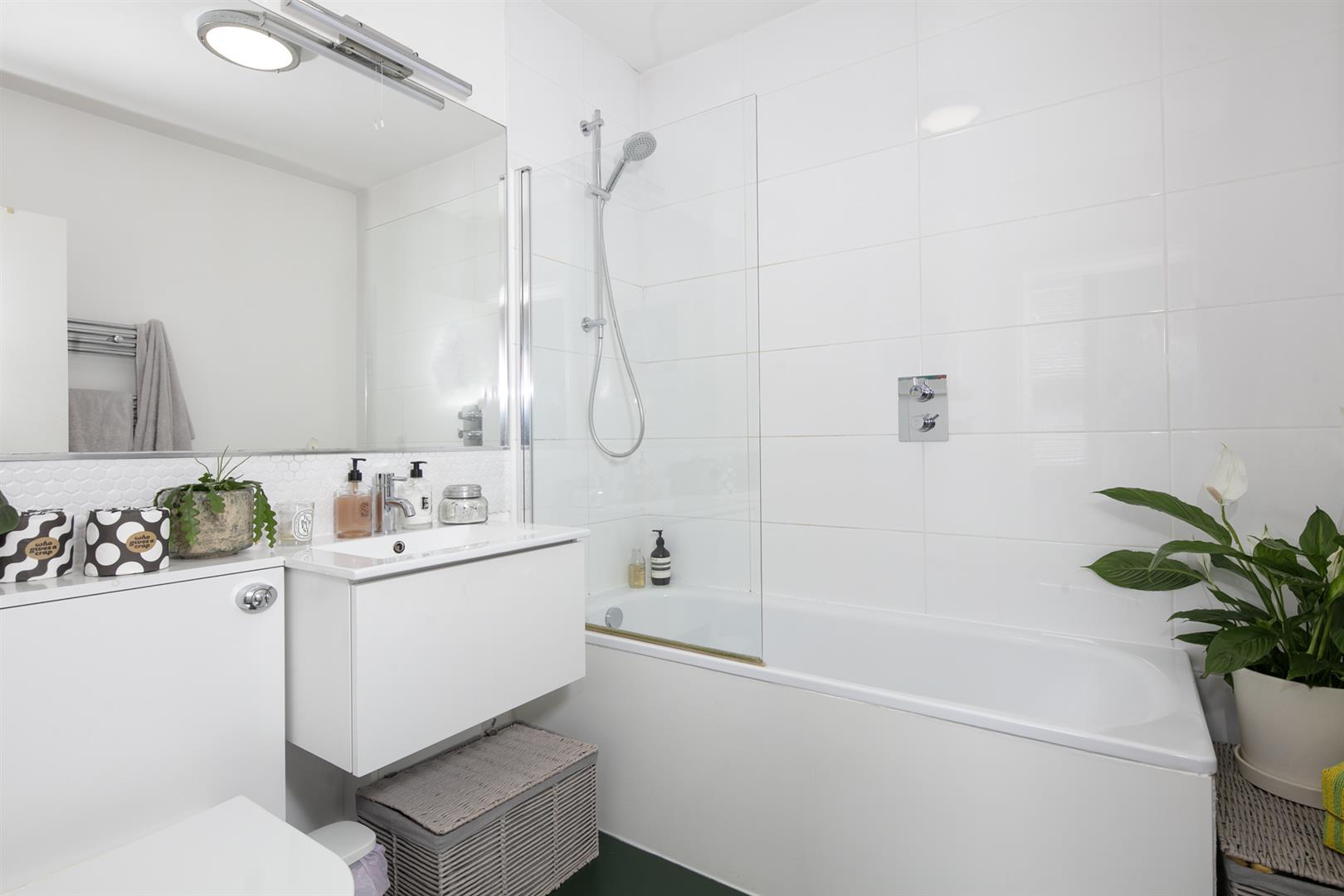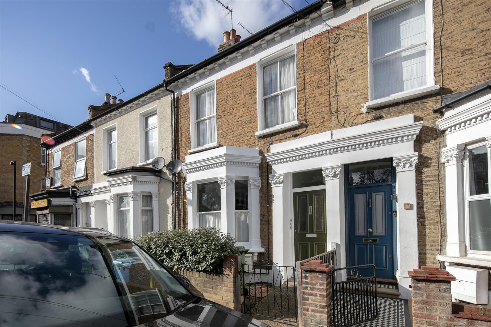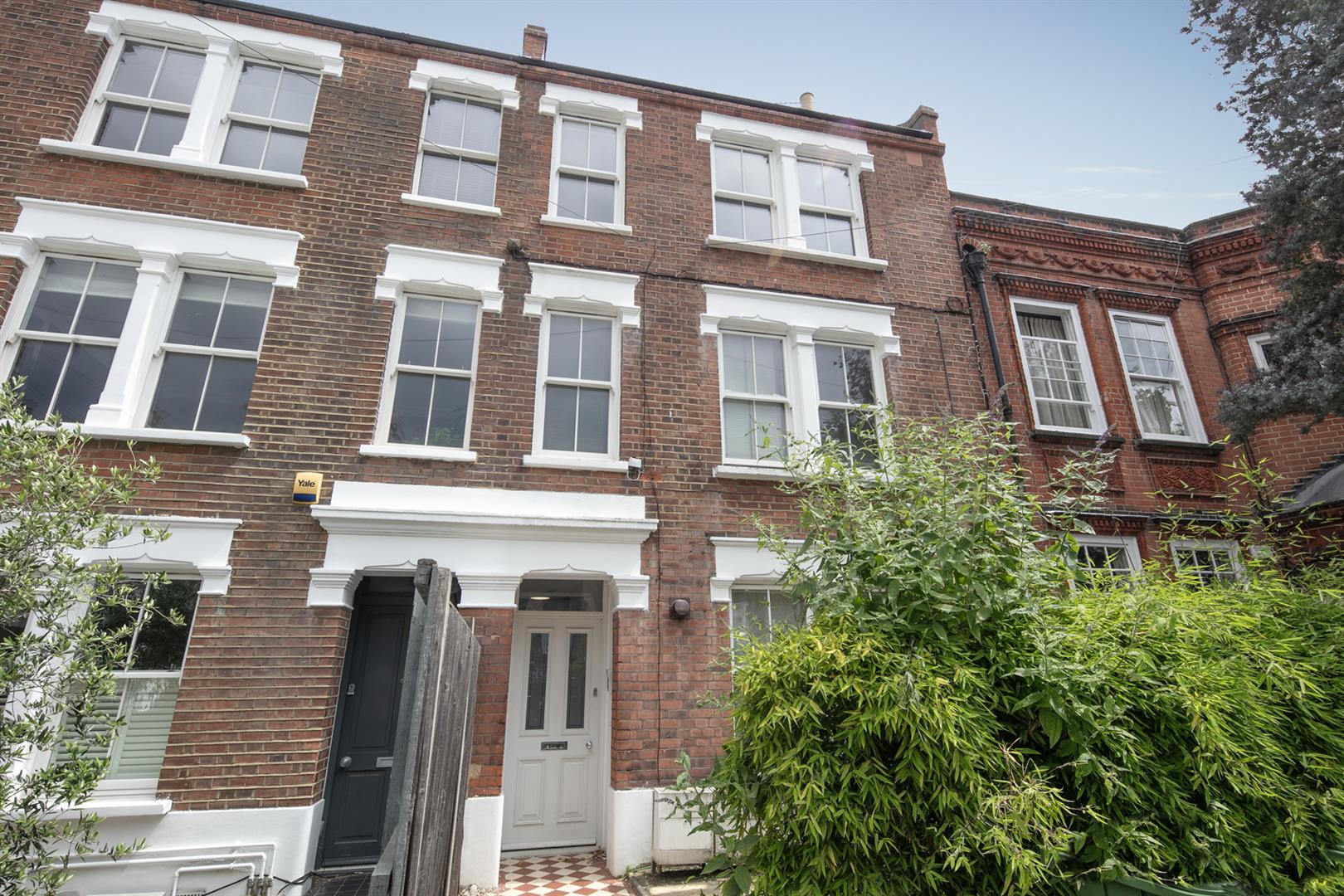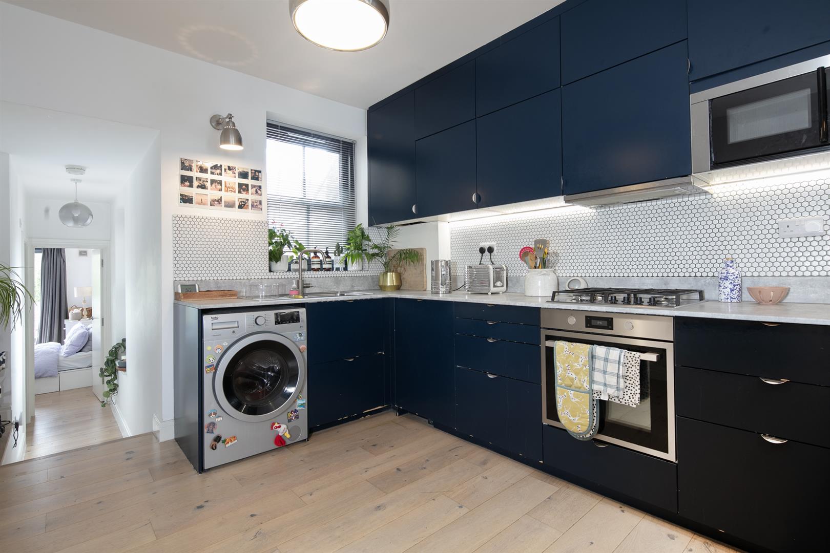 The living area fronts the street into a triptych of sash windows. Here you'll enjoy ample lounging and dining space and some delightful engineered wooden flooring. A spacious kitchen with oodles of cabinet and counter space adjoins to the rear with honeycomb splashback, four ring gas hob, oven, one and half bowl stainless steel sink and drainer. The fridge, freezer and dishwasher are integrated and there's space and plumbing for the washing machine. The bathroom sits down a half flight opposite a side aspect casement window. It has a contemporary white suite, handsome tiling, funky vinyl flooring and a heated towel rail. Next you find a bright and airy rear-facing double bedrooms with wide glass doors opening to a gorgeous and peaceful terrace. A set of steps lead downward from here to the private garden which is another leafy oasis.
