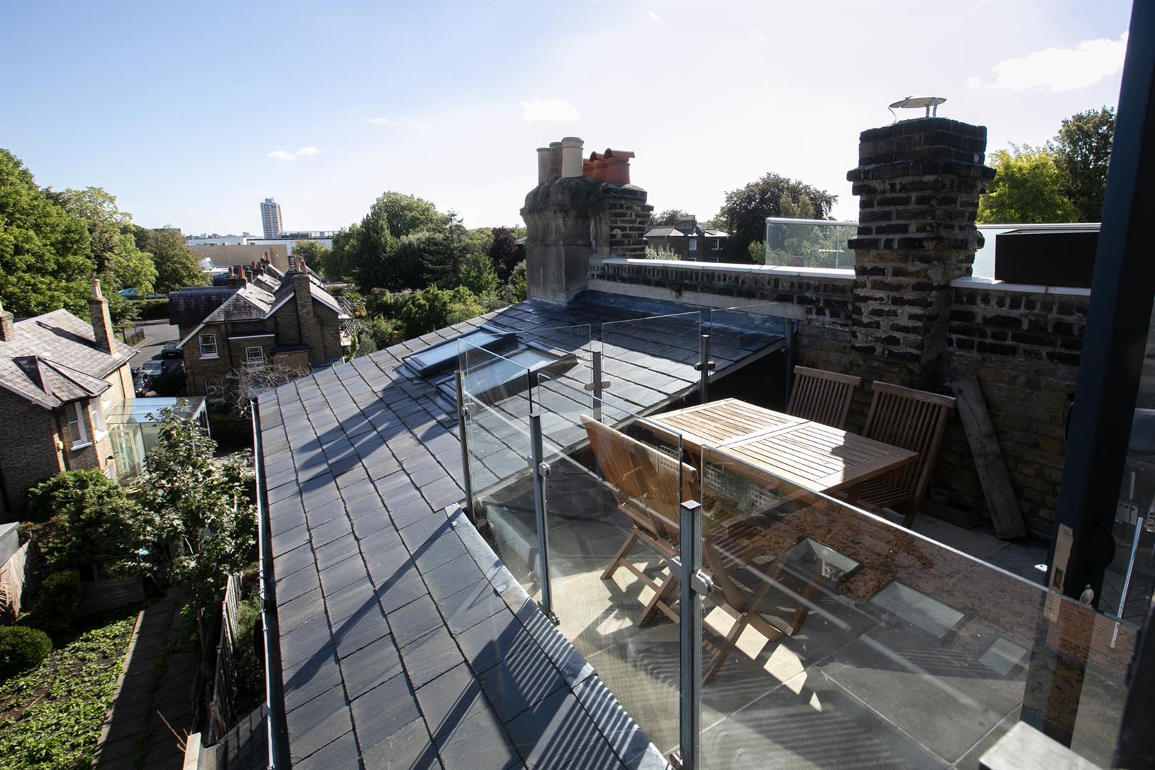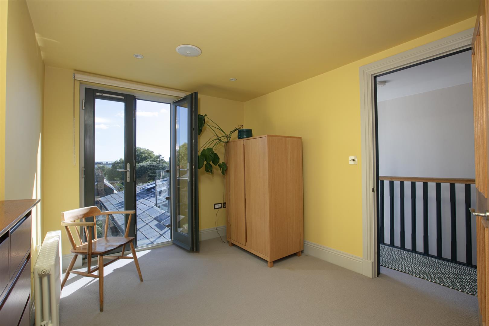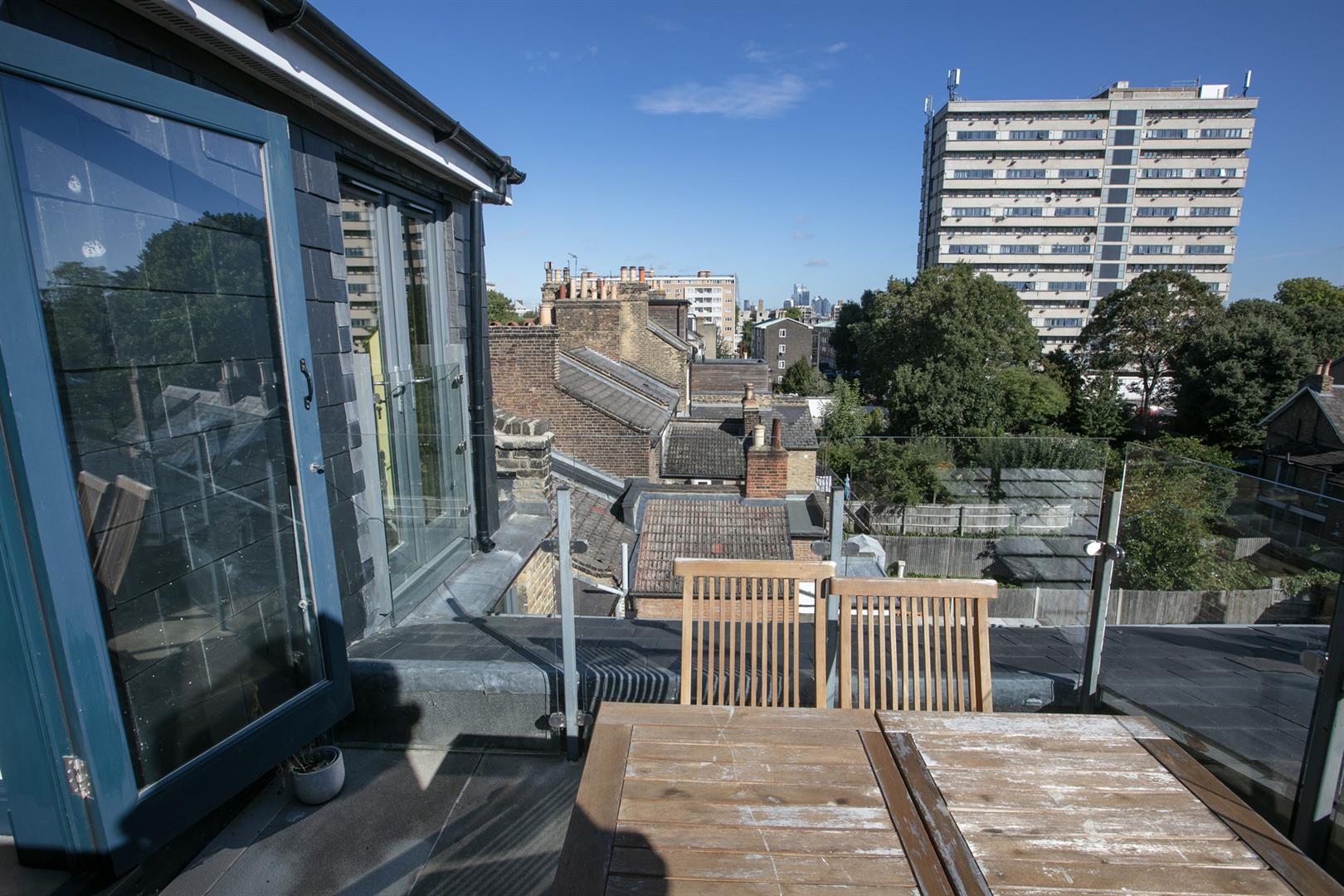 Heading upward to the you find the upper landing enjoys more quality carpeting and the same slick tasteful Farrow and Ball trim along the architraves and balustrades. The terrace is accessed from here and offers an amazing entertaining, dining and chill space. Views stretches from Canary Wharf to the city and beyond. The second bedroom is a huge double and takes the lion's share of the top floor. There's eaves storage, tasteful yellow walls (with colour-drenched ceiling) and a fab Juliette balcony from whence you enjoy more views and airiness. A fancy shower room completes the tour nicely.