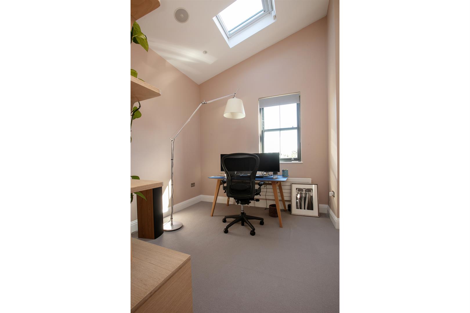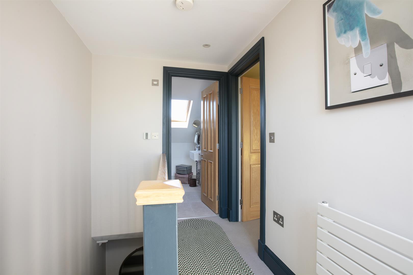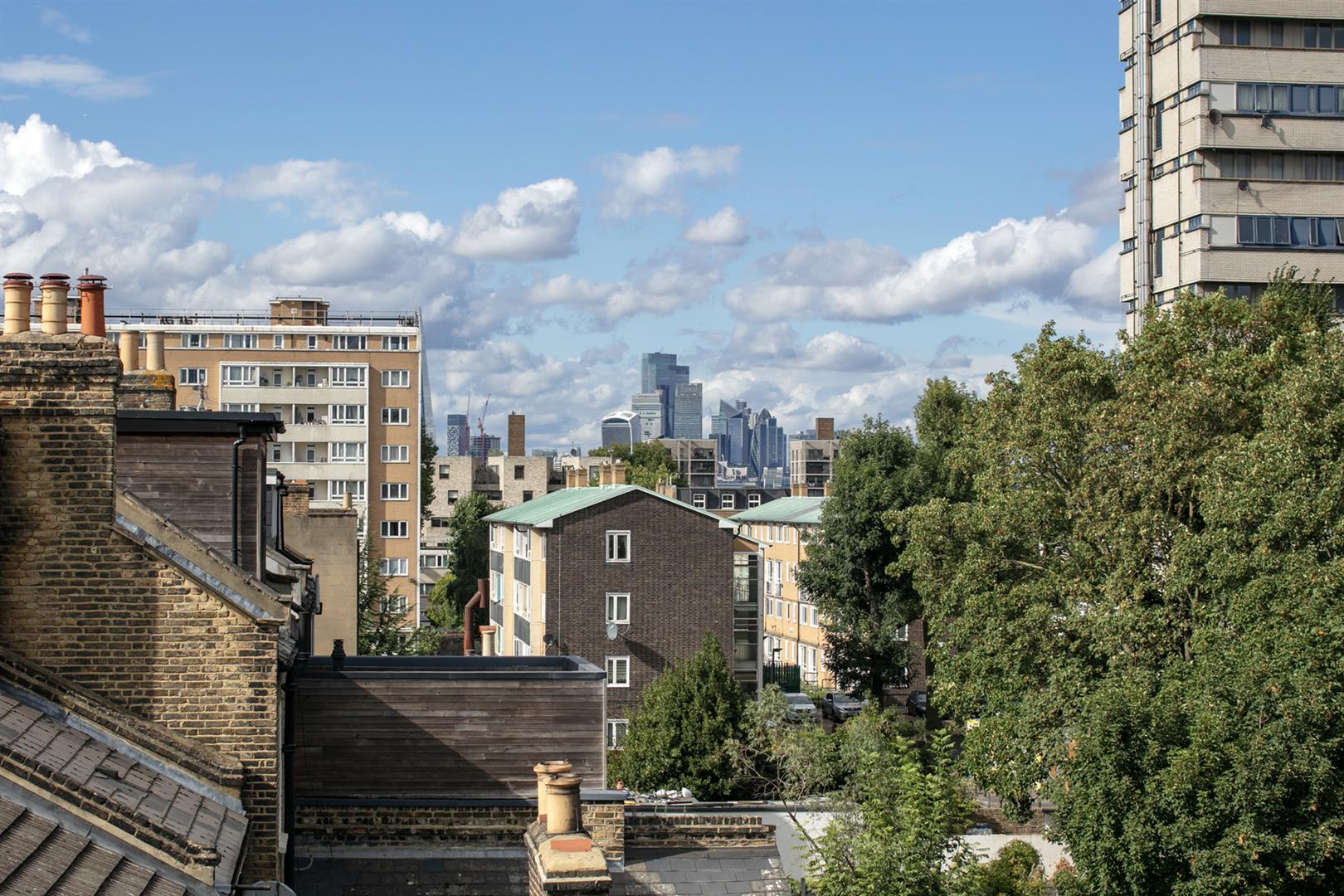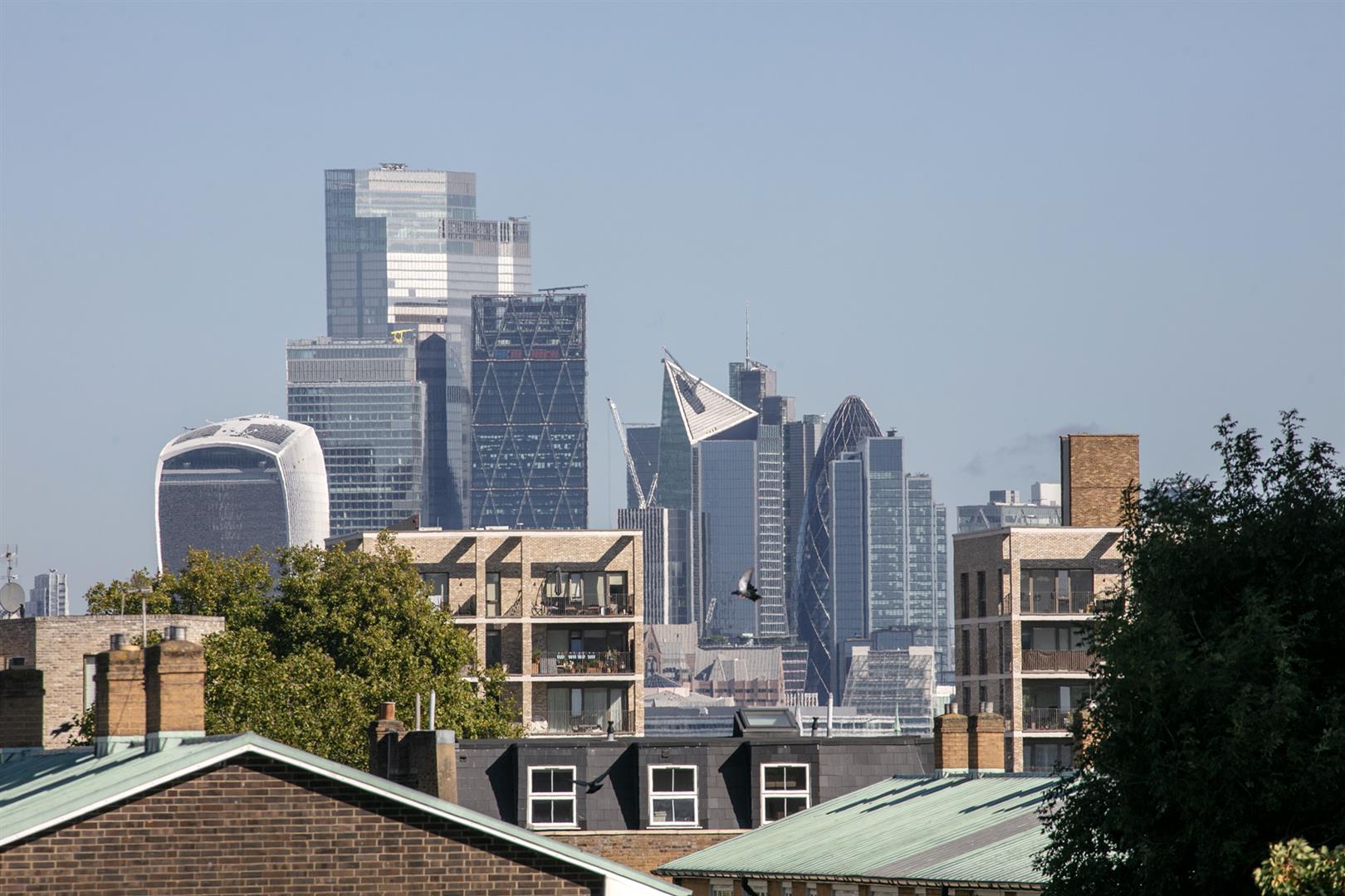 Heading upward to the you find the upper landing enjoys more quality carpeting and the same slick tasteful Farrow and Ball trim along the architraves and balustrades. The terrace is accessed from here and offers an amazing entertaining, dining and chill space. Views stretches from Canary Wharf to the city and beyond. The second bedroom is a huge double and takes the lion's share of the top floor. There's eaves storage, tasteful yellow walls (with colour-drenched ceiling) and a fab Juliette balcony from whence you enjoy more views and airiness. A fancy shower room completes the tour nicely.