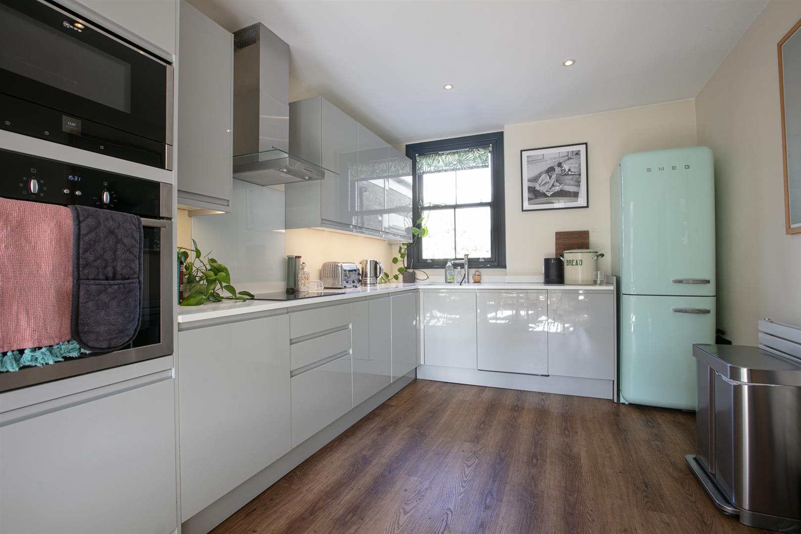 A flat fronted exterior leads off the street through a shared front garden. A well presented communal hallway offers you a carpeted staircase up to your first floor door. A carpeted inner hall leads upward, past some fine fitted storage, to the sizeable landing. The rear return hosts the first of two amazing bedrooms which boasts a lofty double-height vaulted ceiling, twin skylights (with electric blinds) and a further rear-facing window. The main bathroom completes this level nicely donning a jet bath, heated towel rail, white suite and side aspect frosted sash window. There's further recessed storage off the landing. The front-facing L-shaped open-plan living area is wide and bright. It's a fab spot for lounging, dining and entertaining. To the rear you find an adjoining kitchen/diner with sleek light grey cabinets. Appliances include an integrated dishwasher and washing machine, four ring induction hob, NEFF oven and integrated microwave.