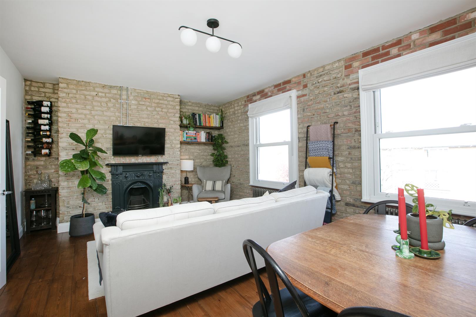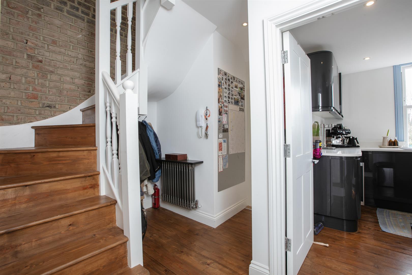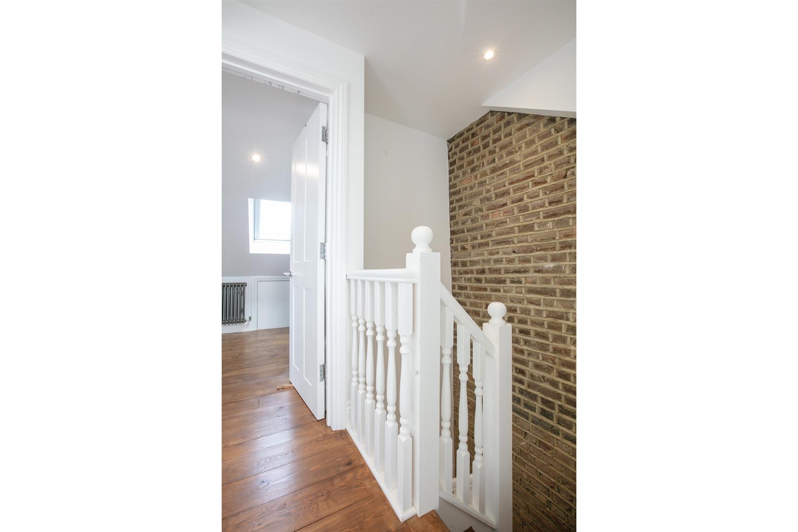 A shared front garden and communal hallways lead you to the flat's first floor entrance. Head up to your second floor landing where you find some lovely varnished timber floors and crisp white walls - a theme in abundance throughout. Your huge reception fronts the street and enjoys high ceilings and some lovely raw metal school house radiators. A decorative feature fireplace will woo you further and there's lovely exposed brickwork - very New York loft! It's a peaceful and bright spot for relaxation.
