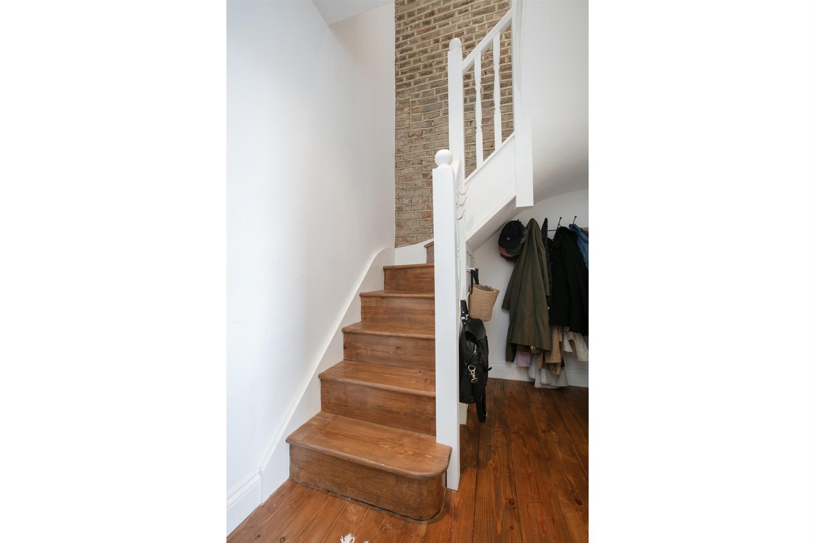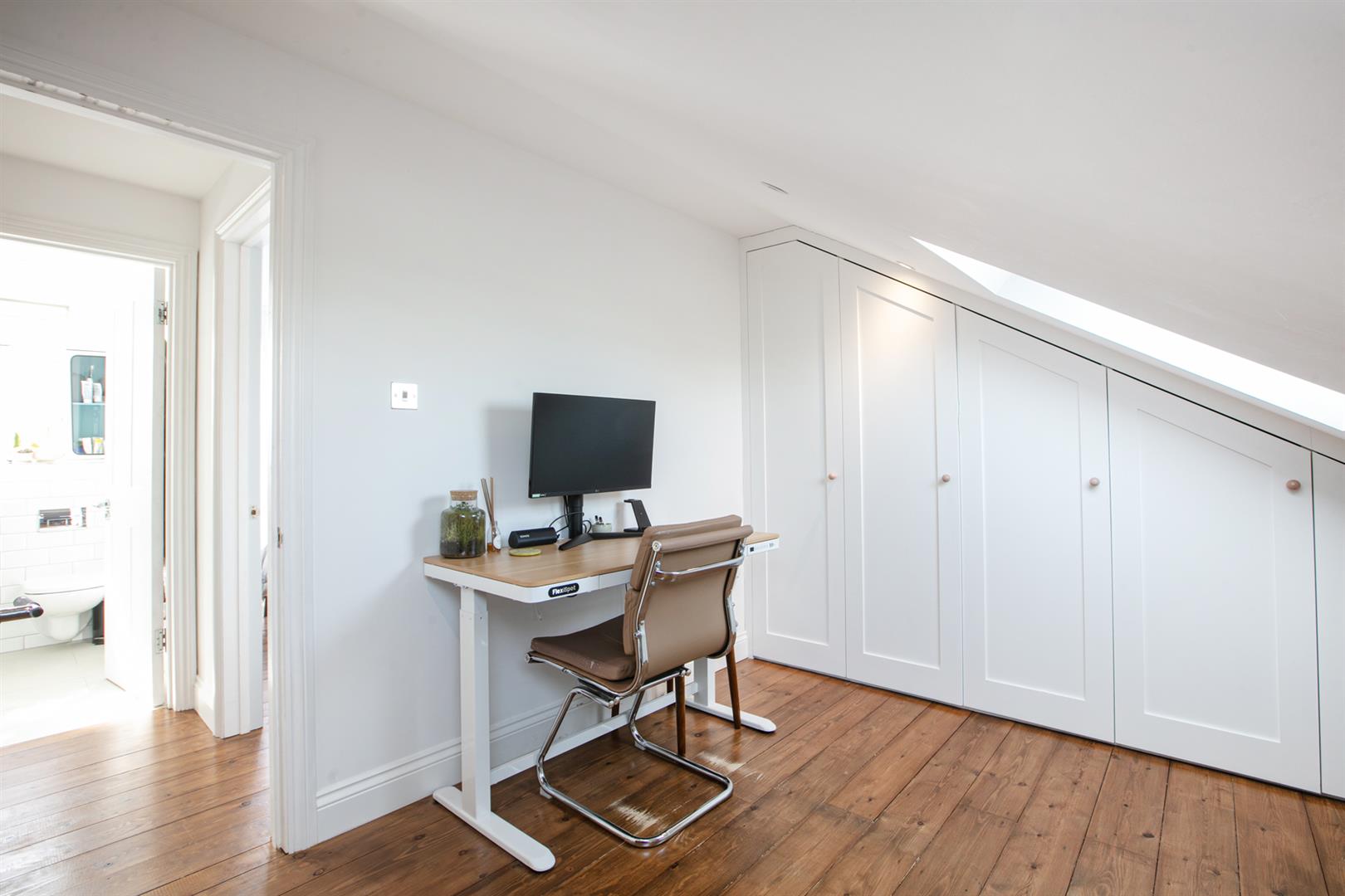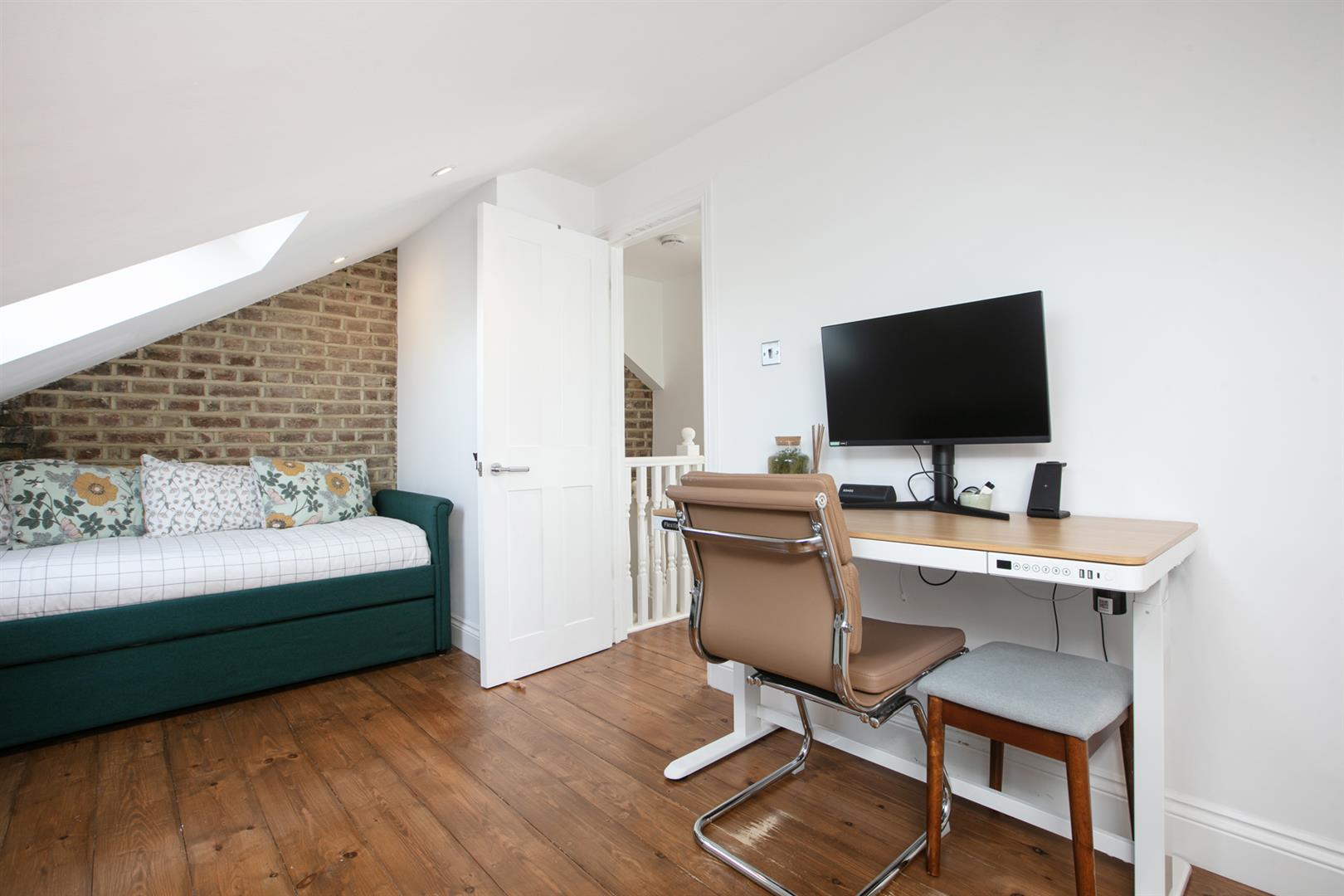 The kitchen boasts granite counters atop sleek contemporary cabinets. There's plentiful storage and a five ring gas hob and oven, wine cooler and one and a half stainless steel sink and drainer. The integrated appliances include fridge/freezer, dishwasher and washing machine. A neat shower room completes this floor. Head upward past more lovely exposed brickwork to find a front-facing bedroom with more stripped timber floors and a wall of fitted storage. Currently arranged as a study (with handy day bed for guests), the space has two large Velux windows which keep things bright and airy. There's additional low-level loft storage for the Christmas tree and unboxed exercise equipment. The master bedroom faces rear through a lovely Juliette Balcony with glass screen. It's a wonderful eagle-eyed tree top view that stretches far and wide - indeed the current owners refer to it as their very own private tree-house.