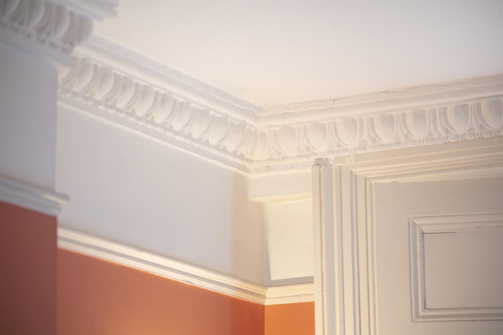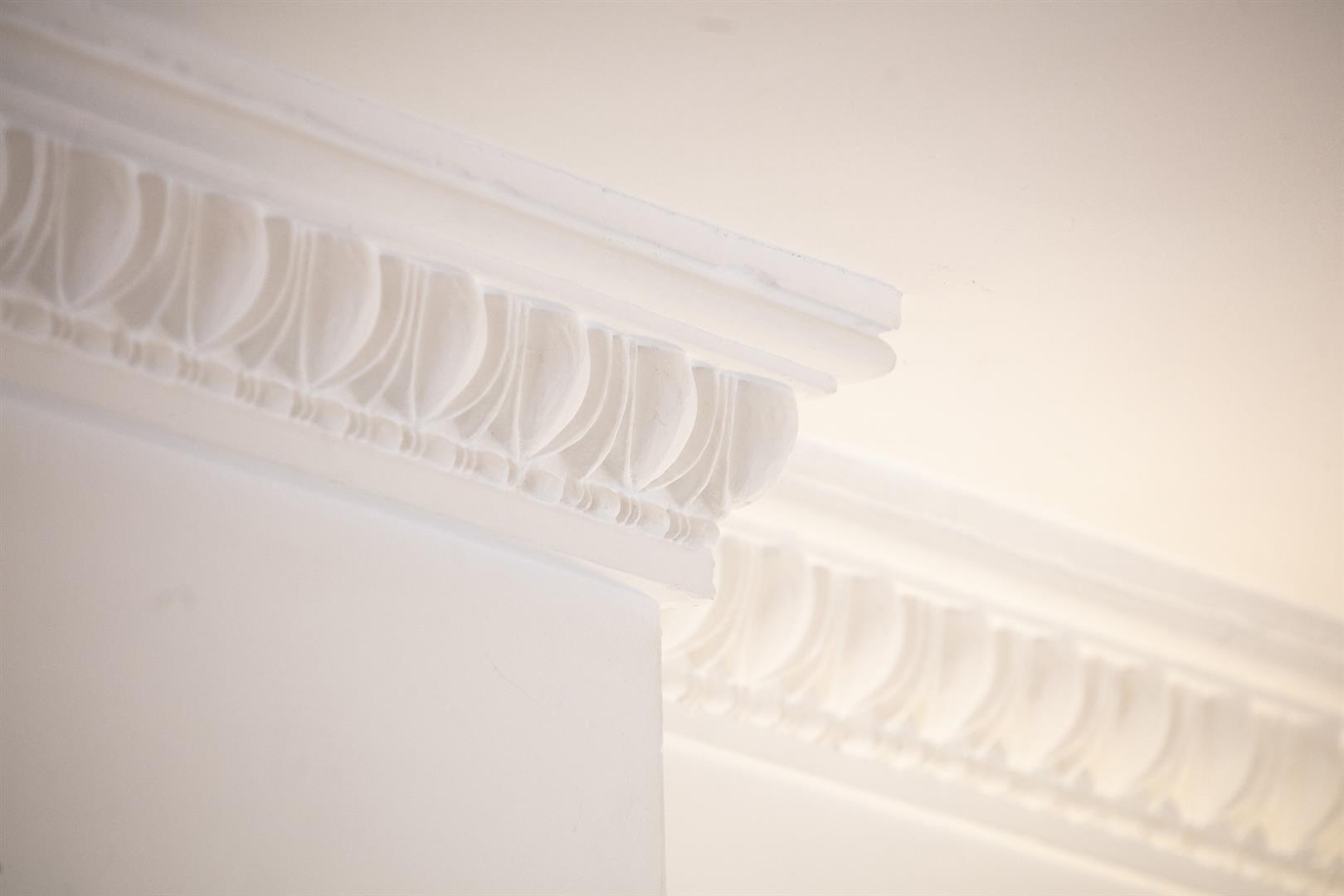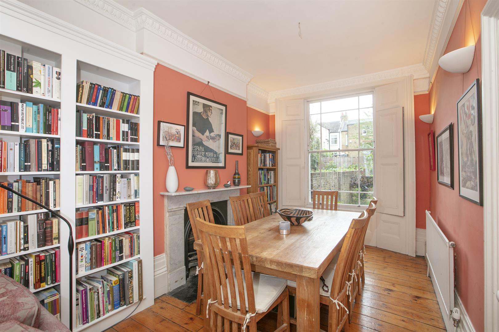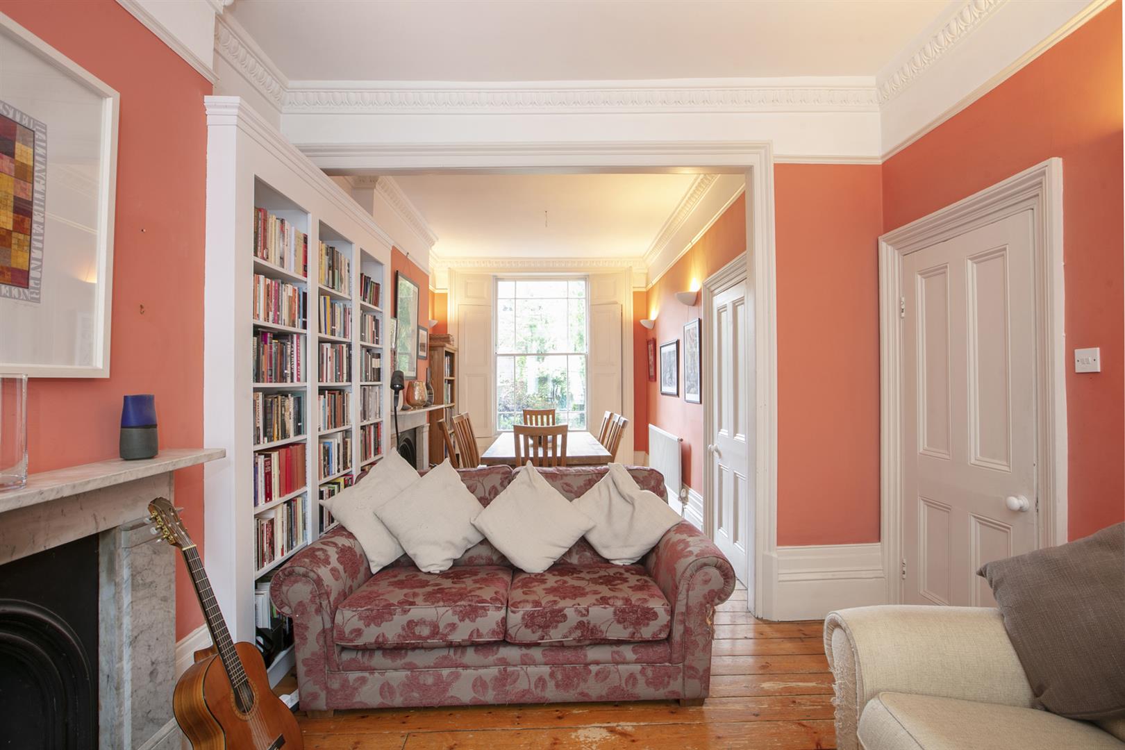 You approach the house up a flight of stone steps. In the hall is the first of that wonderfully detailed cornicing above. On the left is the large front reception room, an elegant, generous space with egg and dart cornicing, matching cast-iron Victorian fireplaces and a large shuttered bay window. Well-preserved sash windows give the room a gracious outlook. A rear dining area offers more voluptuous egg and dart cornicing and a beautifully framed shuttered sash window overlooking the garden.
