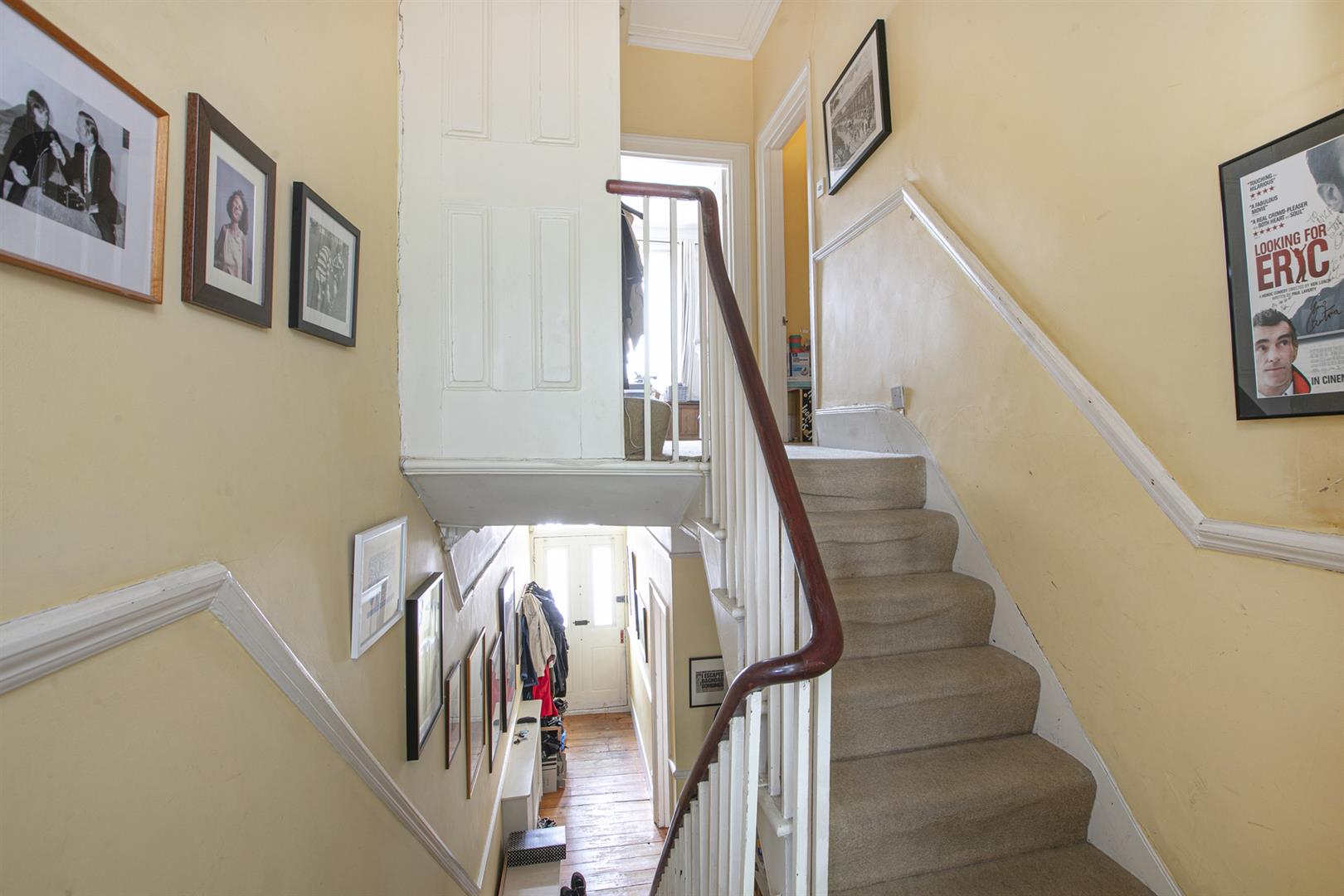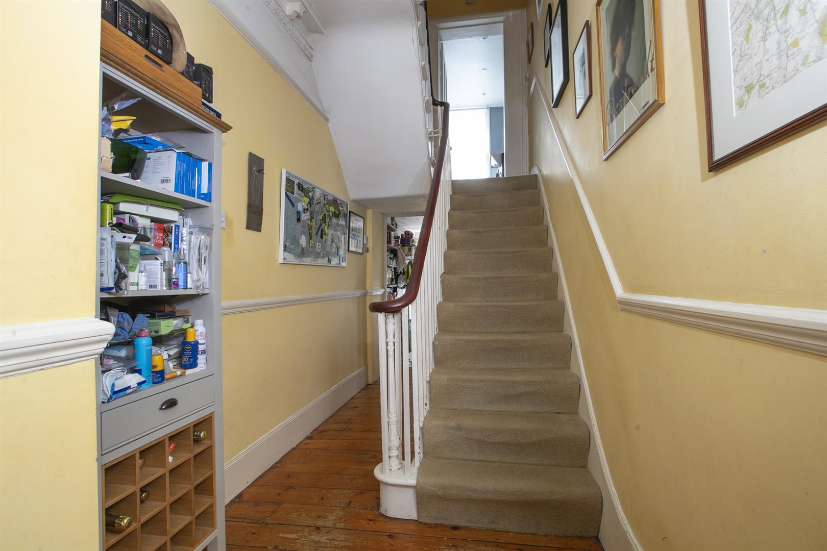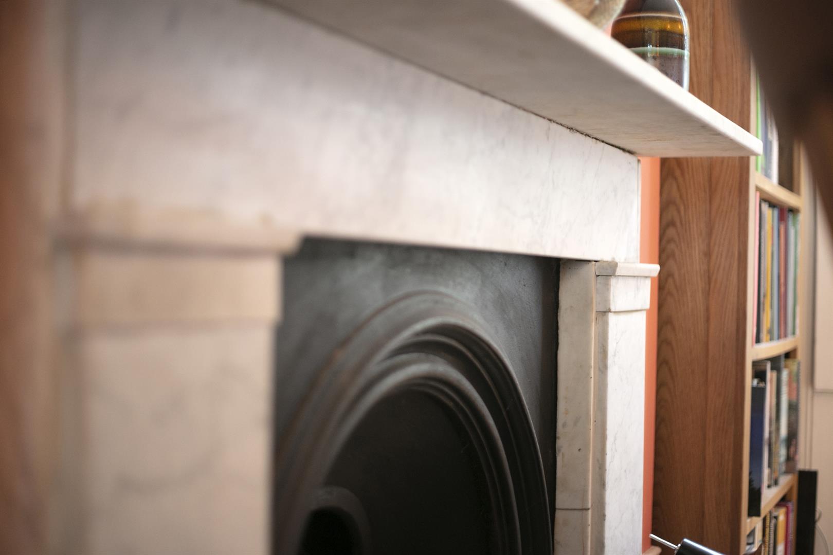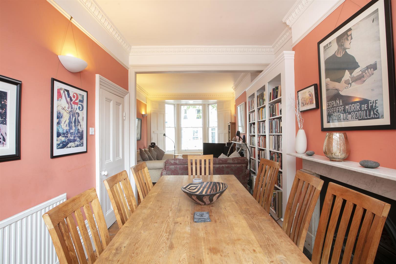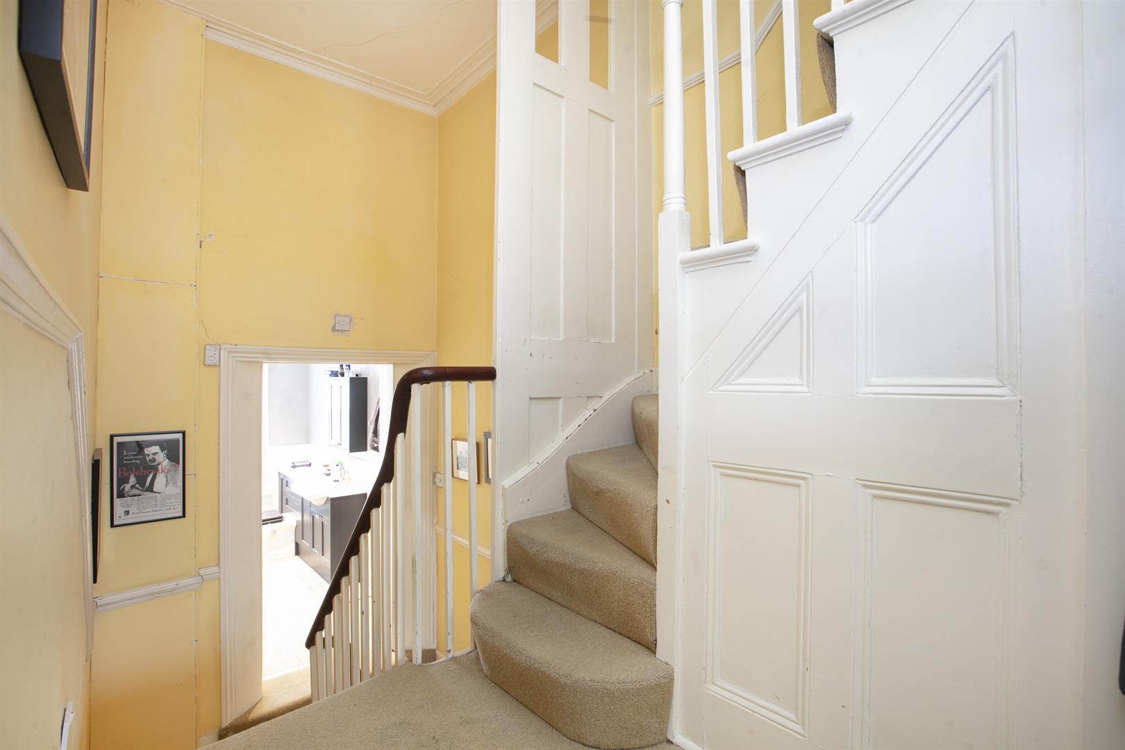 You approach the house up a flight of stone steps. In the hall is the first of that wonderfully detailed cornicing above. On the left is the large front reception room, an elegant, generous space with egg and dart cornicing, matching cast-iron Victorian fireplaces and a large shuttered bay window. Well-preserved sash windows give the room a gracious outlook. A rear dining area offers more voluptuous egg and dart cornicing and a beautifully framed shuttered sash window overlooking the garden.