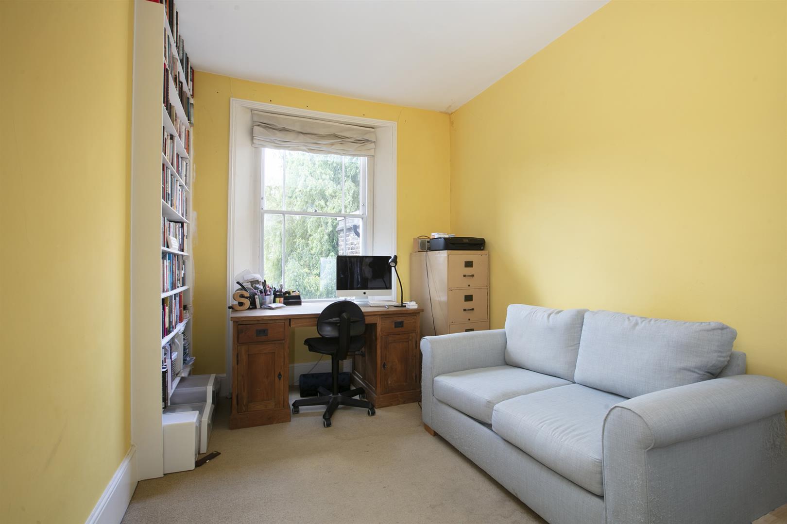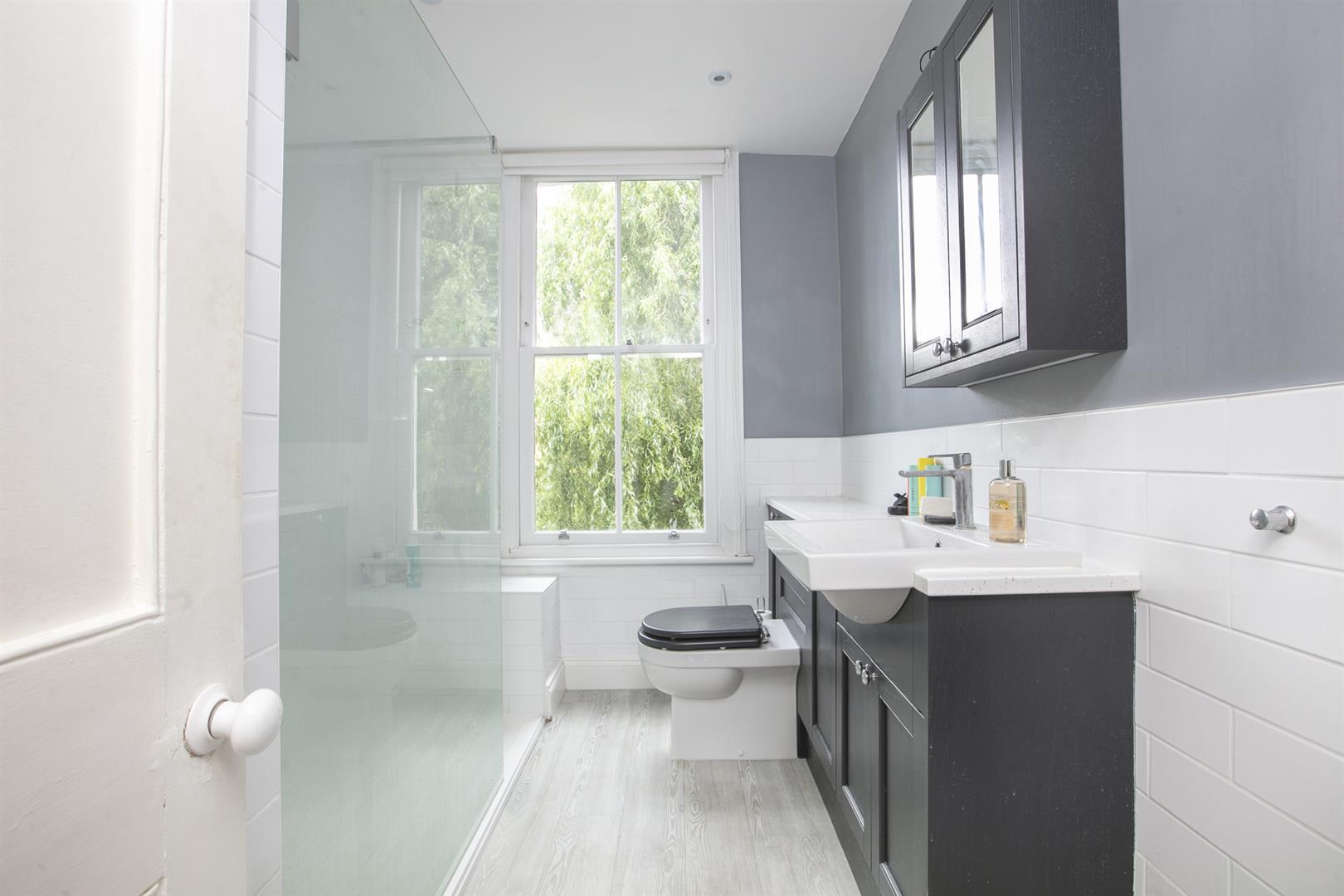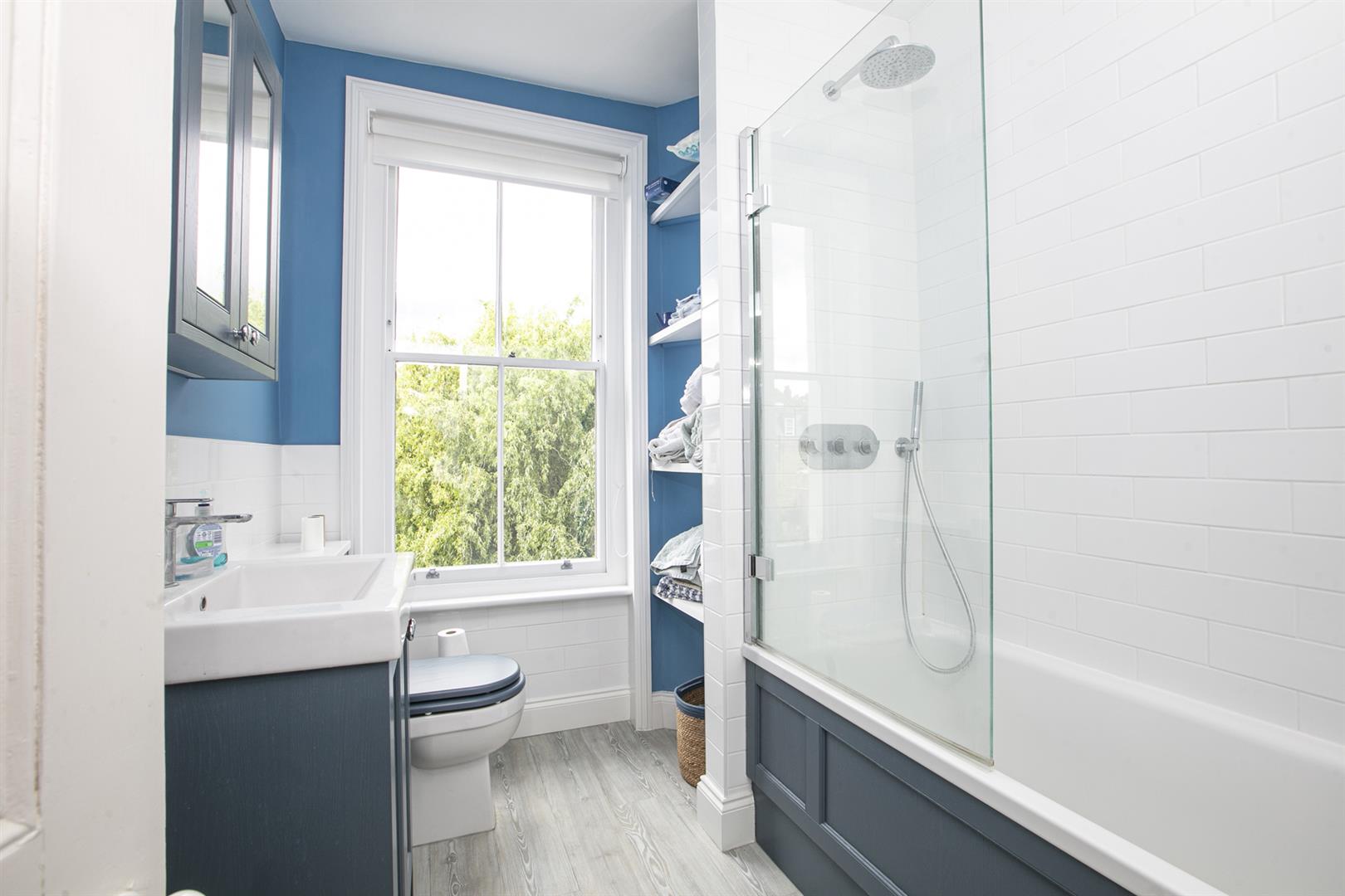 Back inside the main house on the half landing is a contemporary shower room with wide shower and crisp white suite. A large sash window overlooks the garden. Up again are two double bedrooms - the front double has two tall, large sash windows plus built-in cupboards. The rear double bedroom, currently used as a study, boasts a garden vista. On the top floor is another bathroom, this time a restful duck egg blue, and two more double bedrooms. The front double again has two large sash windows while the fourth bedroom, currently used as a second study, has another large sash window, built-in cupboard and cast iron fireplace.