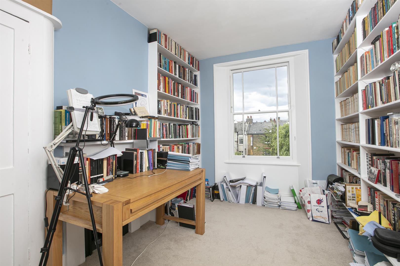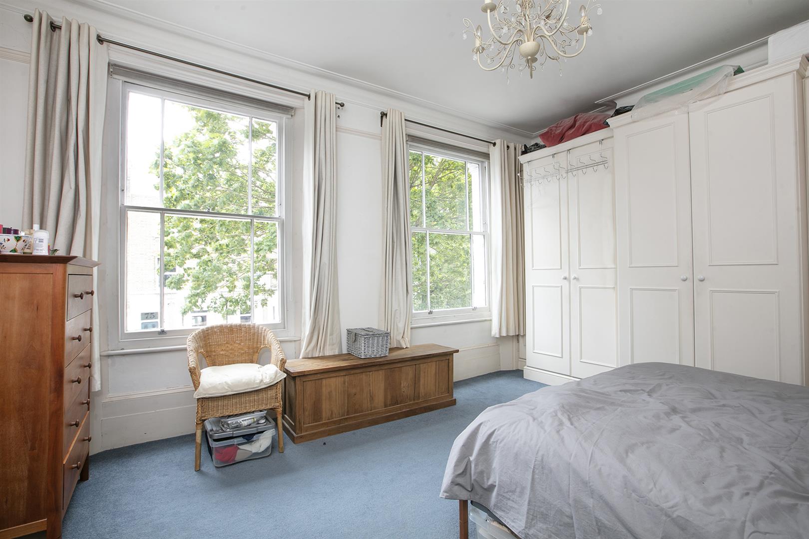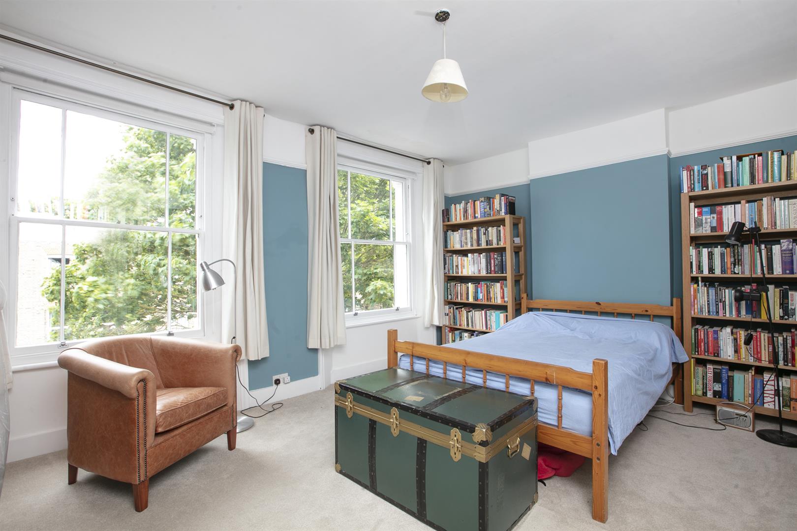 Back inside the main house on the half landing is a contemporary shower room with wide shower and crisp white suite. A large sash window overlooks the garden. Up again are two double bedrooms - the front double has two tall, large sash windows plus built-in cupboards. The rear double bedroom, currently used as a study, boasts a garden vista. On the top floor is another bathroom, this time a restful duck egg blue, and two more double bedrooms. The front double again has two large sash windows while the fourth bedroom, currently used as a second study, has another large sash window, built-in cupboard and cast iron fireplace.