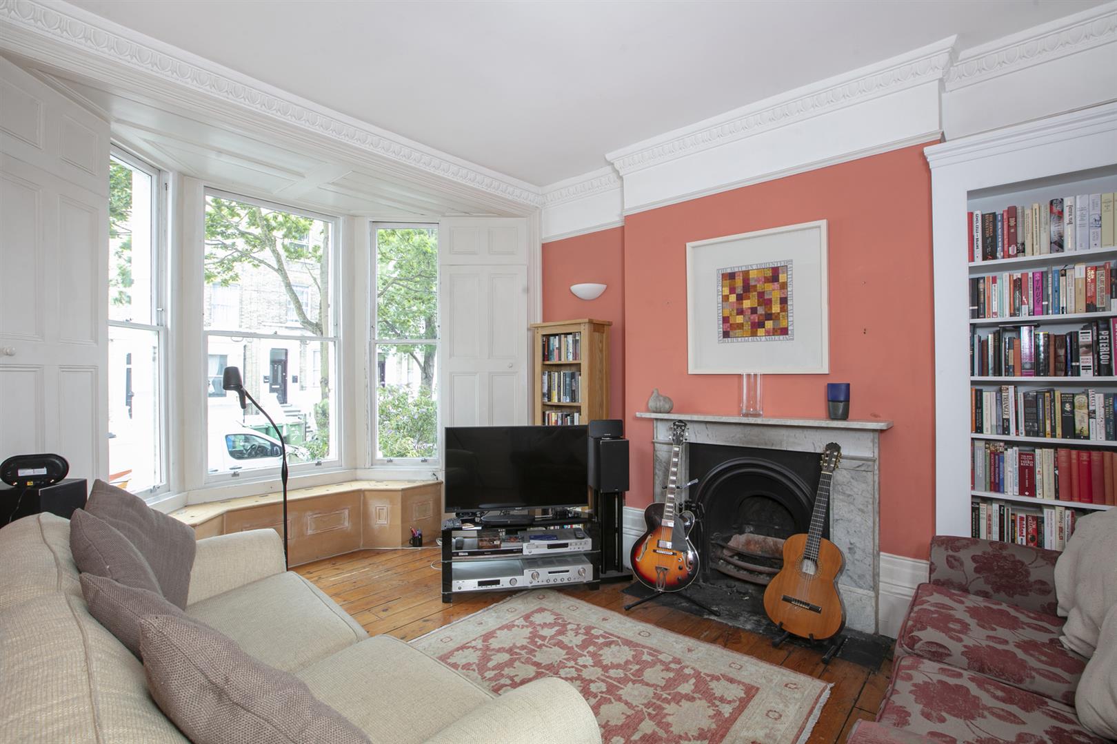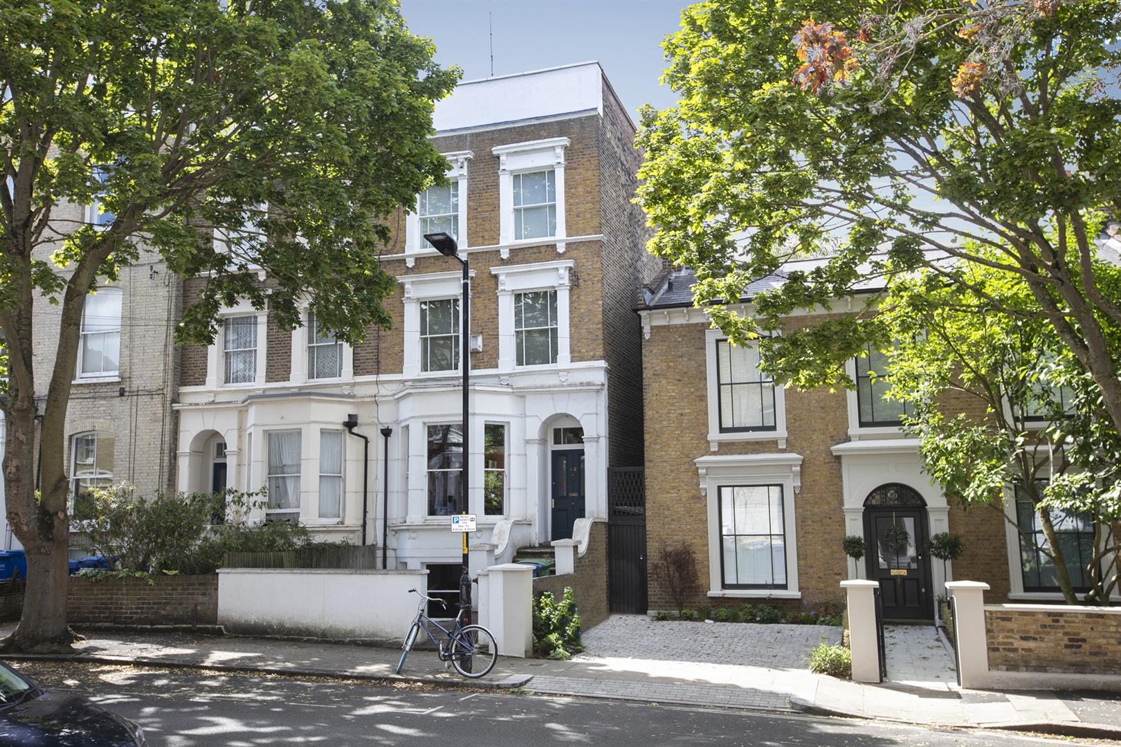 This fine early Victorian semi-detached townhouse is arranged over four floors and supplies a truly versatile living environment. A four double-bedroom home is laid over the top three floors and a self-contained one-bedroom flat occupies the lower ground floor. The lower ground floor is ripe for development. Subject to planning it could host a most impressive full-width kitchen / living area and further living space. The property preserves a wealth of period details like the working marble and cast iron fireplaces, egg and dart cornicing, wide shuttered sash windows, proper panelled doors and high ceilinged rooms, making it a very light and airy house.