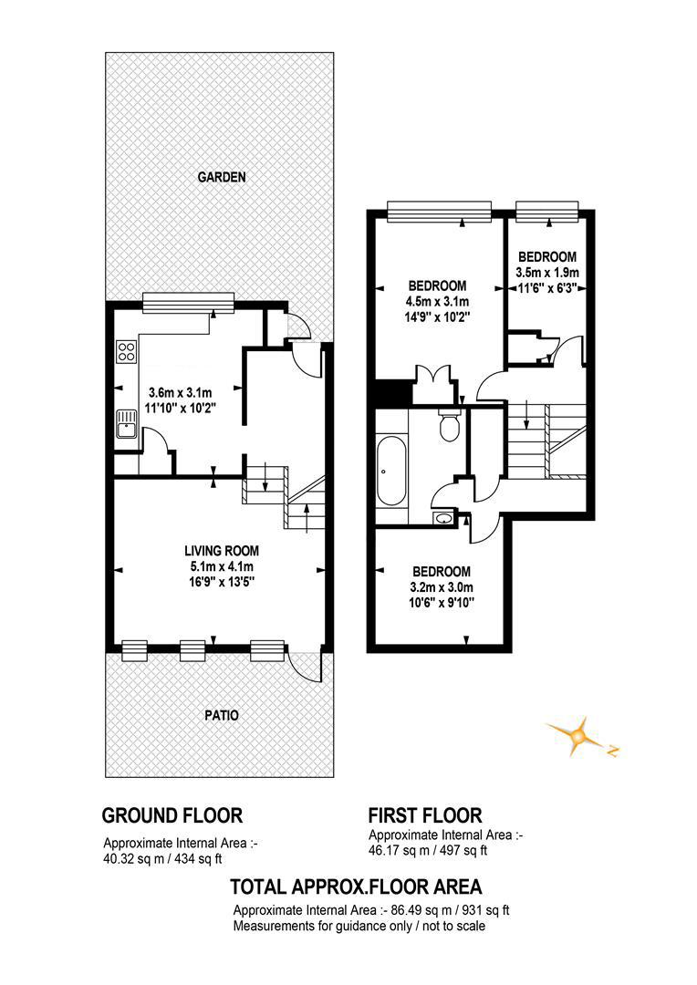 A gated front patio garden with tonnes of space for al-fresco dining leads you to your private entrance. You'll find the kitchen/diner facing front over the garden through a wide double glazed window. There's plenty of dining and counter space. An open rear wall offers a glimpse to the living room a half-flight below. This is accessed back through the hall and stretches to the full width of the property. It has a calming rear aspect facing over abundant greenery through three separate windows. A glass pane door opens to the rear patio garden which in turn opens onto that fabulous shared garden. Back inside ascend your stairs to reach a rear facing double bedroom with more leafy views. The bathroom sits next door to this and has a clean white suite. Upward again you reach two more bedrooms. One is a large single and the other a double - both face front toward a pleasant period streetscape.