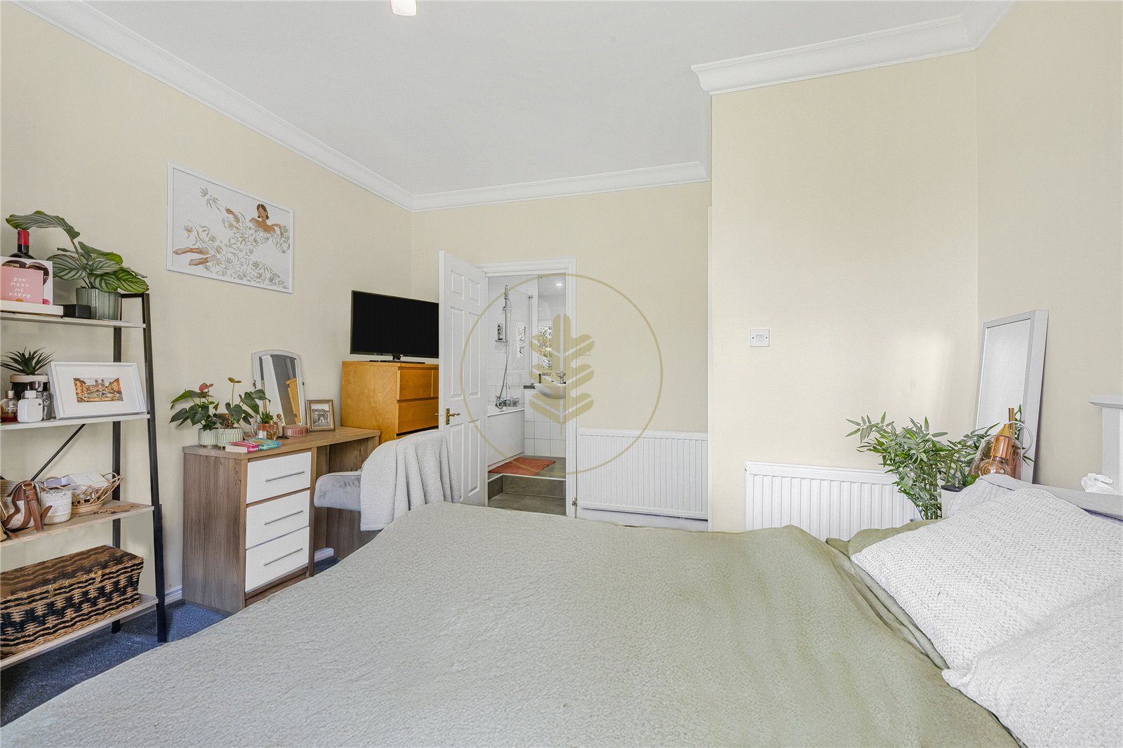 The property features a spacious reception room with generous ceiling height and a door leading into a separate, fully fitted kitchen. The principal bedroom benefits from an en-suite bathroom complete with both a bath and shower attachments, while a second double bedroom is served by a stylish family shower room.