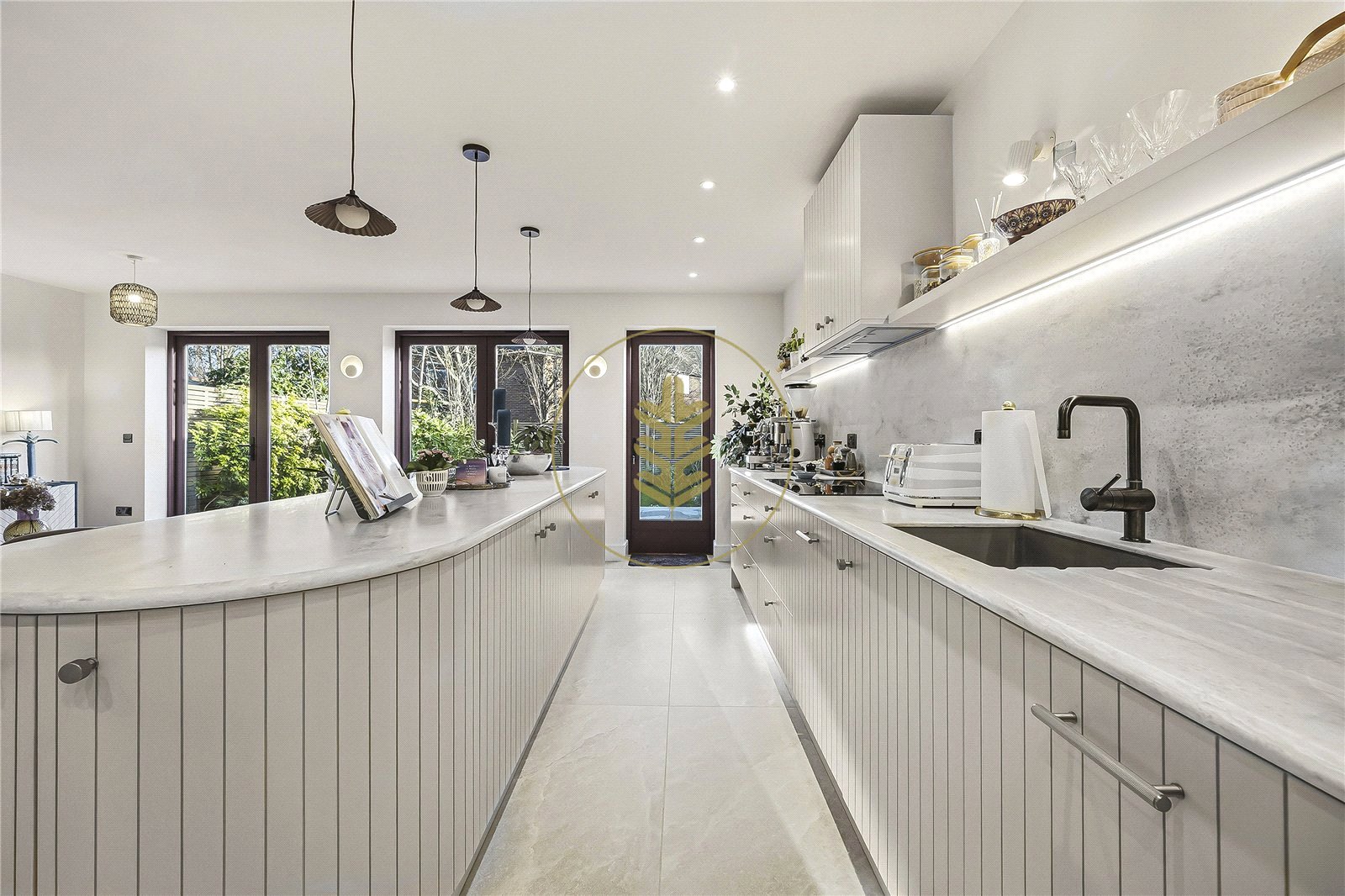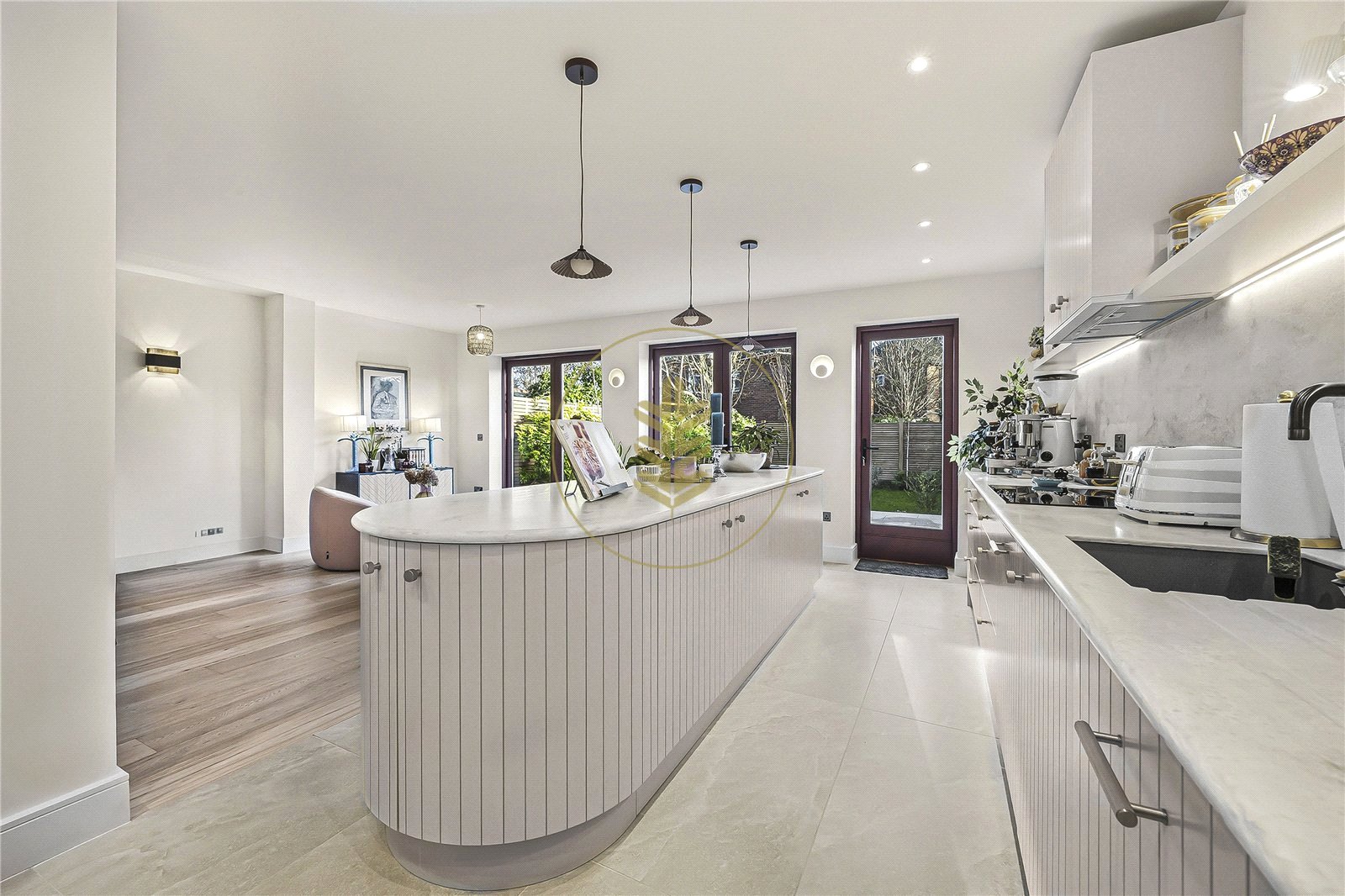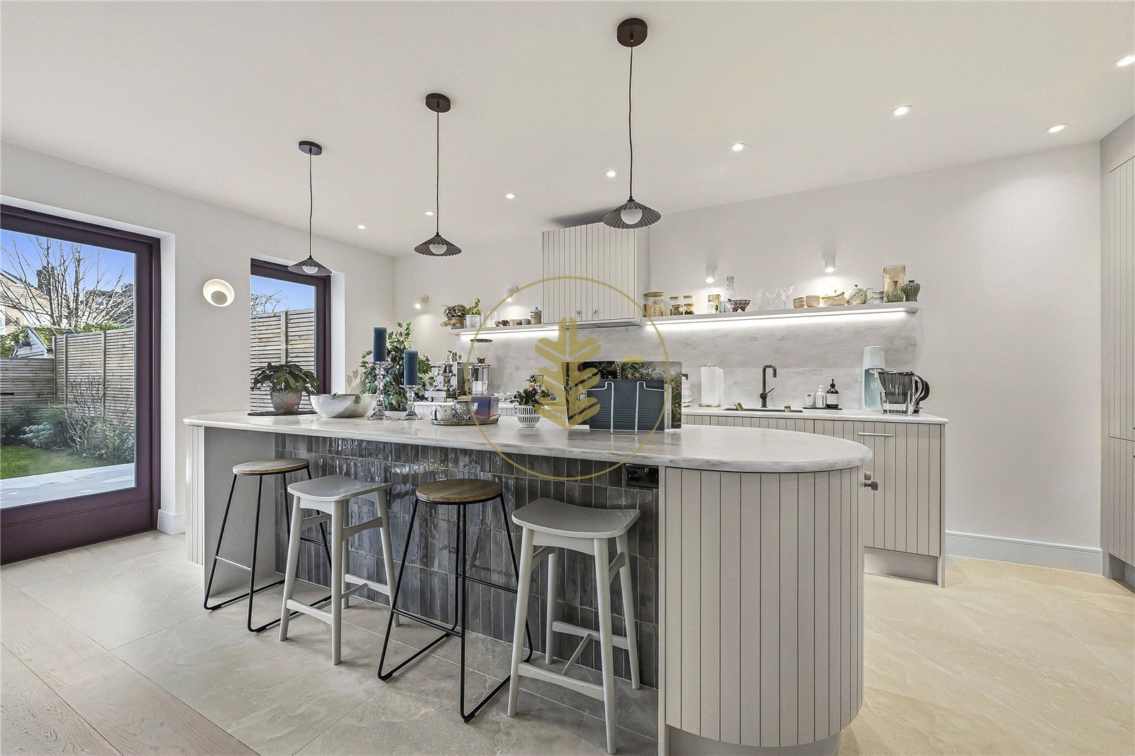 Step through the front door into a calm, open plan space where light flows uninterrupted from the bayfronted reception to the full width glazed kitchen. A bespoke island sits at its heart, a place to gather, cook, connect. Open the doors and step straight out into a landscaped garden, made for quiet mornings or long evenings with friends.