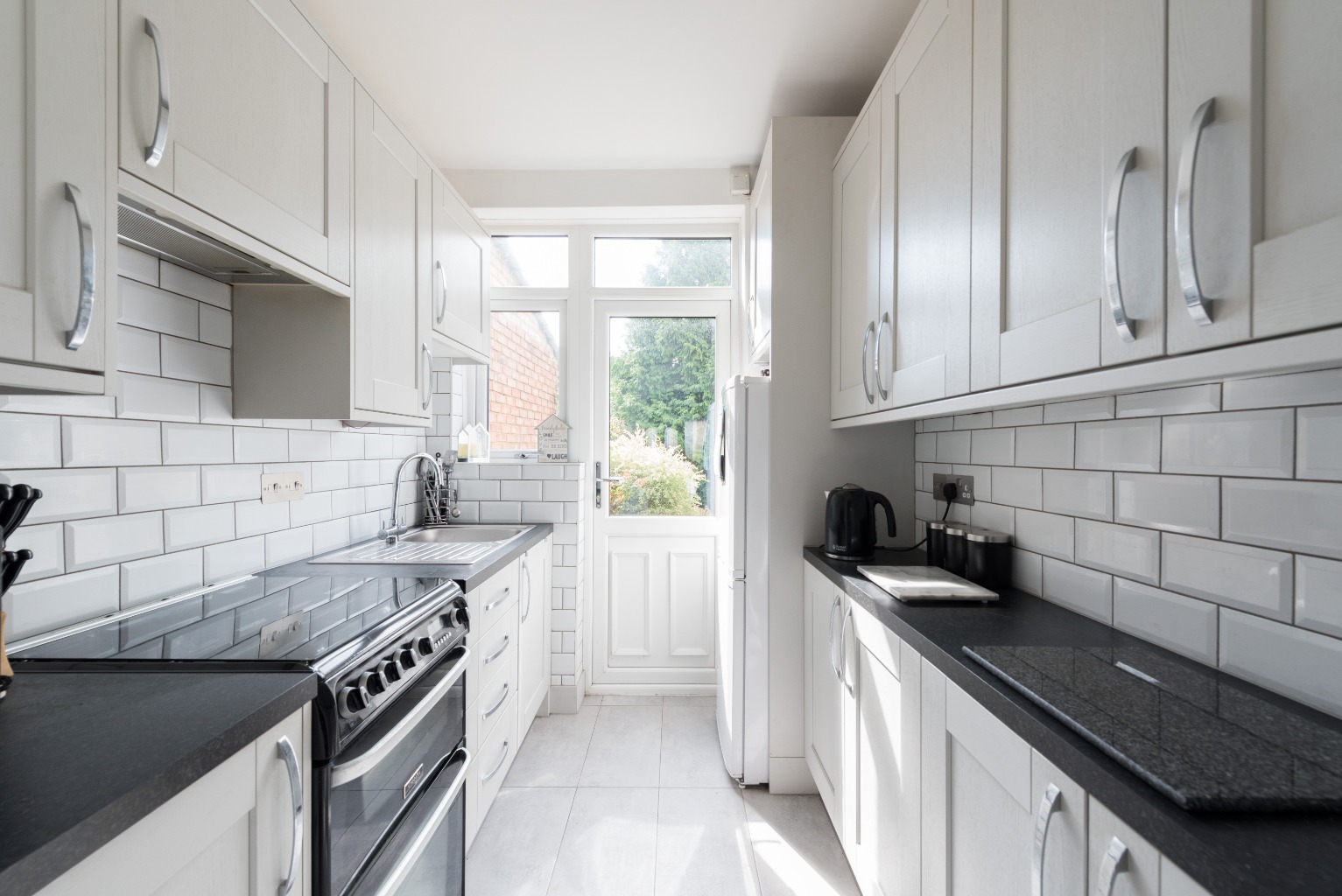 From the garden we can enter back into the property via the second external door, leading you directly into the perfectly formed and recently renovated kitchen. With smart, subway-style tiled walls, it's sleek, modern, well kept, light, and has room for all your essential modern appliances. There's a wide range of gorgeous gloss-finished base and wall units for stowing away your food, pots, pans and plates, and the black contrasting counter-tops add to the shiny, contemporary look.