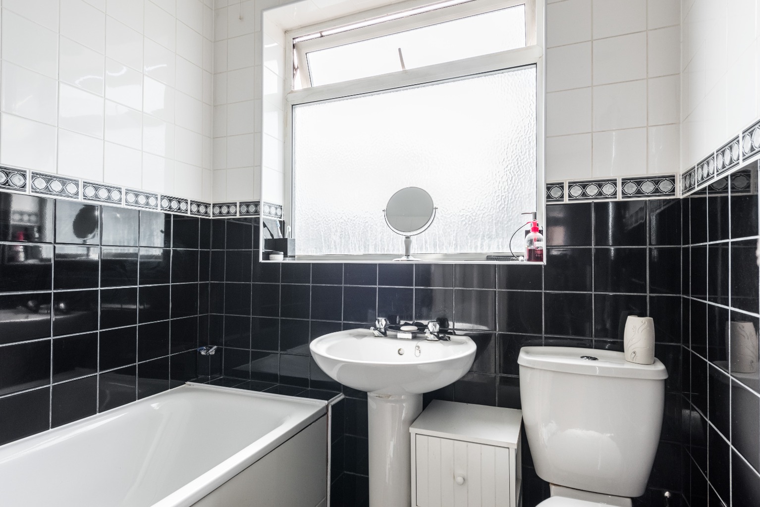 This room is fully tiled in a monochrome style and contains pearl white end-fill bath with overhead shower, sink, toilet and a tall heated towel rail. The large south facing window fills the bathroom with light, and it's been cleverly fitted to make the most of the available space.