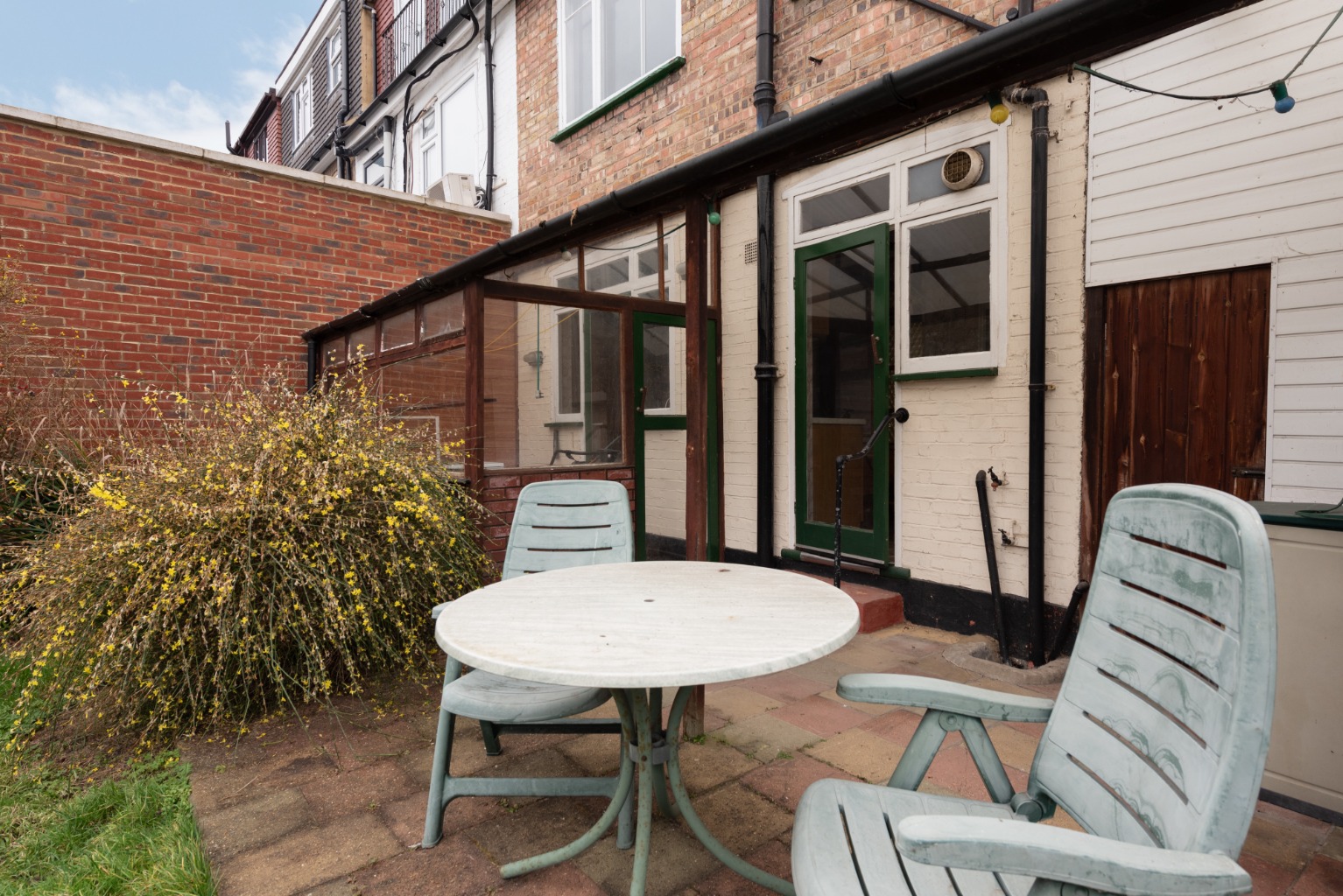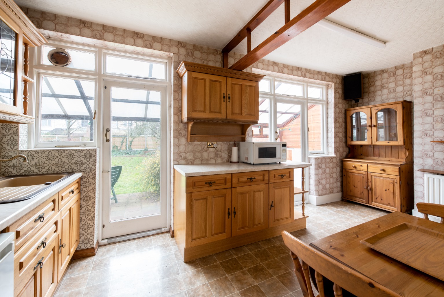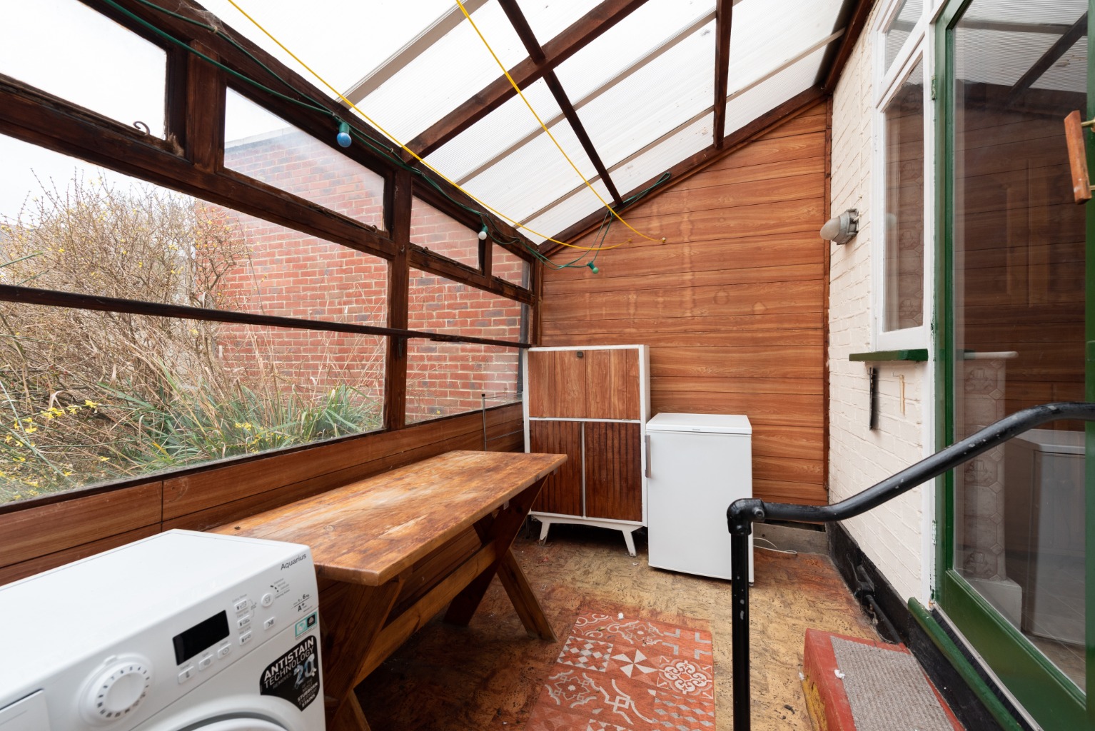 The rear wall of the kitchen is extensively glazed and has two glazed doors, one which leads into a lean-to conservatory and a second which leads to a covered patio. We’ll take the door to the conservatory first, which makes an ideal additional seating area and can also be used as utility space for a washing machine. A side door leads to the covered patio, which uses an extension of the glazed conservatory roof to offer an all-year-round outdoor seating area, and continues to the side of the property where there’s the enclosed access to the front of property.