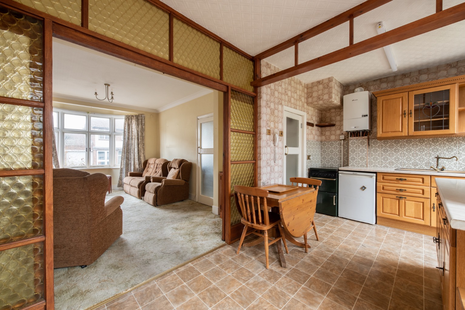 Opposite the bay window is a set of glazed sliding doors which provide access to the equally generous dining kitchen, and ensure that natural light flows throughout the downstairs of the property. The kitchen offers an array of base and wall cabinets in a shaker-style pine finish, with light coloured laminate work surfaces. There’s also a matching pine dresser built into an alcove to provide additional storage and workspace. The room is large enough to accommodate a family dining table, and there’s a free standing stove, large radiator and wall-mounted central heating boiler.