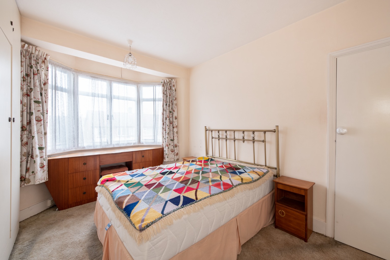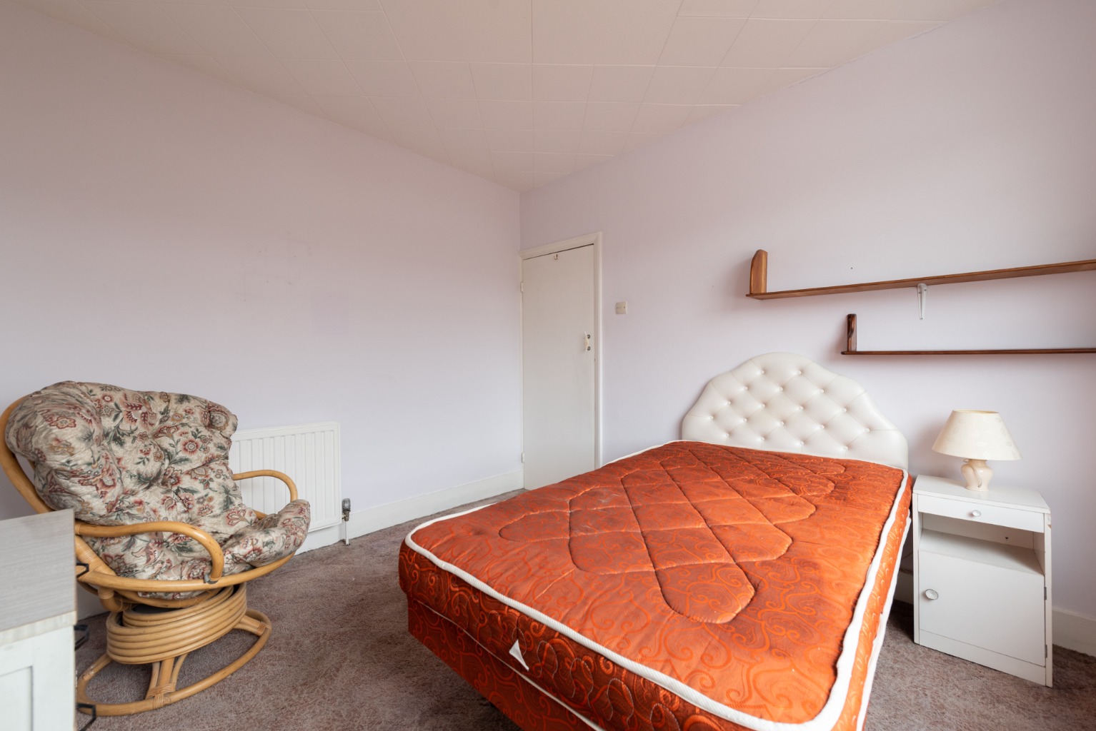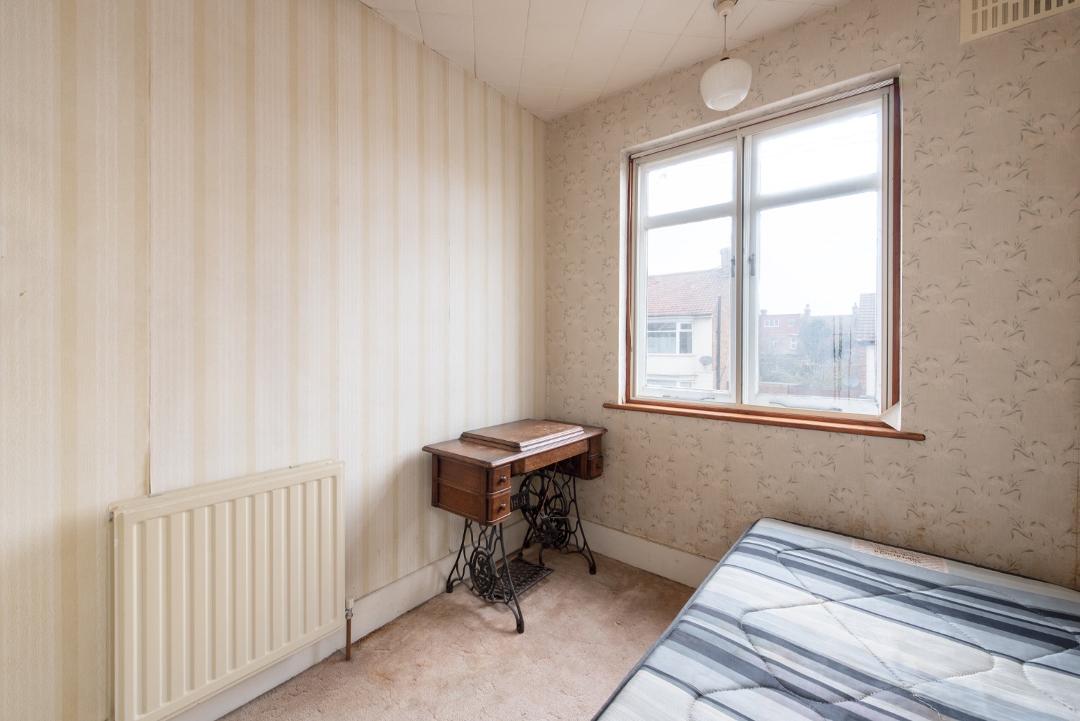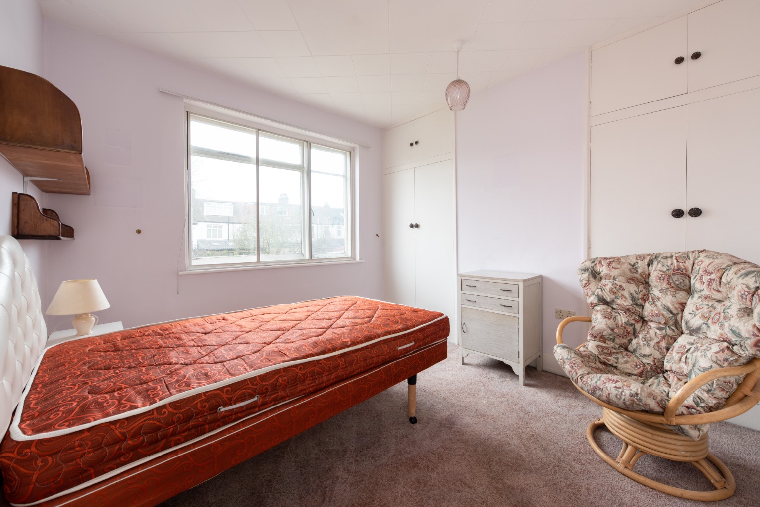 Back onto the landing and the next room to the left is bedroom two. This is a large double room which looks out onto the quiet rear garden through a large window. There are full height built-in wardrobes with storage above to either side of the chimney breast, and plenty of space for a large double bed, bedside cabinets and additional storage. Decoration is simple with white walls and a warm tan coloured carpet. There’s generous wall space for your favourite artwork and the chimney breast would accommodate a large, mounted mirror and would also be the ideal location for a dressing table below.