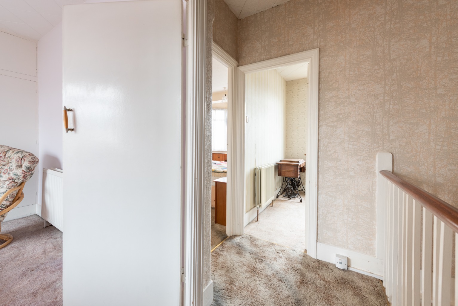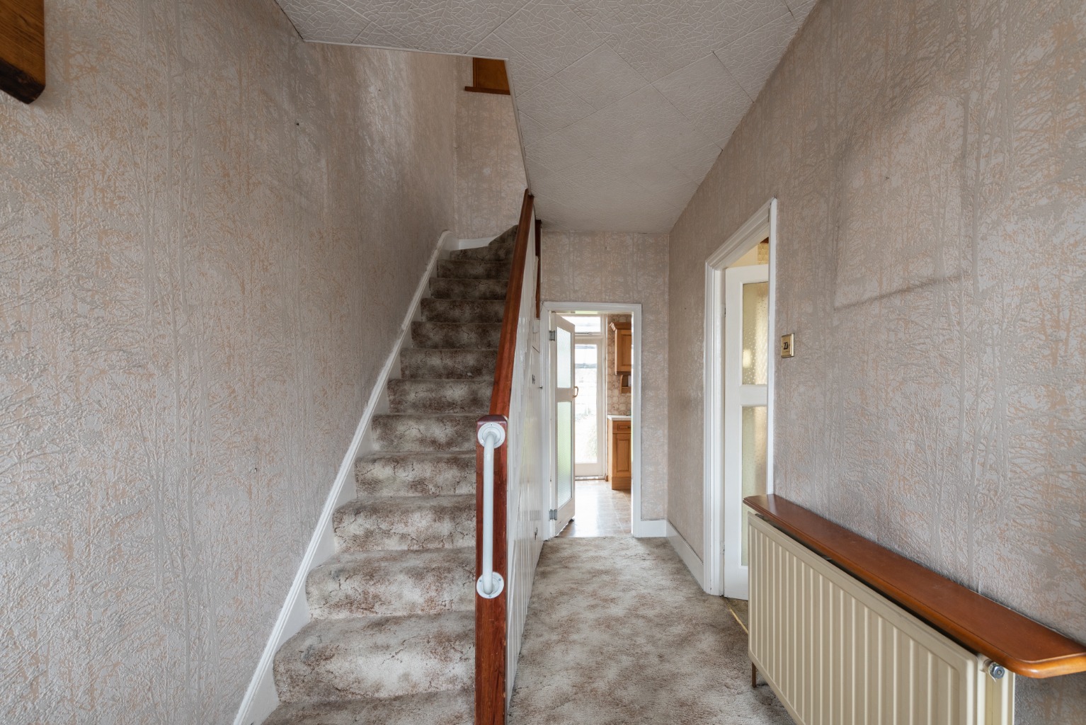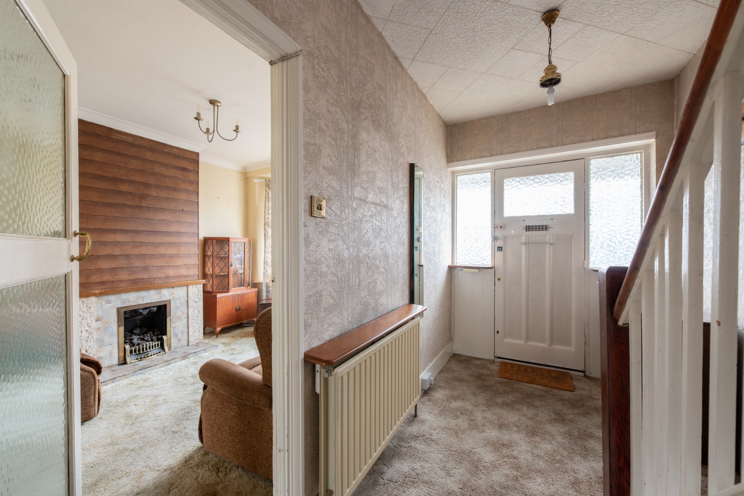 Step through the front door and you’ll find yourself in a bright and spacious hallway with stairs to the first floor and access to the ground floor rooms. There’s a grey patterned carpet which extends to the reception room, stairs and landing, along with complementary wallpaper. Natural light floods in from the extensive glazing to either side of the front door and there’s also a large central heating radiator to guarantee a warm welcome.