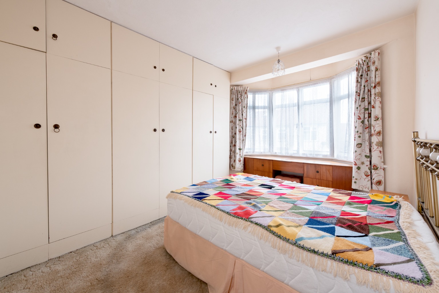 Return to the landing and now into the bright and airy main bedroom. Here you’ll find an extensive run of built-in wardrobes with storage above and, befitting its status as the main bedroom, an impressive bespoke dressing table built into the bay window with drawers either side – a luxury that fits well into the scale of this room. There’s plenty of space left for a double or king-size bed plus additional storage furniture. Once again, there’s a tan carpet and walls are finished in a warm and calming rich cream. There’s also a large radiator to guarantee a comfortable night’s sleep.