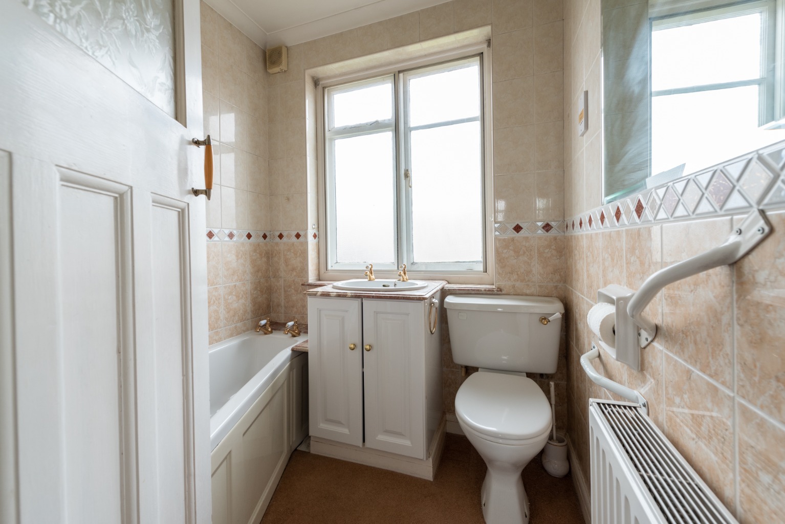 The first door to the left takes you into the family bathroom. The walls are fully tiled with cream and brown mottled pattern ceramic tiles and there’s a practical contrasting vinyl floor. The white three piece bathroom suite comprises a bathtub, W.C. and vanity unit with inset washbasin. There’s a large window with frosted glass, a wall mounted mirror and a large radiator.