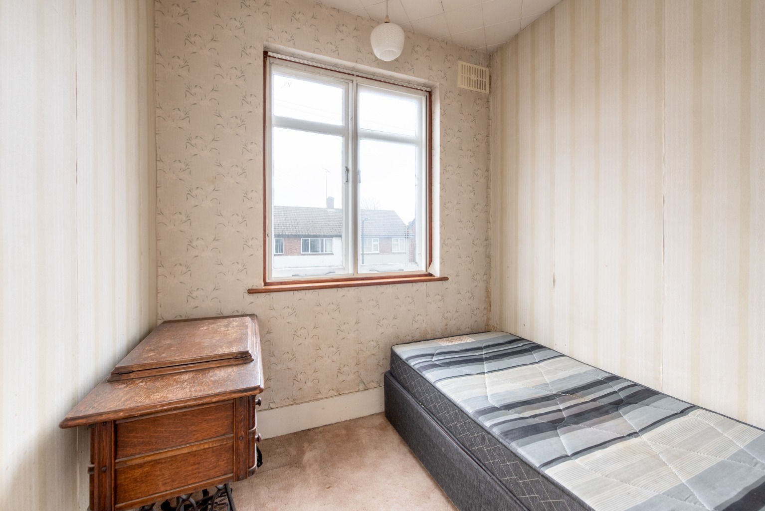 The final room off the landing is bedroom three. Lying to the front of the property, this room would be an ideal child’s bedroom with space for a single bed and additional storage furniture. This room could also work well as a study with room for a large desk and bookcases. Decoration follows the theme of the other bedrooms with a tan carpet and light coloured walls – on this occasion, finished in a wallpaper of warm cream and taupe.