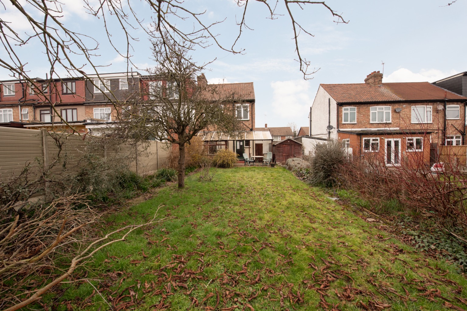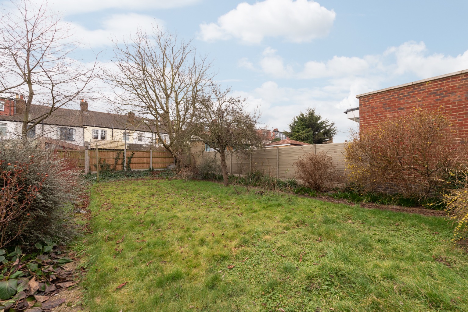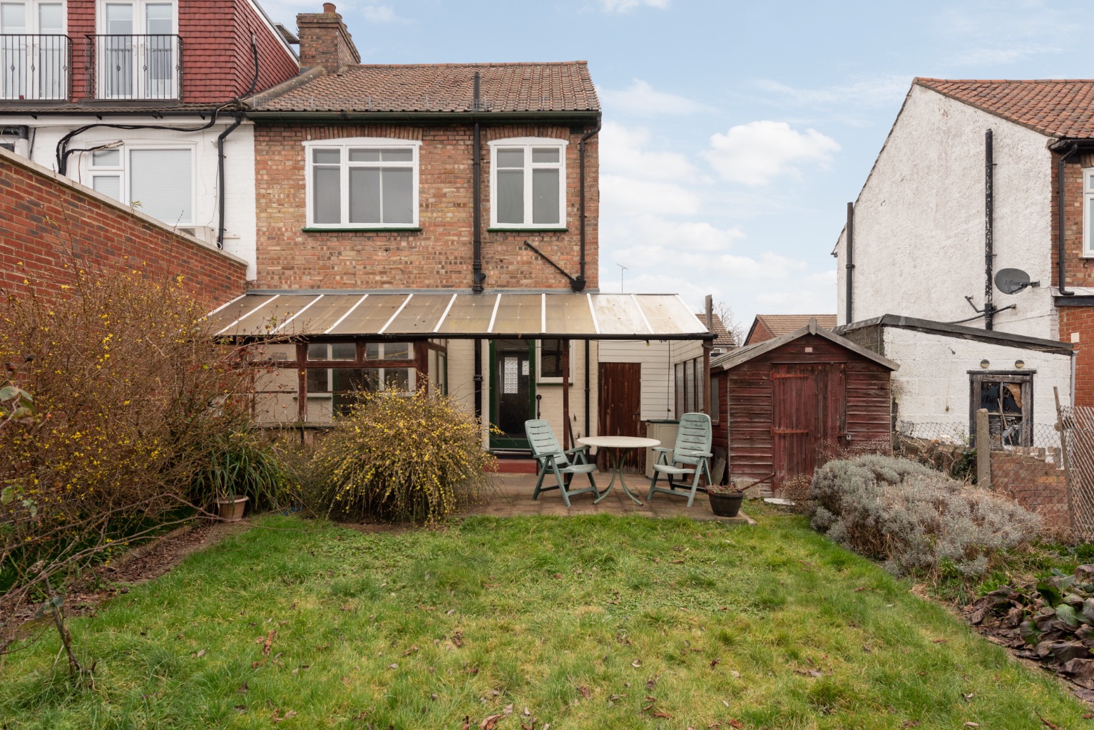 The wider than average plot allows for a large rear garden, which is currently laid to a combination of lawn and borders with mature shrubs. The garden’s south-west facing aspect makes this the ideal location for outdoor entertaining and would benefit from an extension of the outdoor seating area to further increase space for lounging and dining. There’s also a useful timber out-building to the side of the terrace.