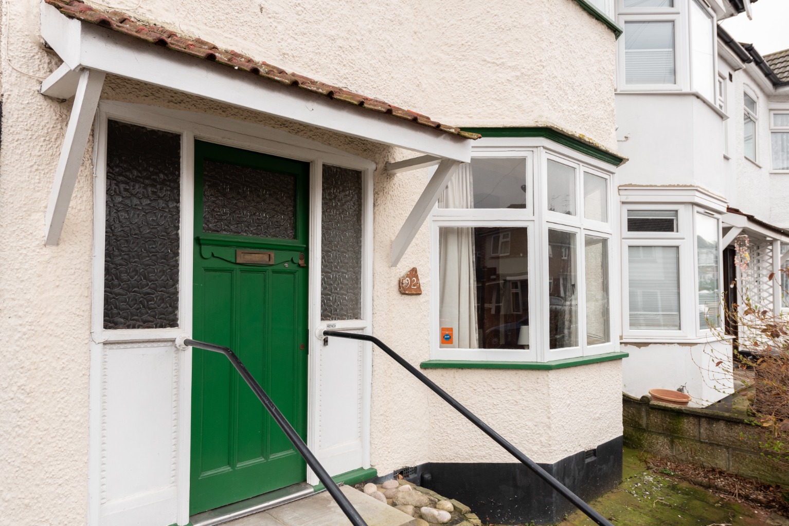 On a quiet street with resident’s only parking, the property occupies a large plot with a gated driveway and garage to the side, along with secure access to the rear of the property, via a gated pathway between the garage and house. There are nice architectural touches typical of the period of the property, with a double height bay window and well preserved original front door and side glazing with canopy above. The façade is rendered and finished in a soft cream. The welcoming front garden is accessed via a separate pedestrian gate, set into the low stone garden wall, with a small set of steps up to the green painted front door.