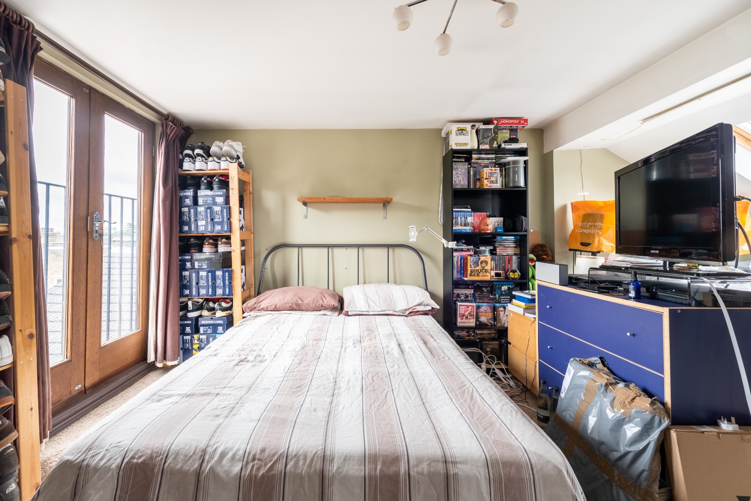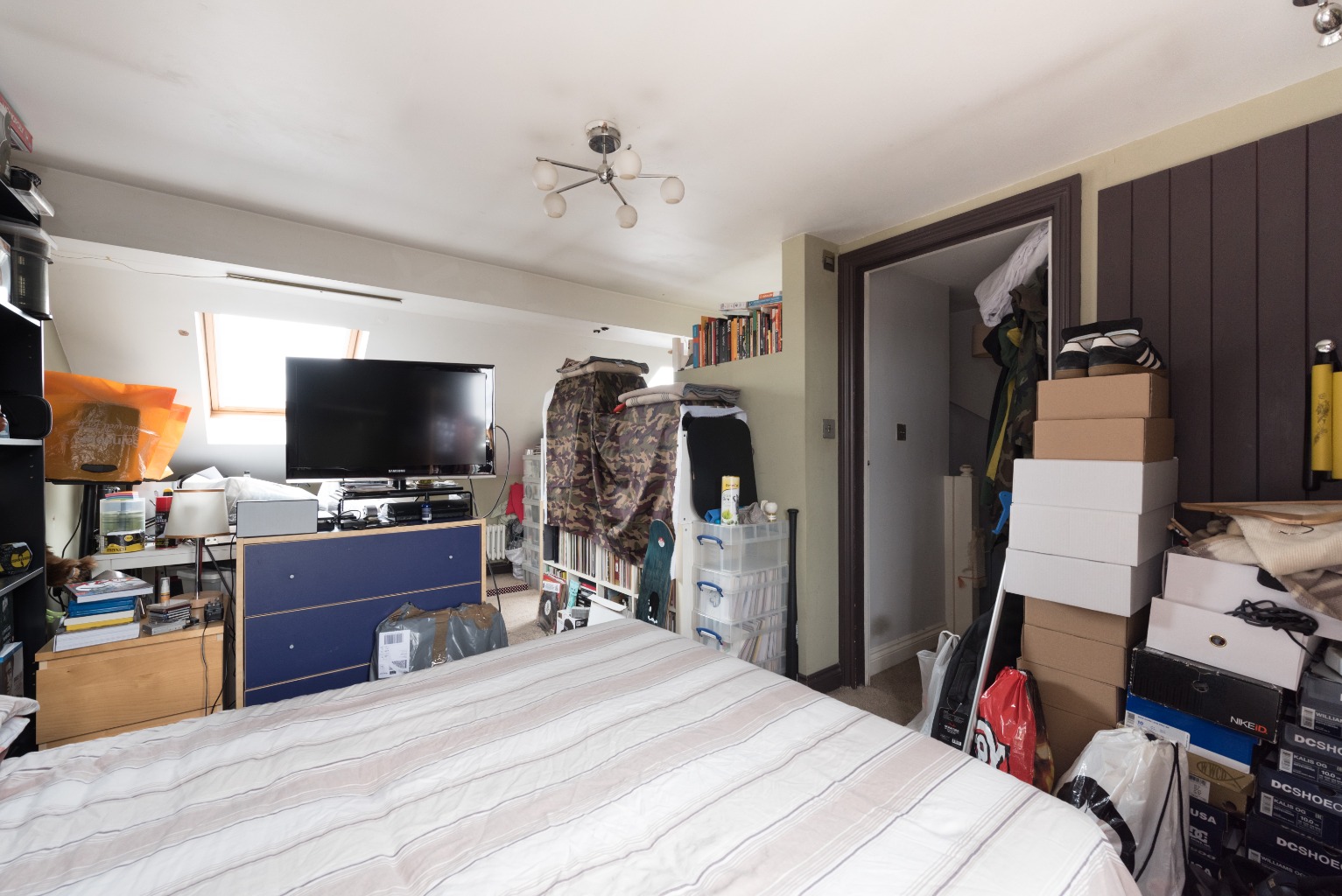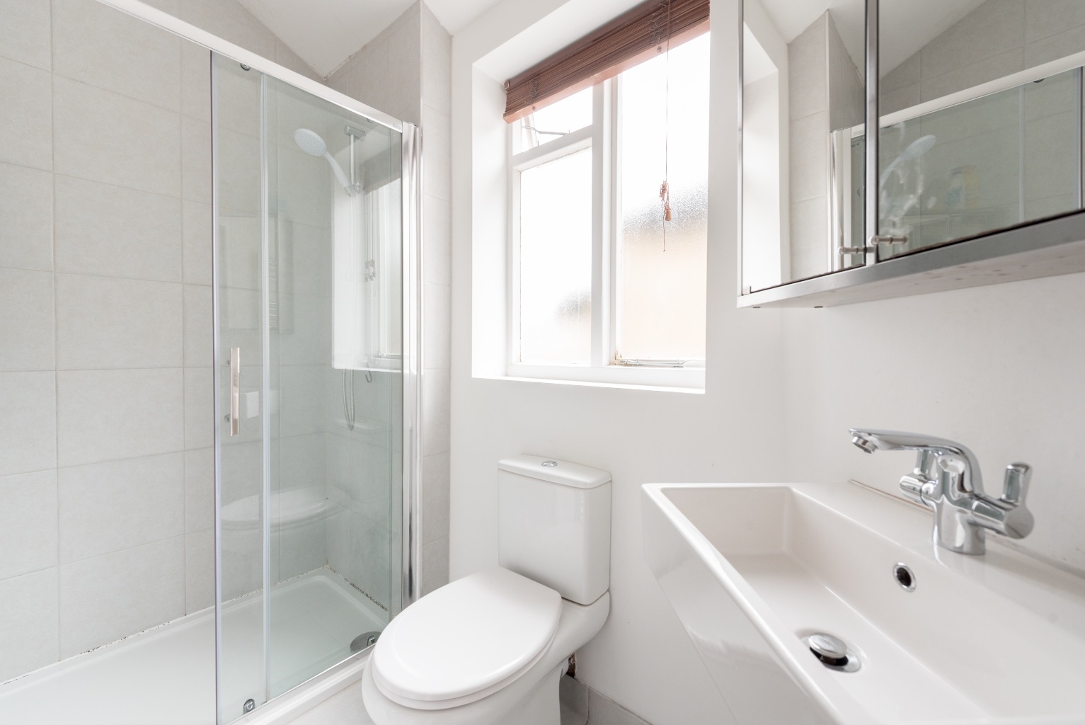 The landing that lends access to the reception room, bedroom and potential study space also has a further staircase which leads up to the wonderful loft conversion and its showcase double bedroom. Here, there is plenty of in-built storage space with a built-in wardrobe and eaves storage. The space is well-lit with natural light coming in from the Velux windows built into the sloping ceiling on one side and a juliet balcony overlooking the garden on the other. A decently sized double bedroom, its perfect purpose as the master is made only more compelling by the easy access to the cleverly designed addition of an en-suite bathroom. Light olive walls are met with natural slate marble tiling, and there's also storage space provided under the sink. This bathroom has a toilet, sink unit and a gorgeous freestanding bath, a fantastic way to wind down at the end of a long day.