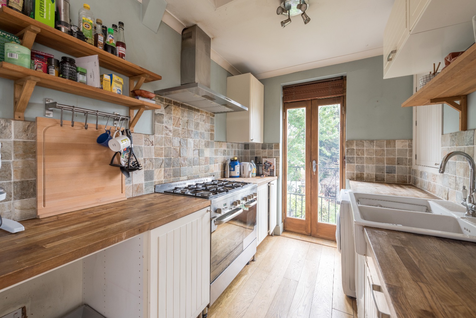 Straight ahead, is the doorway into a spacious kitchen/diner. This versatile space is an example of truly clever and stylish interior décor. The room is long and sprawling, with lovely sandy wooden flooring and beige walls with a hint of blue. The room is finished off by a wooden juliet balcony at the end, allowing your eye-line to reach out over a private garden, flooding the room with natural light and a sense of privacy and nature. There's plenty of space for seating and a dining table in the first, wider part of the room making another social area to entertain in. The antique-white wooden kitchen units are overlaid with classic wooden countertops, and the matching overhead cabinets provide further handy storage space. These are all beautifully framed by the natural marbled slate tiling lying between. The kitchen is fitted with a fantastic two oven and five ring cooker unit and there's also an inbuilt cupboard as well as a tall slim cupboard for hiding away cleaning equipment and ironing board etc.