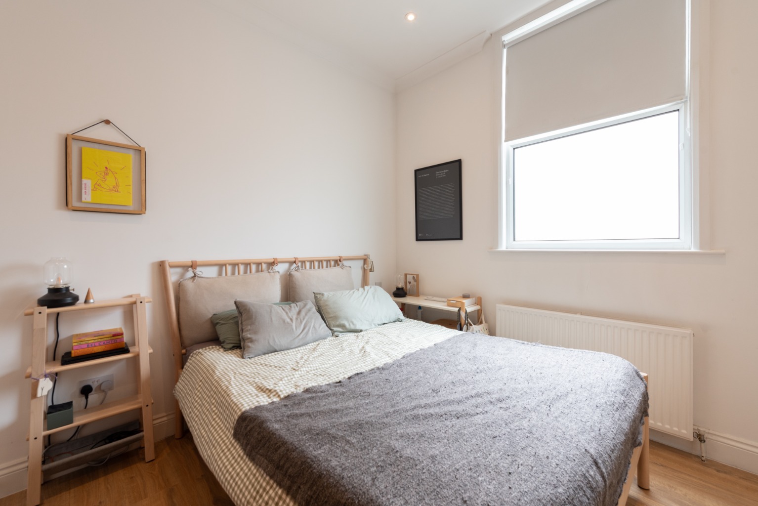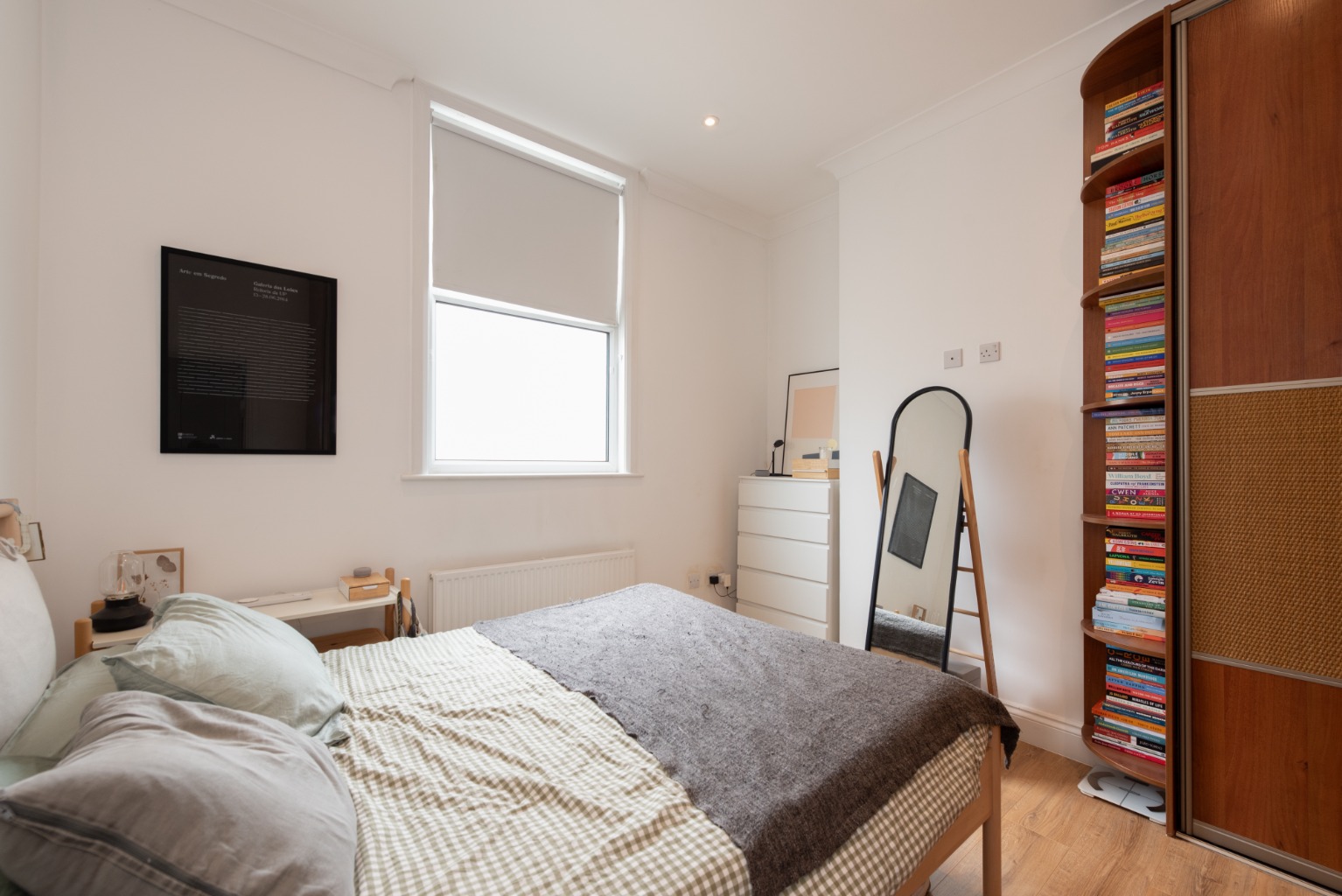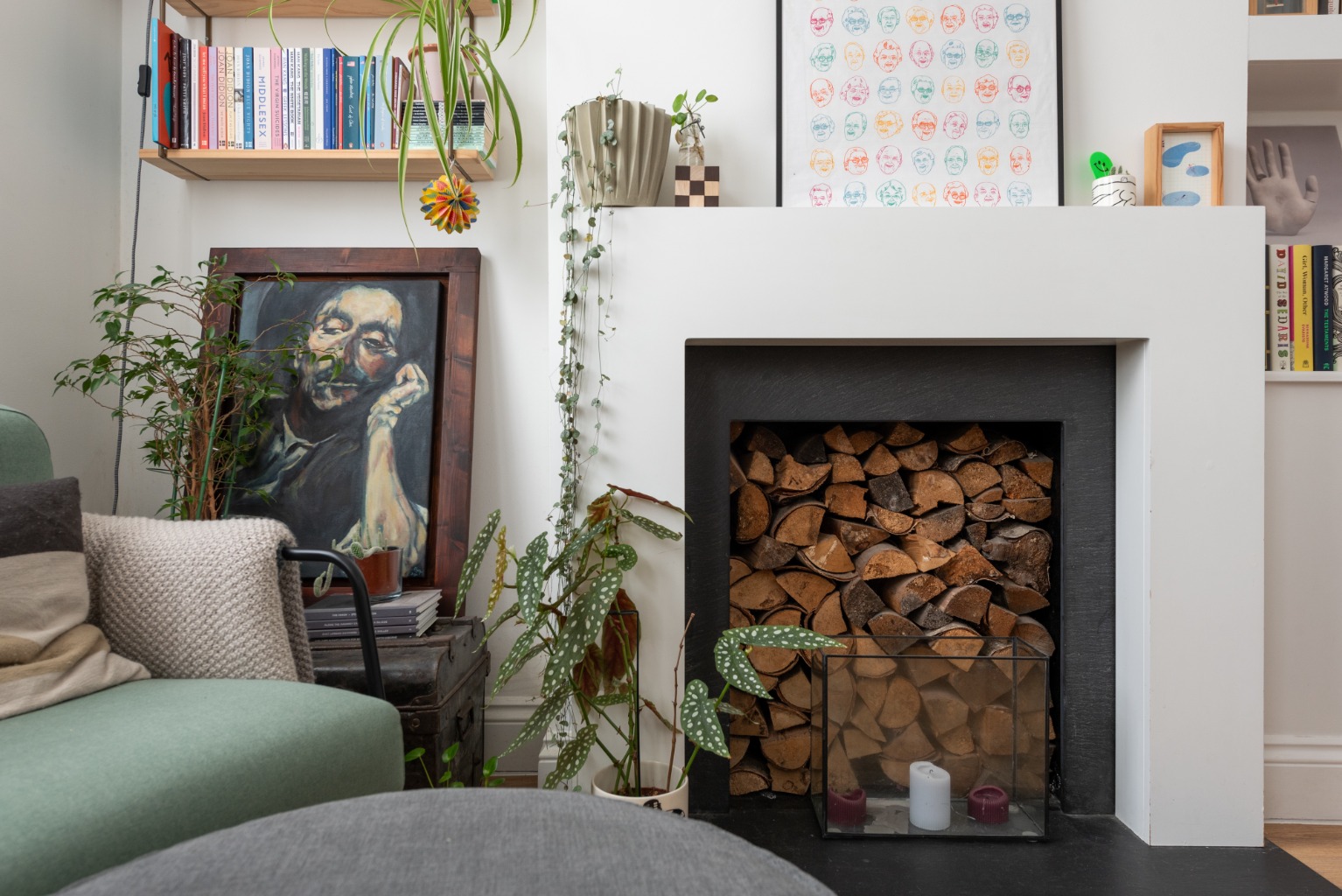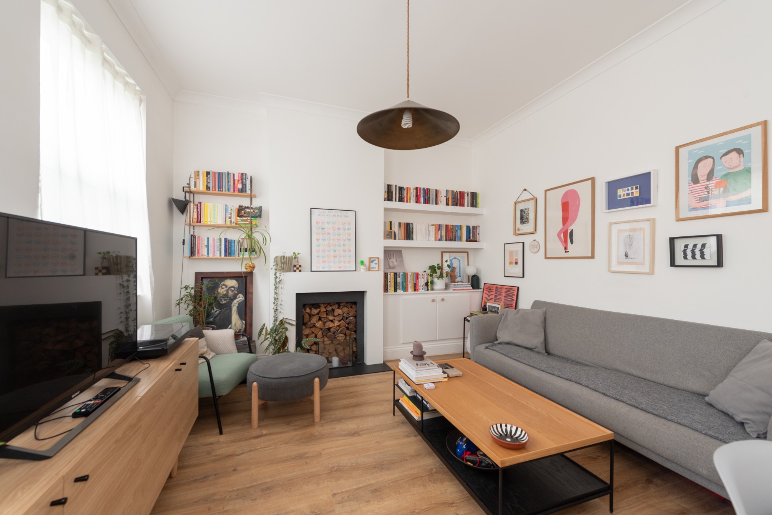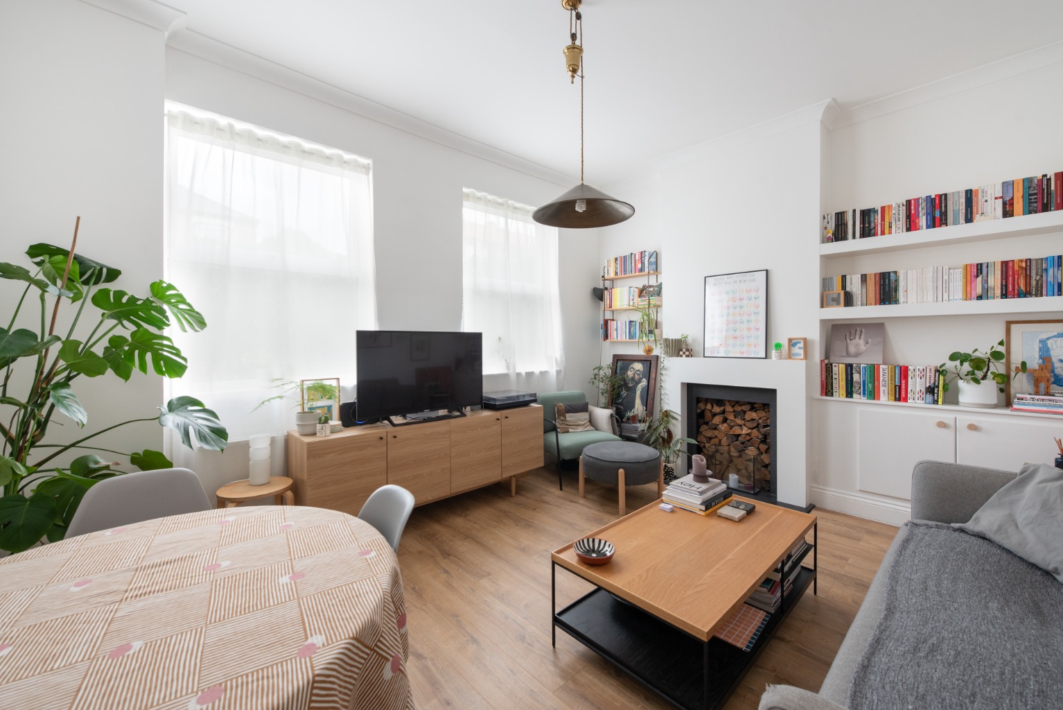 The large, bright reception room features twin windows overlooking the front garden, an original fireplace, and built-in storage and bookshelves in the alcove to one side of the chimney breast.