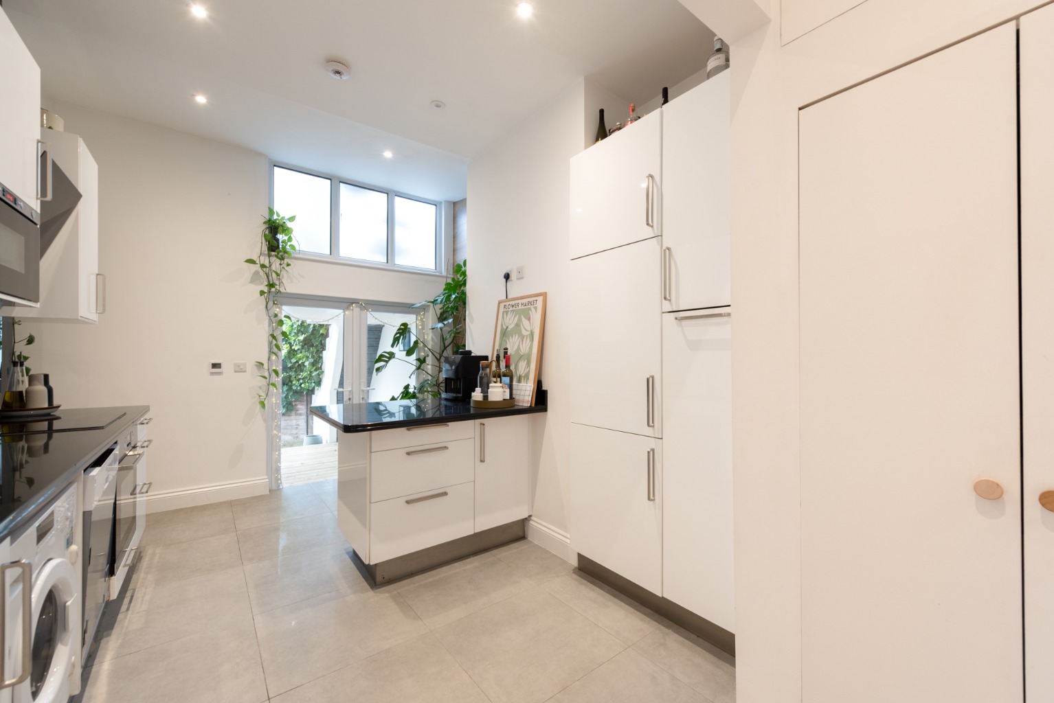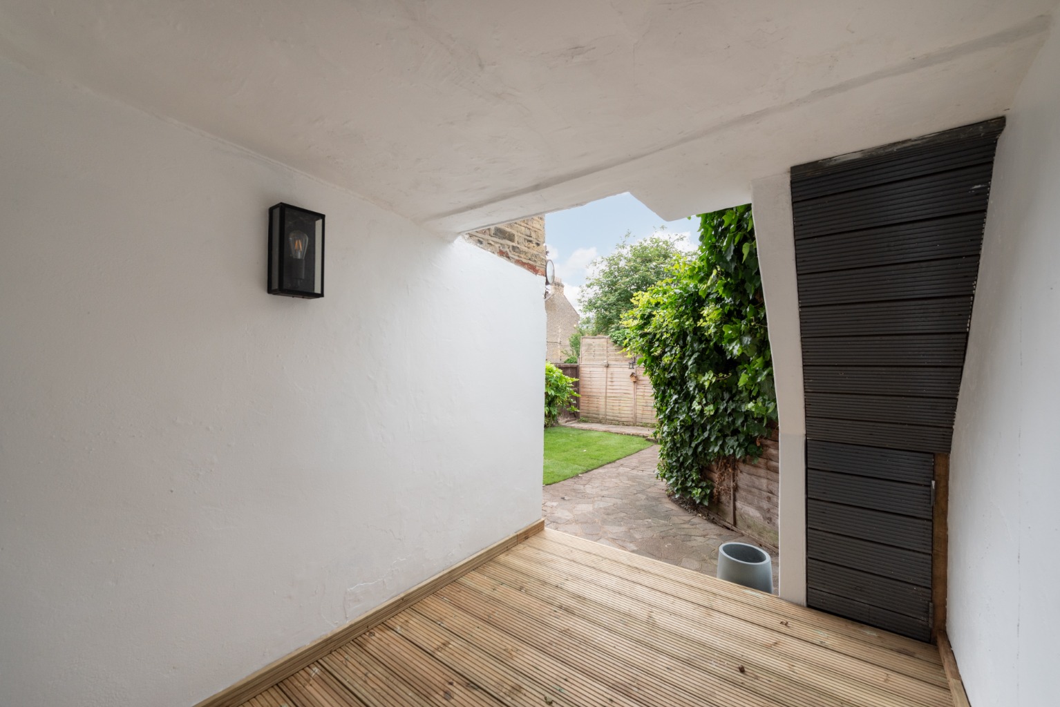 Bedroom one is a large double with a generous run of built-in wardrobes, and room for a comfy double bed and additional furniture. A second internal hallway provides access to the bathroom and second bedroom. The beautifully appointed bathroom has large-format floor-to-ceiling tiling, an illuminated mirror and contemporary suite including WC, pedestal basin and P-shaped bath with multi-jet shower and curved glass screen. The second bedroom is a small double with useful built-in storage. Very much the heart of this home is the well-planned and stylish kitchen. A large range of gloss white cabinets are topped by contrasting solid surface worktops, including a peninsular with space for informal dining. Integrated appliances include a washing machine, fridge-freezer, dishwasher, oven and microwave, plus an inset black glass induction hob and extractor. Beyond the peninsula an area with a feature timber clad wall offers opportunity for a study space or reading nook overlooking the covered deck area – which is accessed via wide French windows with a large transom window above, flooding the space with natural light. The covered deck offers a sheltered outdoor living space with views out to the lovely south-east facing garden with its paved terrace and lawn, bounded by mature greenery. The property also benefits from a secure parking space at the end of the garden, accessed through double gates via a drop-kerb from the adjacent street. The property is in enviable location close to the Francis Road area of Leytonstone, known for its preserved pedestrianised area with many small independent businesses, including shops, cafes, restaurants and pubs. Local hospitality highlights include the Yardarm, the Northcote Arms and the Marmelo Kitchen. An array of other amenities can be found along Leytonstone High Road and the surrounding area, including supermarkets and retail parks. Leytonstone Central Line tube station and Leyton Midland Road Overground stations are both just a ten-minute walk. Hollow Pond, Leyton Flats Hackney Marshes and Wanstead Flats - all of which are close by - offer beautiful walks and outdoor activities, and Leytonstone Leisure centre with its gym, swimming pool and fitness classes is a fifteen-minute walk.
