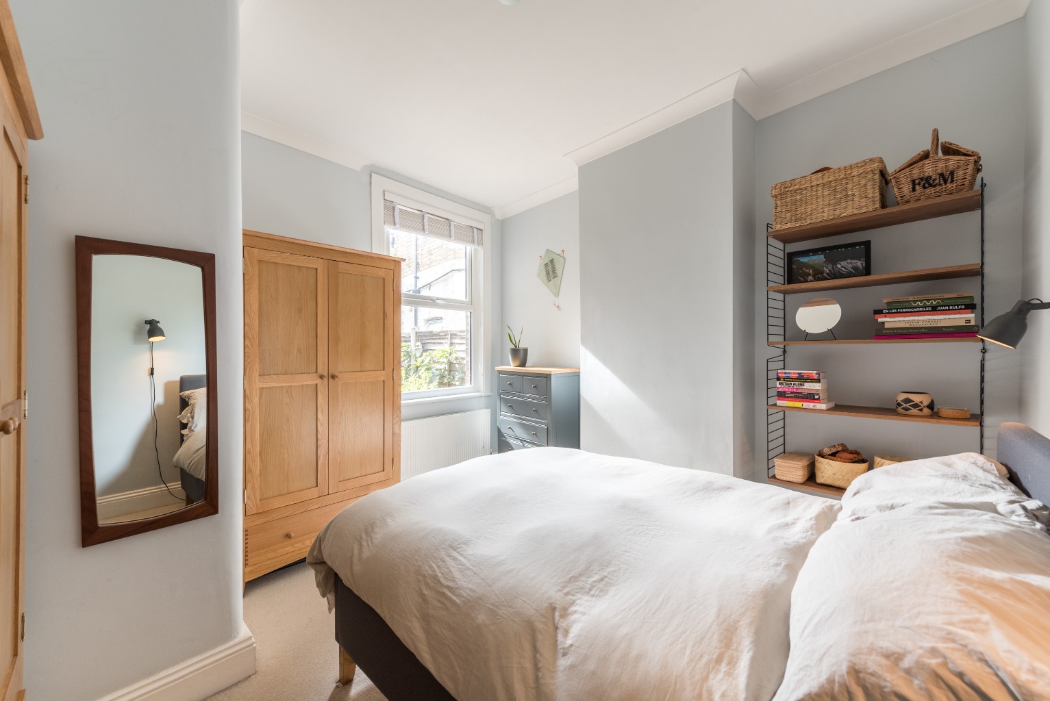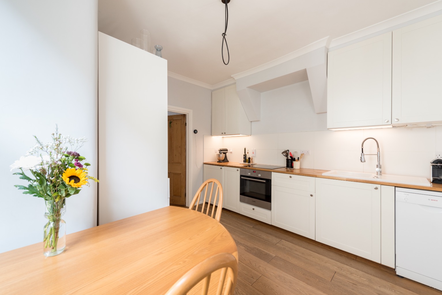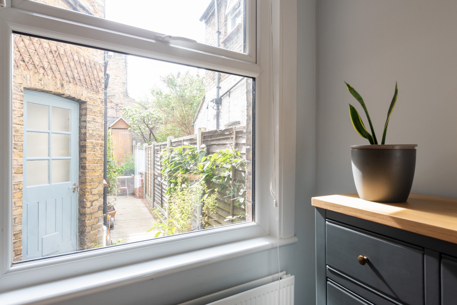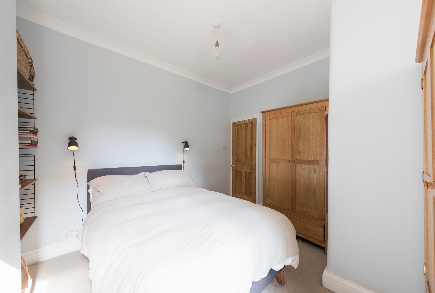 The next door along, also to your right, is bedroom one, an equally good size room – perfect for your cosy double bed and all your storage requirements, with the current owner using the space to house two double wardrobes and a large chest of drawers. The light eggshell blue walls and pale beige carpet offer a ready-to-move-into space, which could easily be personalised with your own artworks, bedding and perhaps a rug in your chosen colour accent. Tidy and bright, the room overlooks the rear garden and is a gorgeous spot to relax and unwind in after a busy day. Back in the hallway and to your left before you enter the kitchen/diner up ahead, you’ll note a very useful storage cupboard, which is large enough to accommodate for your cleaning equipment, spare bedding… well, whatever you need it for! The characteristic oak flooring continues through into the spacious kitchen/diner, offering a well-planned complement to the matching oak worktops. The natural wood elements are brightened and brought to life by the stylish cream base and wall units, and a large butler’s sink, while the pale blue walls add a little touch of colour to create a harmonious finish to this gorgeous space. The area by the window is the ideal spot for a dining table, and there’s room enough to entertain family or friends should you wish to show off your new flat to your favourite people. Straight ahead, across the kitchen from its hallway entrance, lies the second bedroom in this property, is filled with plenty of natural light and decorated in the same charming blue with engineered wooden floor. This would make a cosy kid’s room or nursery, a handy guest room a fantastic home office depending on your situation and lifestyle needs – or with a sofa bed and desk, you could make it a multi-purpose space. The next room, also leading from the kitchen, is your smart, modern bathroom – which you enter through your small side entrance lobby (more on that soon)… Well-designed and super-stylish, the three piece white suite of WC, sink and bath (with overhead shower and screen) works wonderfully with the grey cupboard and painted accents, black floor tiles and large subway tiles above the bath. A small but serviceable space that is clean, tidy and in great condition. Stepping out of the bathroom, take a left into the small lobby area separating it from the kitchen, and you’ll see a half-glazed external door which takes you to your 21ft private rear garden – the ideal retreat on finer days. Leading first into your side return, follow the path up and you’ll find yourself on a small patio area, perfect for a table and chairs for lunch al fresco or a sundowner on a summer’s evening. The garden then climbs up a level, with a couple of small sets of steps running alongside the shrubbery borders and leading to a useful shed at the very top of the space. Along with its inherent charm, this two bedroom flat comes with gas central heating and double glazing throughout, and the current owner will be leaving the fitted blinds in both the reception room and main bedroom.