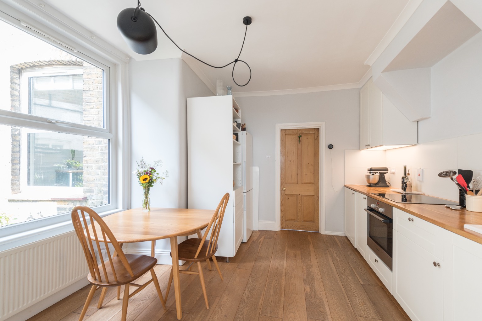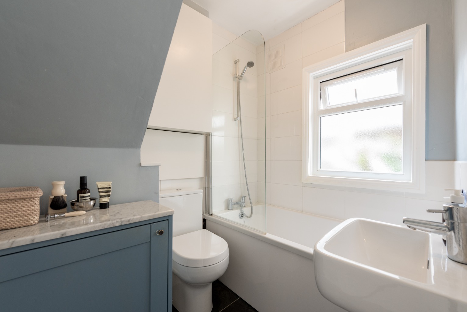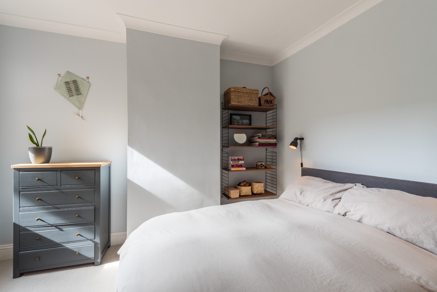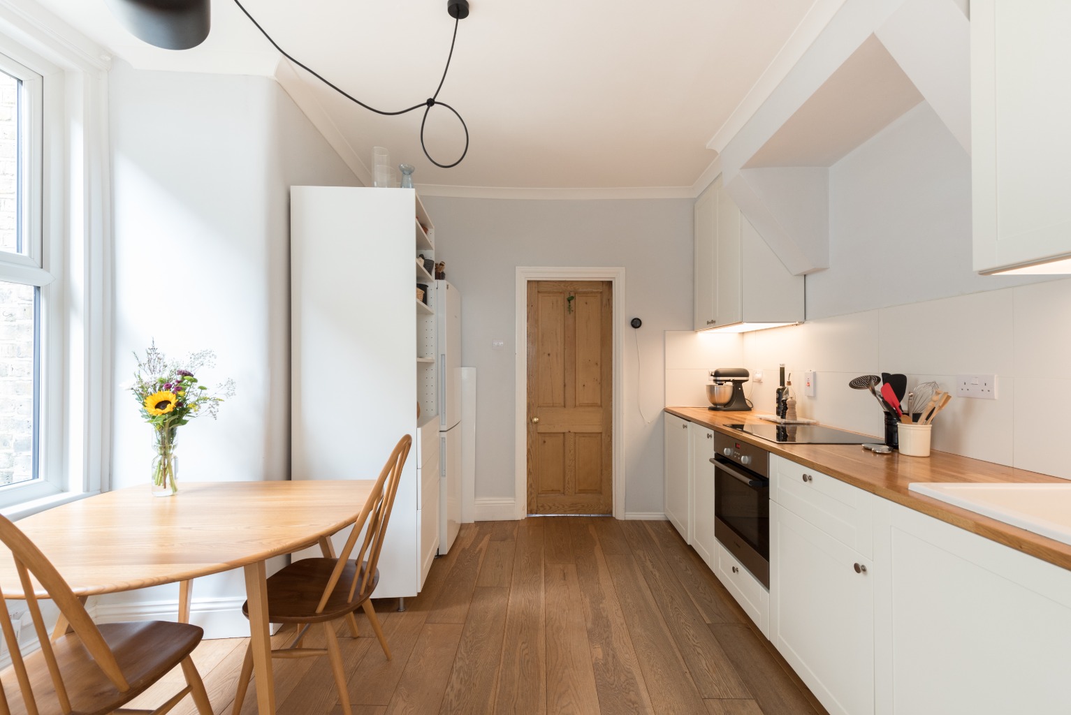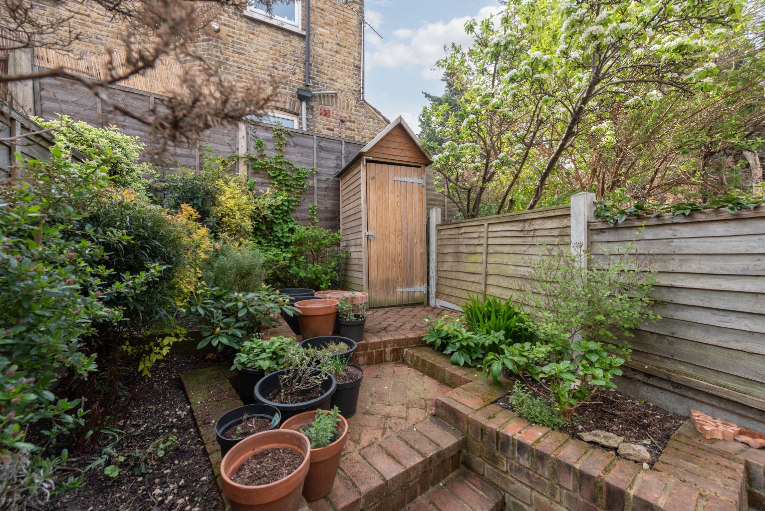 The next door along, also to your right, is bedroom one, an equally good size room – perfect for your cosy double bed and all your storage requirements, with the current owner using the space to house two double wardrobes and a large chest of drawers. The light eggshell blue walls and pale beige carpet offer a ready-to-move-into space, which could easily be personalised with your own artworks, bedding and perhaps a rug in your chosen colour accent. Tidy and bright, the room overlooks the rear garden and is a gorgeous spot to relax and unwind in after a busy day. Back in the hallway and to your left before you enter the kitchen/diner up ahead, you’ll note a very useful storage cupboard, which is large enough to accommodate for your cleaning equipment, spare bedding… well, whatever you need it for! The characteristic oak flooring continues through into the spacious kitchen/diner, offering a well-planned complement to the matching oak worktops. The natural wood elements are brightened and brought to life by the stylish cream base and wall units, and a large butler’s sink, while the pale blue walls add a little touch of colour to create a harmonious finish to this gorgeous space. The area by the window is the ideal spot for a dining table, and there’s room enough to entertain family or friends should you wish to show off your new flat to your favourite people. Straight ahead, across the kitchen from its hallway entrance, lies the second bedroom in this property, is filled with plenty of natural light and decorated in the same charming blue with engineered wooden floor. This would make a cosy kid’s room or nursery, a handy guest room a fantastic home office depending on your situation and lifestyle needs – or with a sofa bed and desk, you could make it a multi-purpose space. The next room, also leading from the kitchen, is your smart, modern bathroom – which you enter through your small side entrance lobby (more on that soon)… Well-designed and super-stylish, the three piece white suite of WC, sink and bath (with overhead shower and screen) works wonderfully with the grey cupboard and painted accents, black floor tiles and large subway tiles above the bath. A small but serviceable space that is clean, tidy and in great condition. Stepping out of the bathroom, take a left into the small lobby area separating it from the kitchen, and you’ll see a half-glazed external door which takes you to your 21ft private rear garden – the ideal retreat on finer days. Leading first into your side return, follow the path up and you’ll find yourself on a small patio area, perfect for a table and chairs for lunch al fresco or a sundowner on a summer’s evening. The garden then climbs up a level, with a couple of small sets of steps running alongside the shrubbery borders and leading to a useful shed at the very top of the space. Along with its inherent charm, this two bedroom flat comes with gas central heating and double glazing throughout, and the current owner will be leaving the fitted blinds in both the reception room and main bedroom.