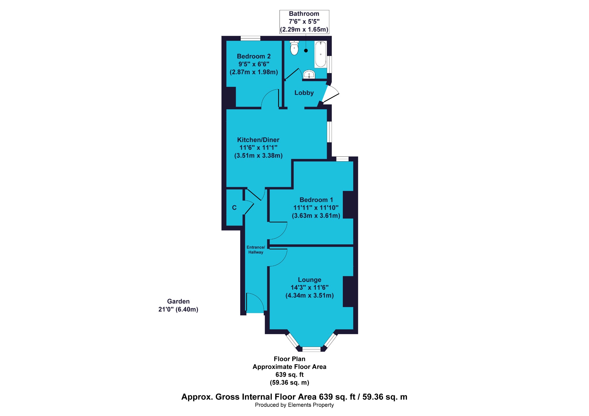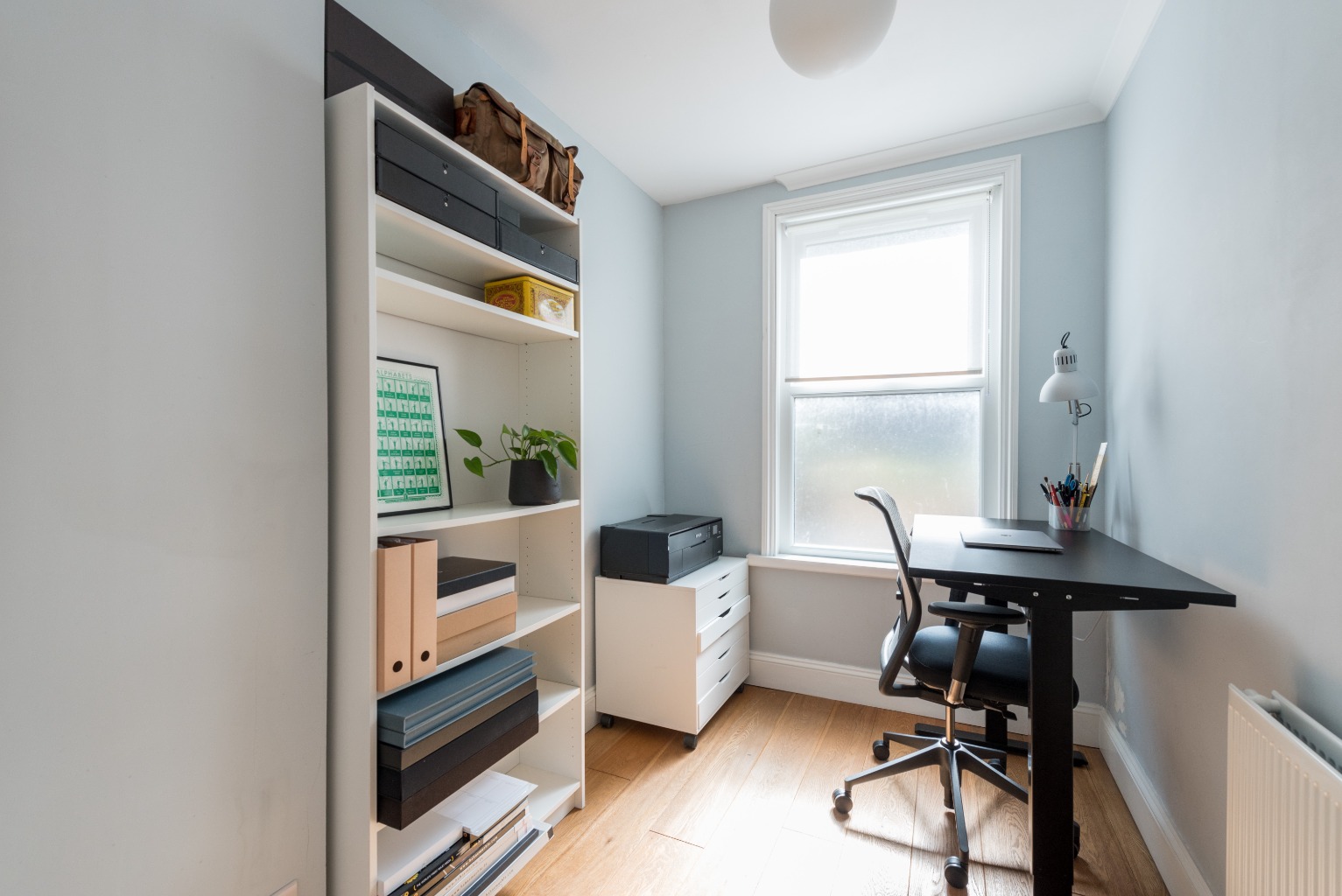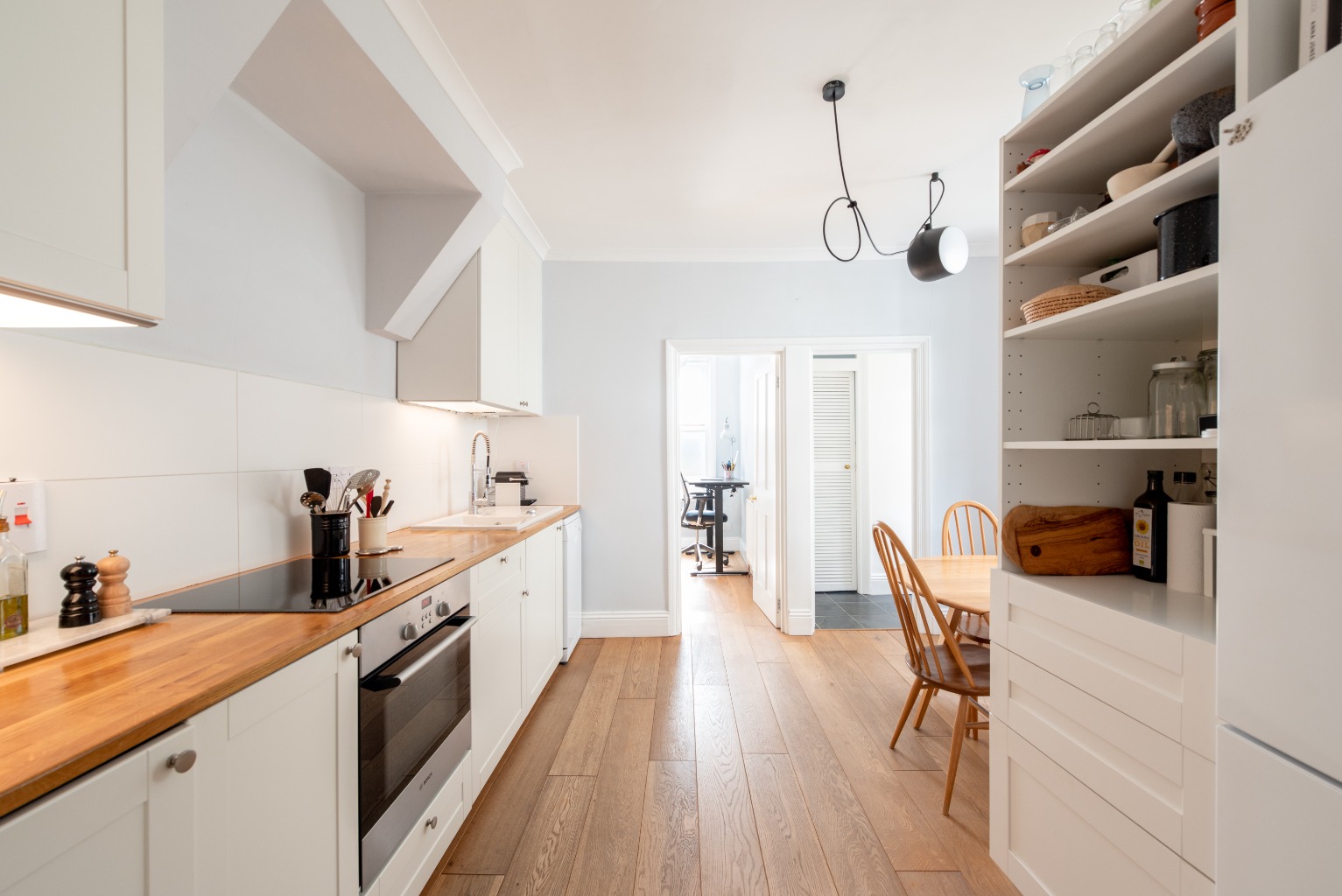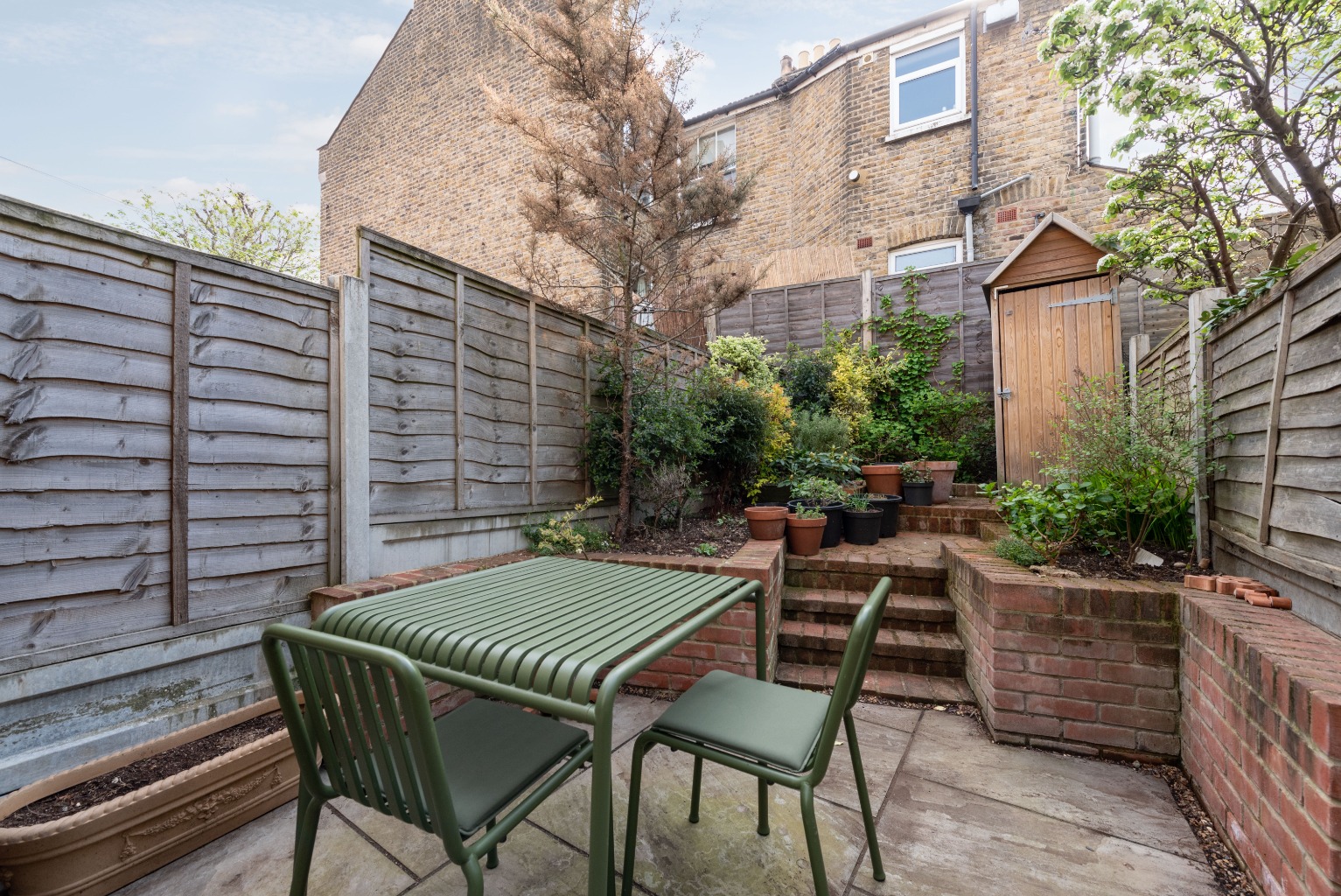 The next door along, also to your right, is bedroom one, an equally good size room – perfect for your cosy double bed and all your storage requirements, with the current owner using the space to house two double wardrobes and a large chest of drawers. The light eggshell blue walls and pale beige carpet offer a ready-to-move-into space, which could easily be personalised with your own artworks, bedding and perhaps a rug in your chosen colour accent. Tidy and bright, the room overlooks the rear garden and is a gorgeous spot to relax and unwind in after a busy day. Back in the hallway and to your left before you enter the kitchen/diner up ahead, you’ll note a very useful storage cupboard, which is large enough to accommodate for your cleaning equipment, spare bedding… well, whatever you need it for! The characteristic oak flooring continues through into the spacious kitchen/diner, offering a well-planned complement to the matching oak worktops. The natural wood elements are brightened and brought to life by the stylish cream base and wall units, and a large butler’s sink, while the pale blue walls add a little touch of colour to create a harmonious finish to this gorgeous space. The area by the window is the ideal spot for a dining table, and there’s room enough to entertain family or friends should you wish to show off your new flat to your favourite people. Straight ahead, across the kitchen from its hallway entrance, lies the second bedroom in this property, is filled with plenty of natural light and decorated in the same charming blue with engineered wooden floor. This would make a cosy kid’s room or nursery, a handy guest room a fantastic home office depending on your situation and lifestyle needs – or with a sofa bed and desk, you could make it a multi-purpose space. The next room, also leading from the kitchen, is your smart, modern bathroom – which you enter through your small side entrance lobby (more on that soon)… Well-designed and super-stylish, the three piece white suite of WC, sink and bath (with overhead shower and screen) works wonderfully with the grey cupboard and painted accents, black floor tiles and large subway tiles above the bath. A small but serviceable space that is clean, tidy and in great condition. Stepping out of the bathroom, take a left into the small lobby area separating it from the kitchen, and you’ll see a half-glazed external door which takes you to your 21ft private rear garden – the ideal retreat on finer days. Leading first into your side return, follow the path up and you’ll find yourself on a small patio area, perfect for a table and chairs for lunch al fresco or a sundowner on a summer’s evening. The garden then climbs up a level, with a couple of small sets of steps running alongside the shrubbery borders and leading to a useful shed at the very top of the space. Along with its inherent charm, this two bedroom flat comes with gas central heating and double glazing throughout, and the current owner will be leaving the fitted blinds in both the reception room and main bedroom.
