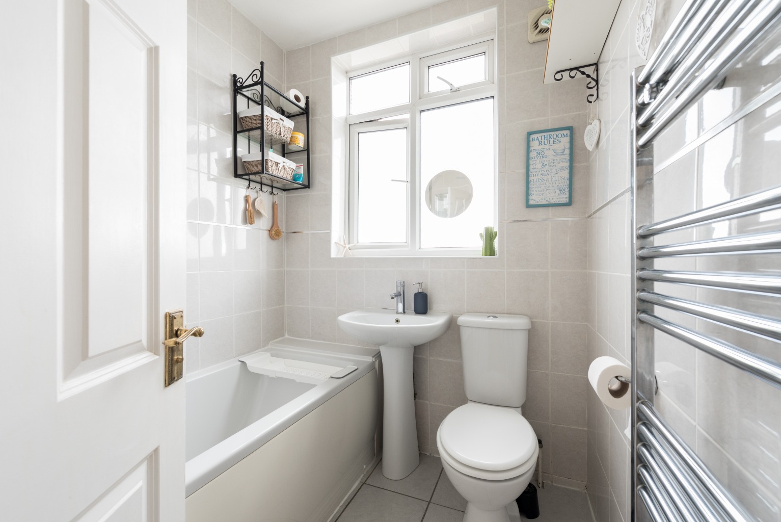 Up the L shaped staircase and directly to your left is the bathroom. It has a small frosted window but the modern all-white decor creates a great sense of space. It's fully tiled floor-to-ceiling and we all know what that means: easy to clean! There's a tall heated towel rail just as you walk in through the door and the bath/sink/WC suite is stylishly simple – overall a well designed, bright and high quality bathroom.
