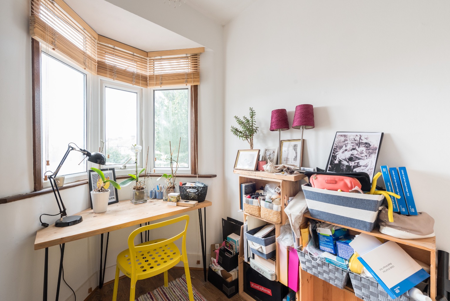 From here, we go to the final bedroom which is being used by the current owners as good sized office. On the other hand, it could also make an excellent playroom, guest room, kid's room or even a nursery. It has a small yet perfectly charming bay window and the splendid wooden flooring as seen through the rest of the property.