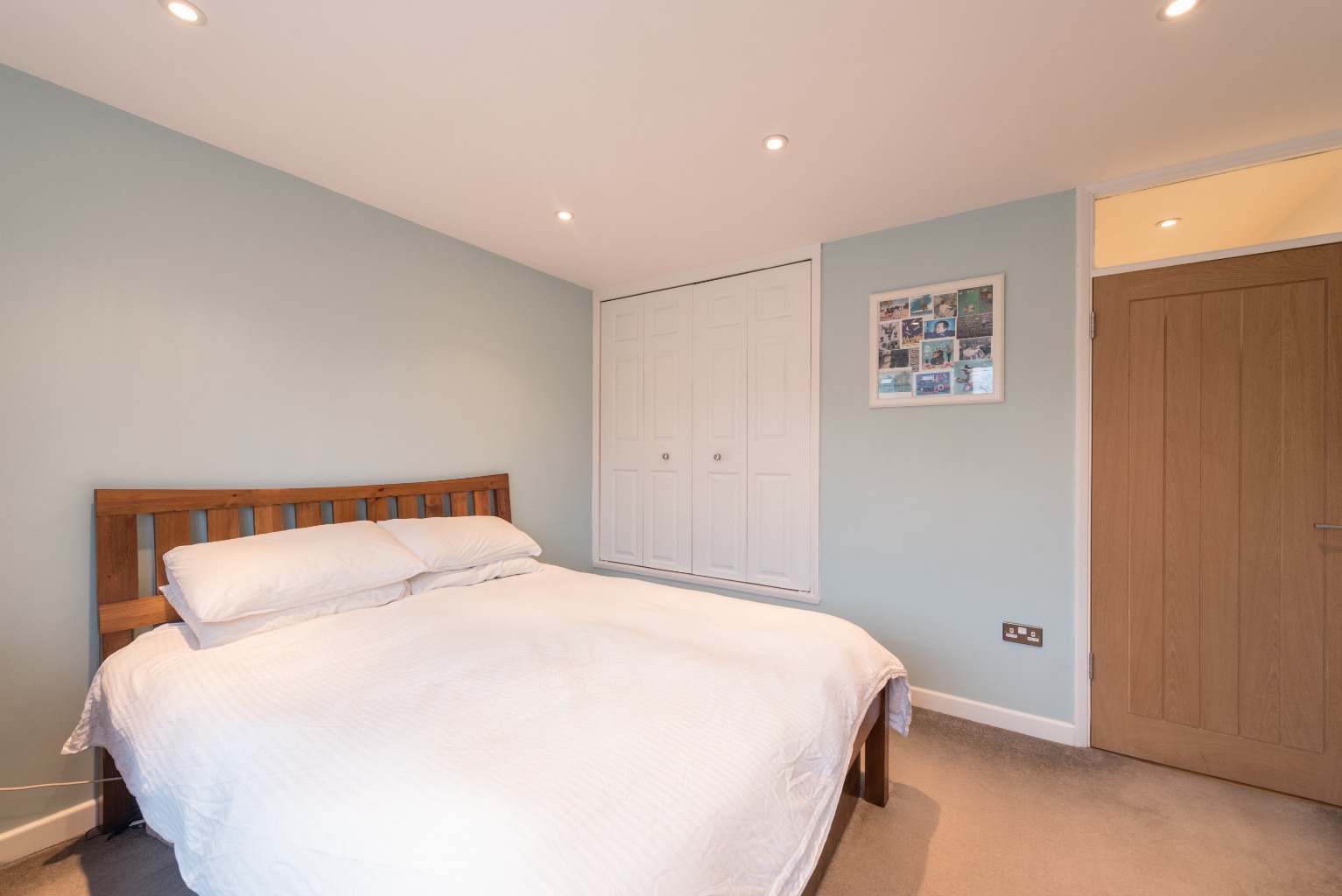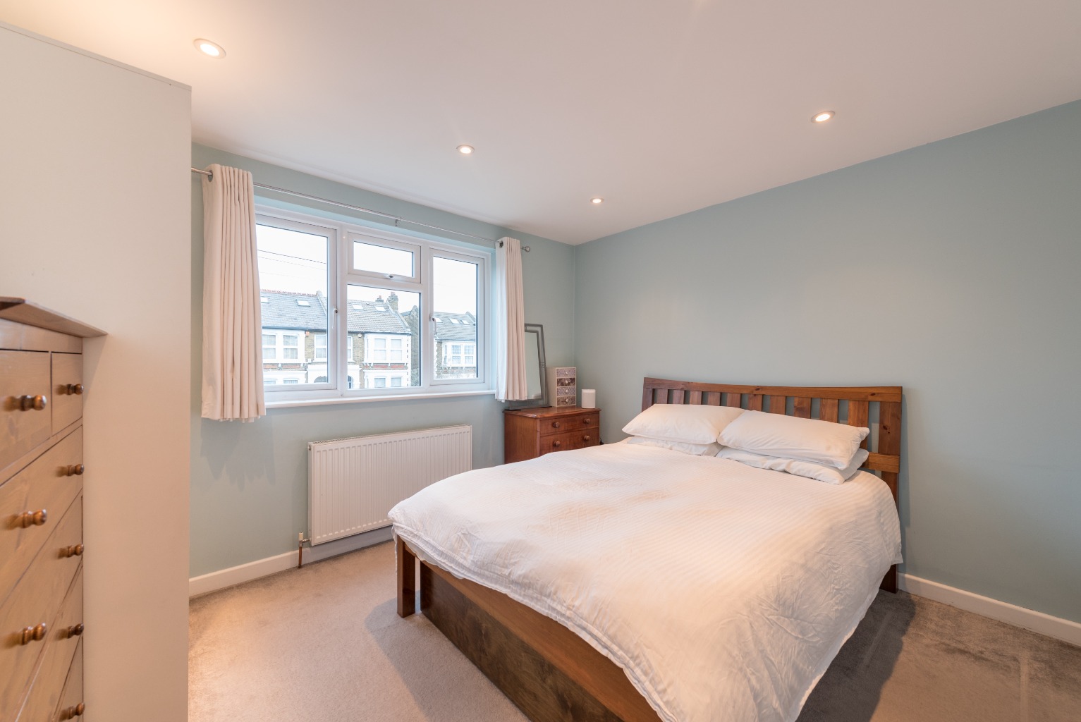 The final room in the apartment is the spacious master bedroom. The large fitted wardrobe on the inner wall leaves plenty of extra floor space for a King size bed, bedside units, additional storage and a dressing table. It's painted a subtle mint green and carpeted with the same beige as the smaller bedroom, creating a lovely relaxing vibe. The large window gives the room an extra sense of space and it's easy to imagine this as your perfect restful sanctuary.