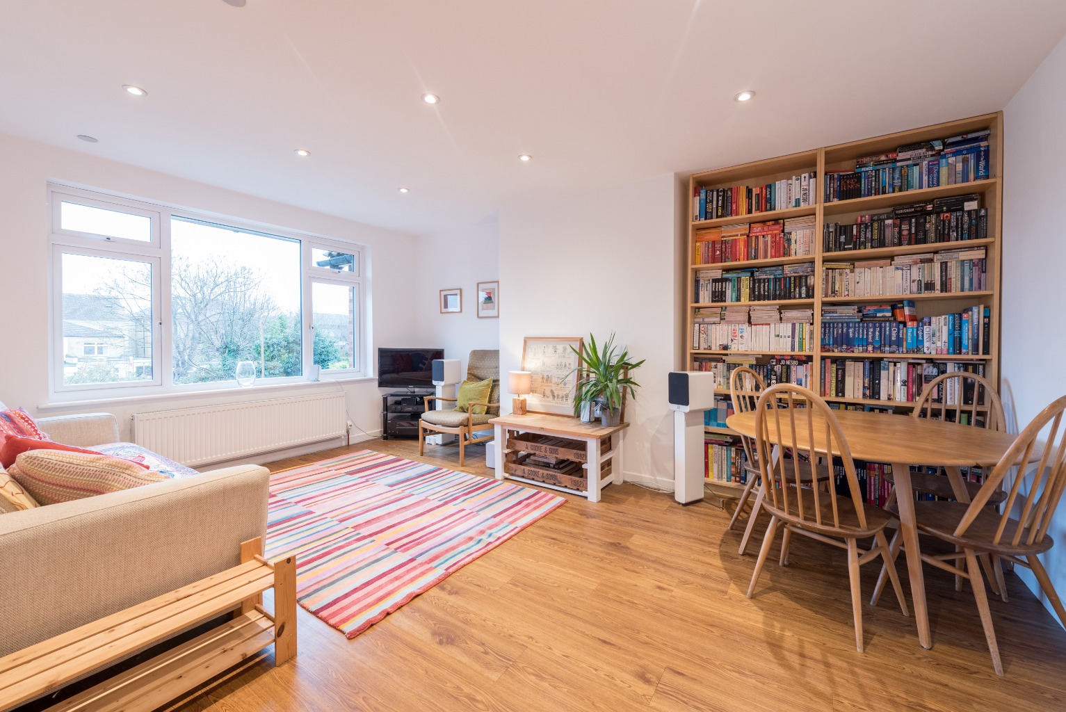 Directly ahead of you and on the right, the first door you'll find is the large reception area has fitted Luxury Vinyl flooring which flows through wonderfully from the landing area. The large rear-aspect window overlooking the garden provides plenty of light due to its South facing aspect, adding to the great sense of space here. The room is large enough to act as a dining/living area, with the potential to accommodate a dining table should you wish to do so. This still leaves room for a large sofa or suite, coffee table, TV unit and display cabinets. The current occupiers have fitted bookcases in the large alcove recess, which is perfect for storage or displaying ornaments, and the ceiling is fitted with dimmable spotlights for that perfect ambience. The room is decorated in a light neutral tone, ready to move right into with the opportunity to add some colour accents to personalise the space to your taste.