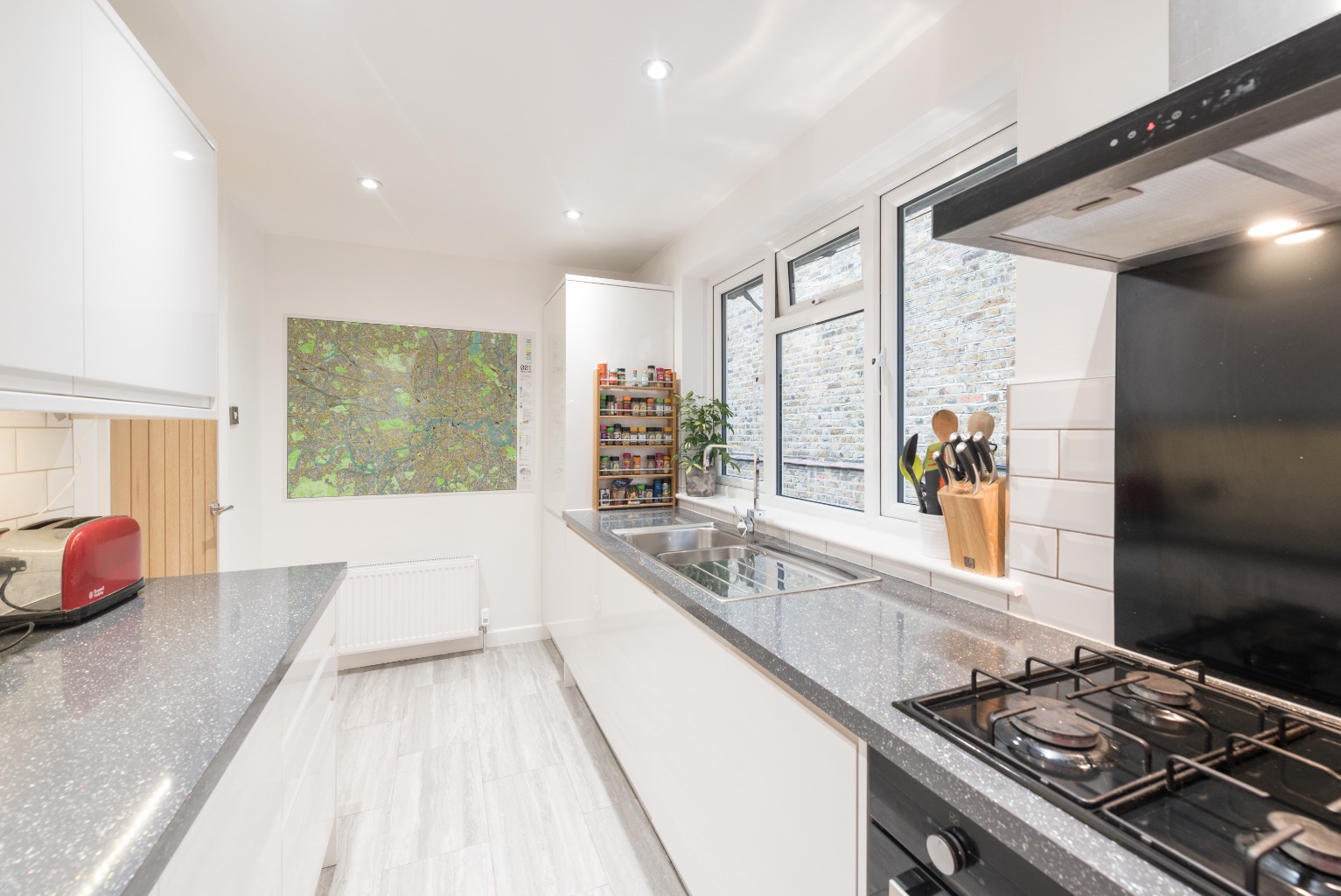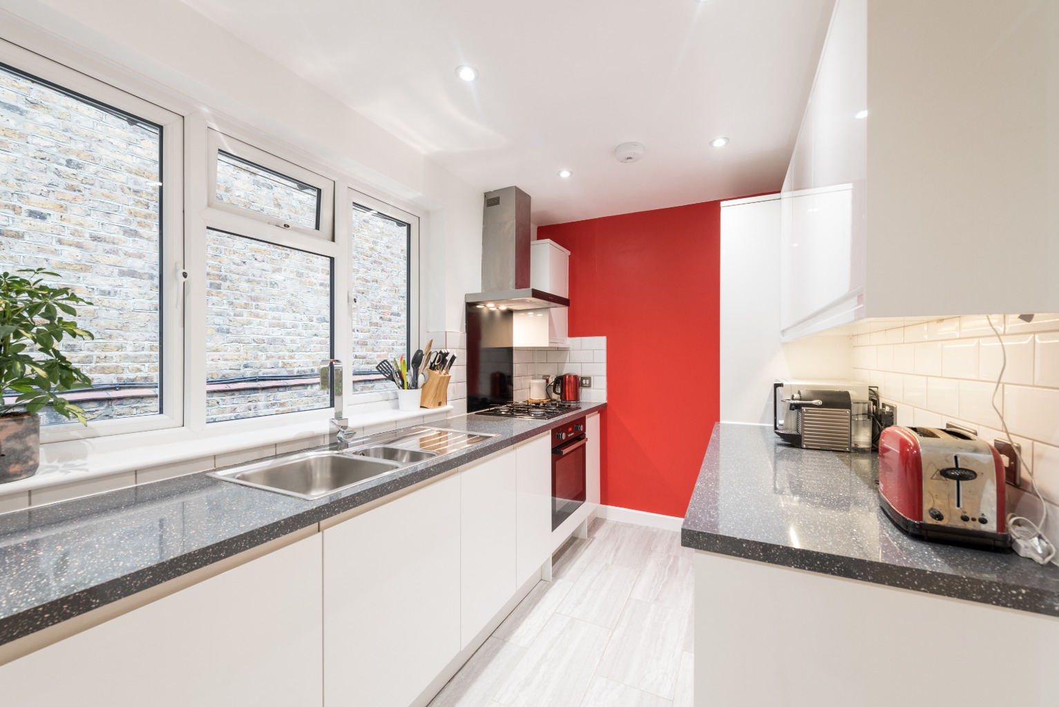 Next up, let's head into the kitchen, which has been recently fitted in a smart, contemporary style with clean lines and a vibrant splash of colour. The worktops are a black granite look with a bright sparkle to add some glamour, and there's plenty of storage thanks to a selection of sleek white fitted wall and base units. The splash-back and around the worktops is finished with white subway-style tiling and there's a fitted hob and oven with an extractor hood. All the appliances are neatly hidden by the modern looking cupboard doors, with integrated appliances such as dishwasher, washing machine and fridge freezer. The flooring is tiled, with a dusky grey finish similar to the Bathroom, and the end wall is painted with a wonderful block of scarlet red which gives the understated monochrome look a fabulous 'pop'. The Kitchen has also had a brand new boiler installed this month, which includes a 10 year warranty.